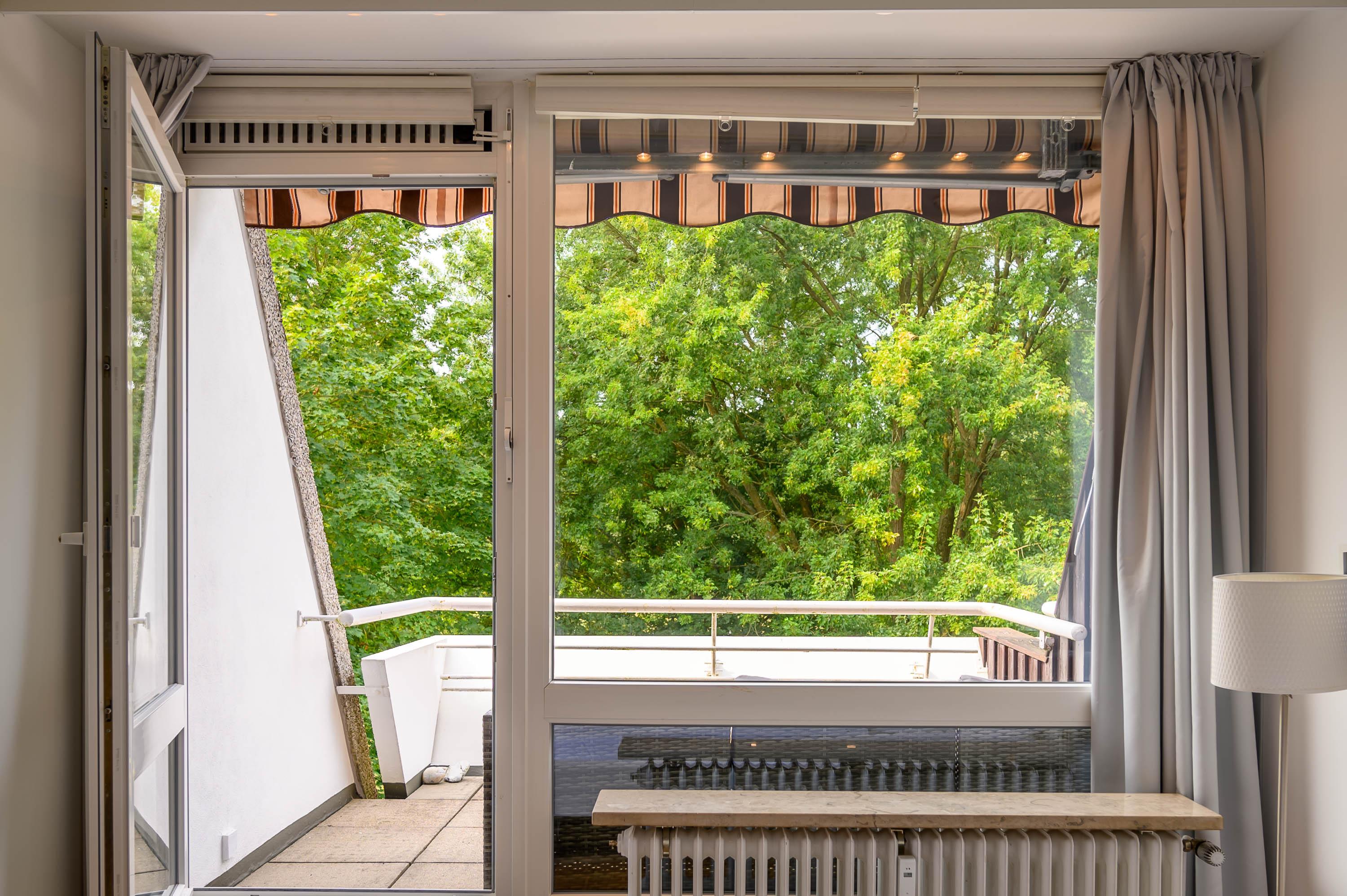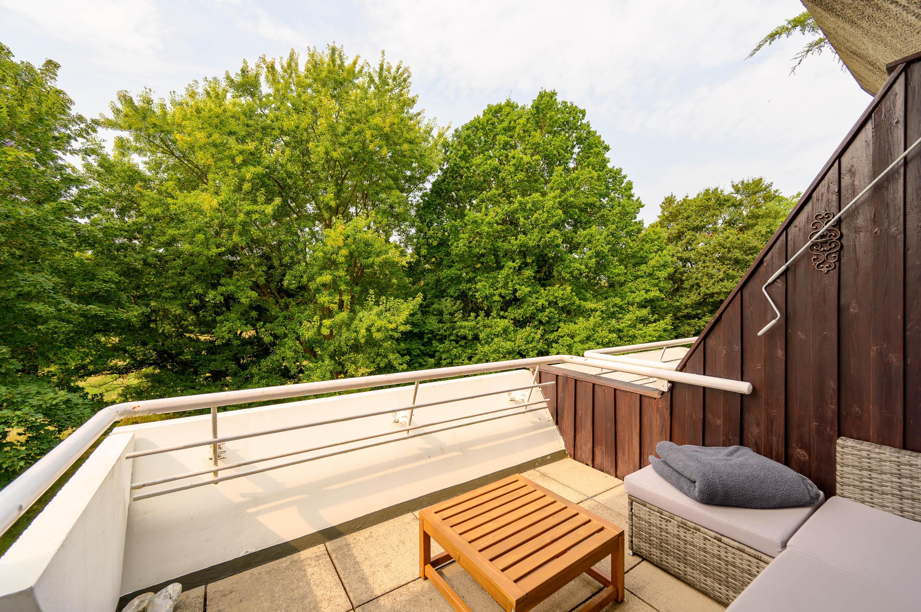 Der 6 qm² große Balkon, vom Wohnbereich aus zu betreten, und verfügt über eine Loungeecke mit einer Markise. Genießen Sie den beruhigen Blick ins Grün und durch die Süd-West-Ausrichtung bis in die Abendstunden die Sonne auf dem Balkon!
