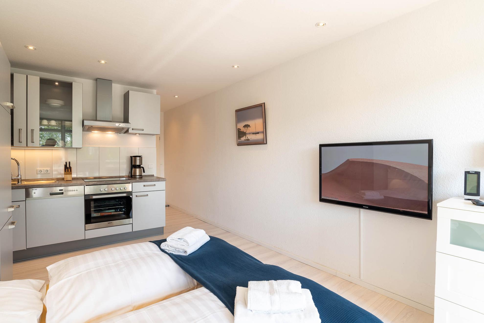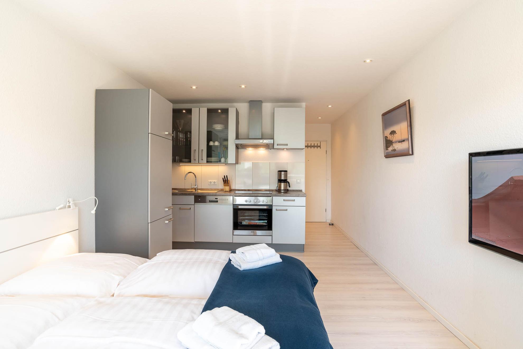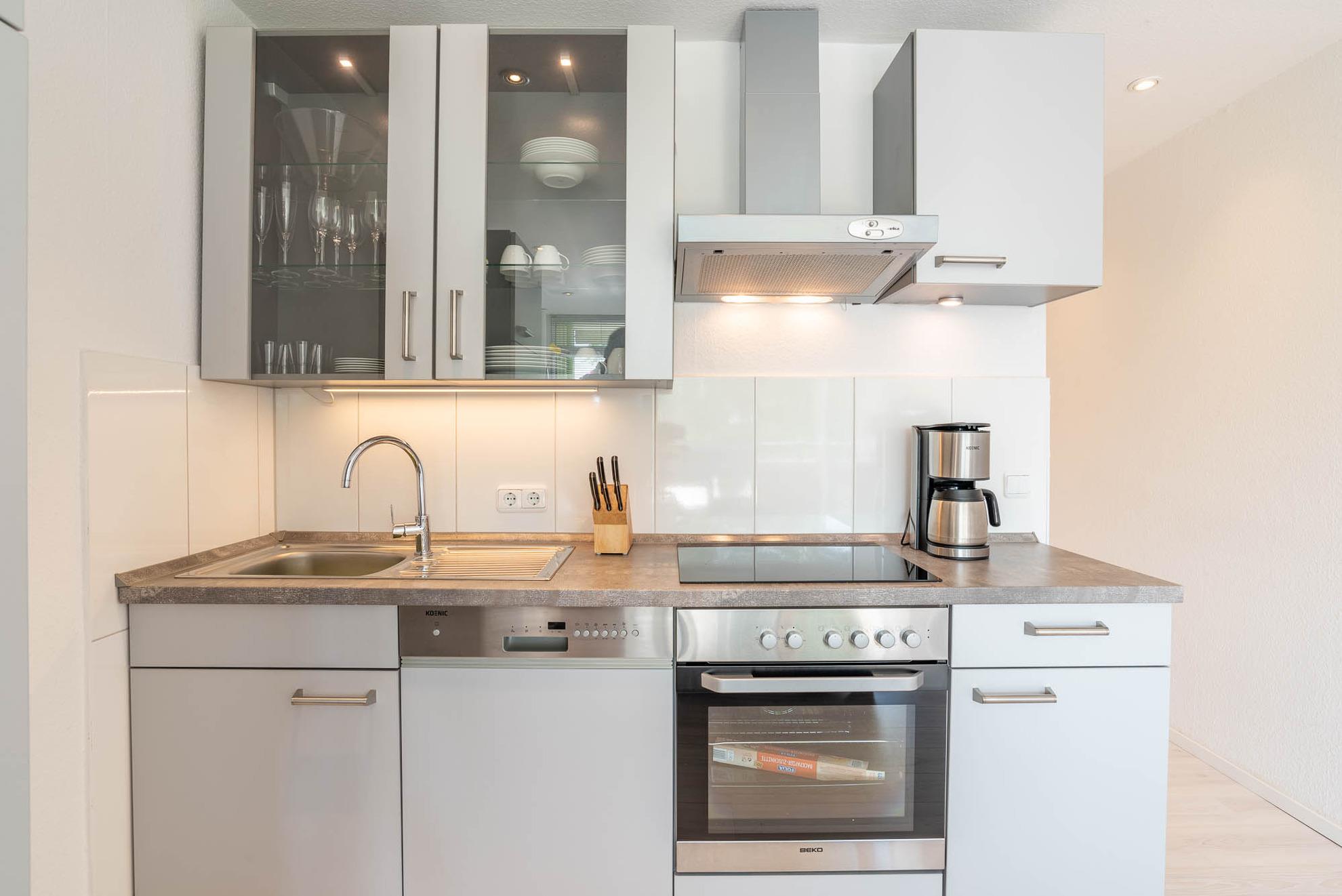 Die angrenzende offene Einbauküche besticht mit ihrer guten Ausstattung: Ein Geschirrspüler, ein Kühlschrank, ein Cerankochfeld mit vier Kochfeldern, sowie ein Backofen findet sich in der gepflegten Küchenzeile. Hinzu kommen eine Kaffeemaschine, Toaster, Wasser-, und Eierkocher. Einem gemütlichen Frühstück kann nichts im Wege stehen. Hierfür steht im Appartment ein kleiner Tisch mit zwei Stühlen. Auch der Balkon ist mit Gartenmöbeln ausgerüstet.