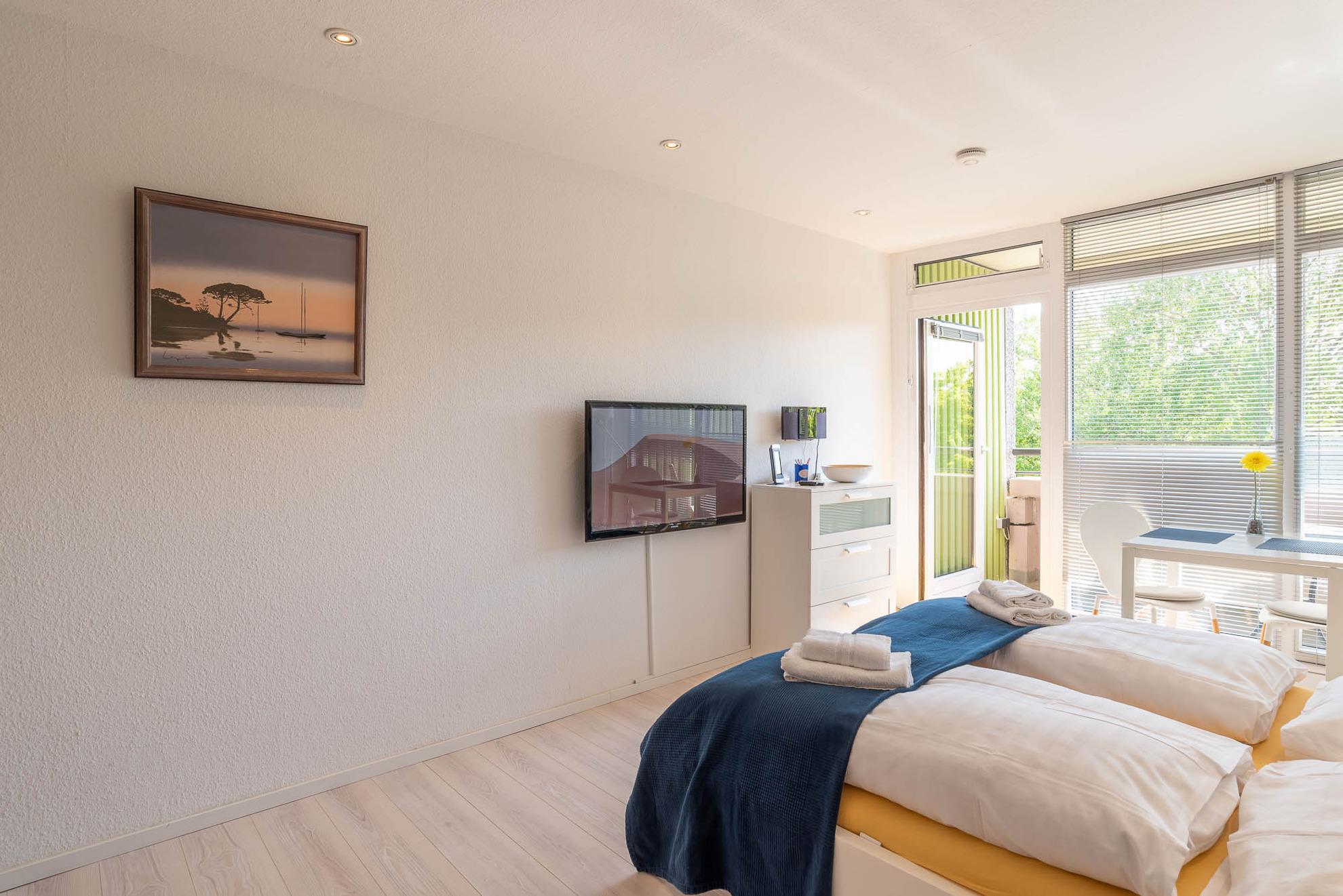Im freundlichen Appartment befindet sich ein bequemes Doppelbett (Liegefläche von 160x200 cm). An der Wand gegenüber ist ein LCD- Fernseher angebracht.