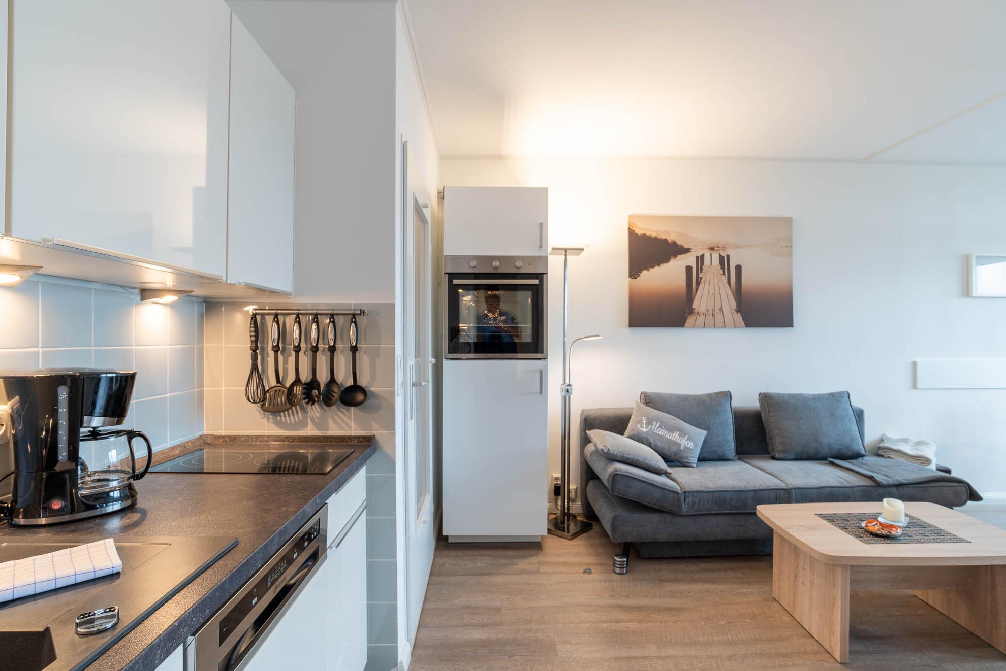 Die kleine Pantry-Küche bietet für 3 Personen eine funktionale Grundausstattung. So befindet sich neben Cerankochfeld, Backofen auf halber Höhe, Kaffeemaschine, Toaster und Wasserkocher auch eine Geschirrspülmaschine in der Küchenzeile.