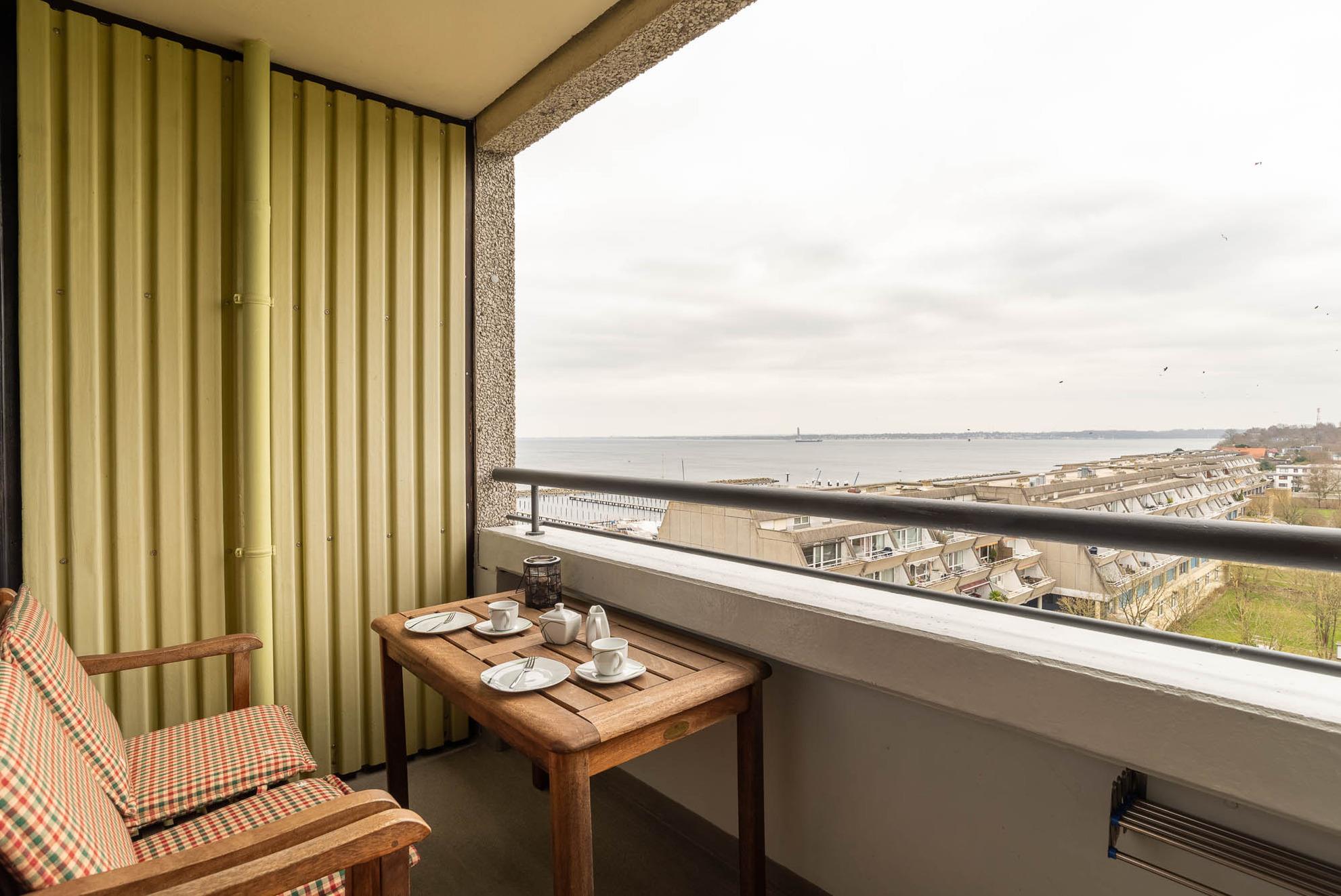 Ein Highlight der Wohnung ist der Balkon mit dem traumhaften Blick über den gesamten Schilkseer Yachthafen und der Kieler Förde. Dadurch, dass sich das Appartment im 9. Stockwerk befindet, können Sie von hier aus alle Schiffsbewegungen überblicken und verfolgen. Eine Gartengarnitur aus Holz lädt hier zum Verweilen ein.