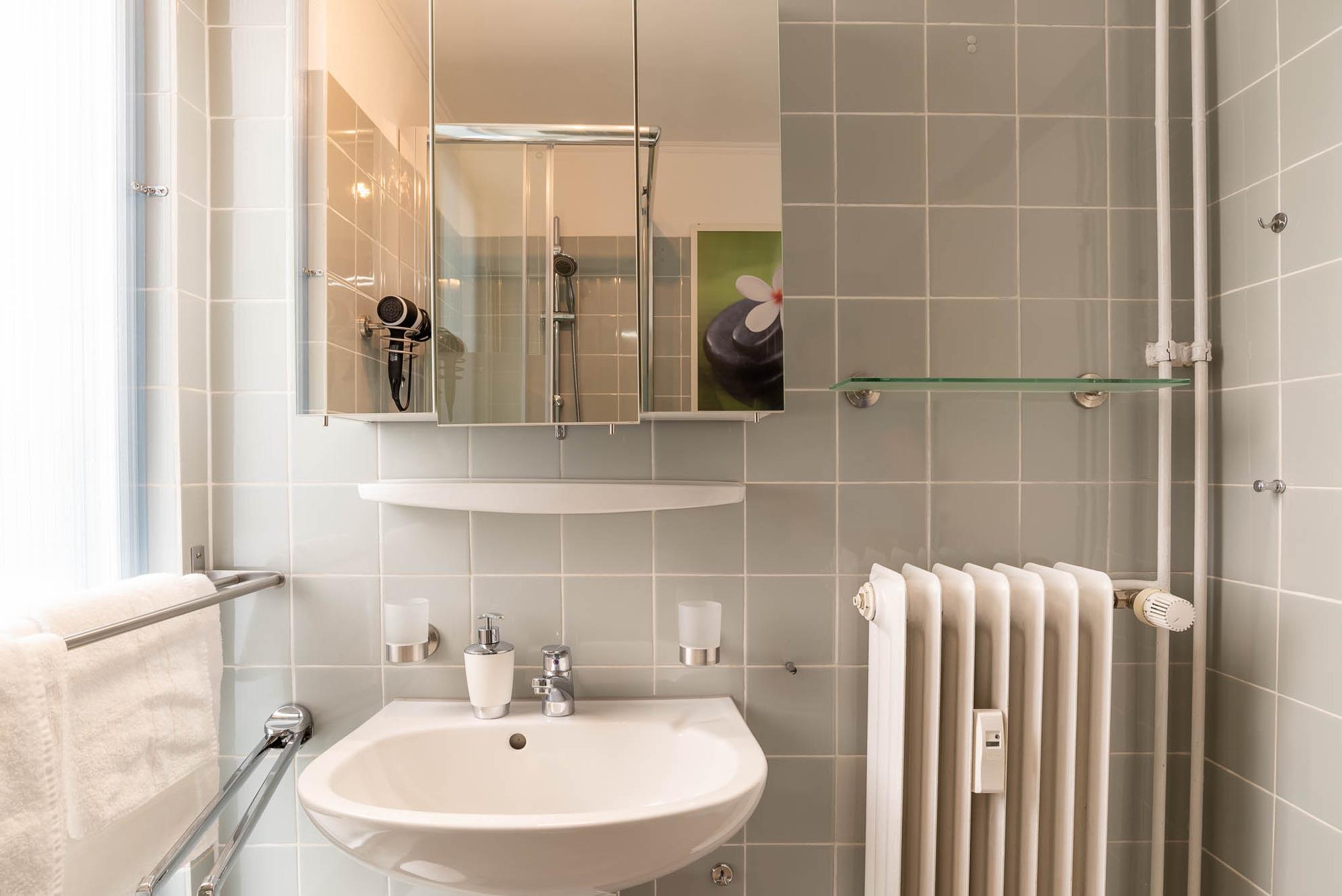 Das Duschbad ist hell gefliest und hat ein Fenster. Der kleine Flur mit Schrank und Flurgarderobe, mit ausreichend Ablagemöglichkeiten während Ihres Aufenthaltes, runden die 47 qm große Wohnung ab.
