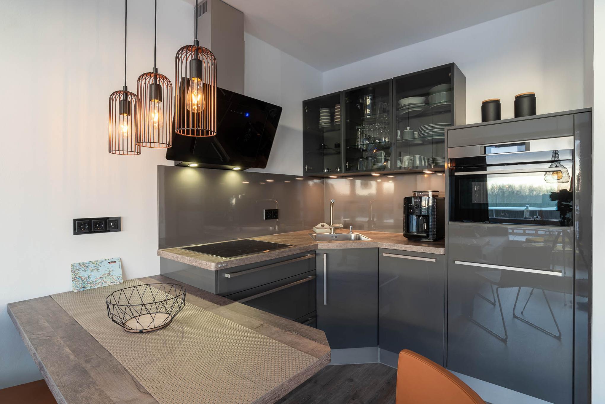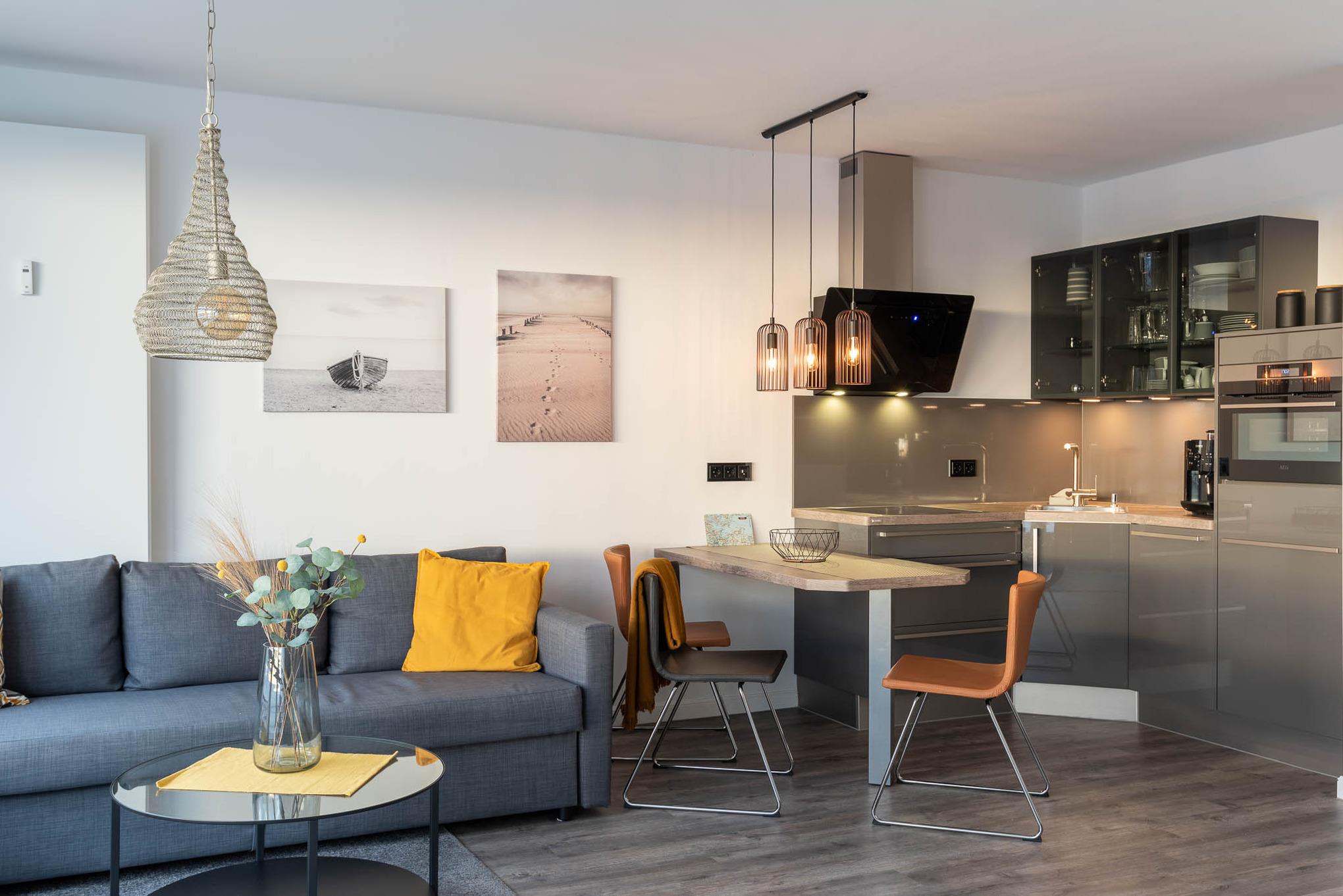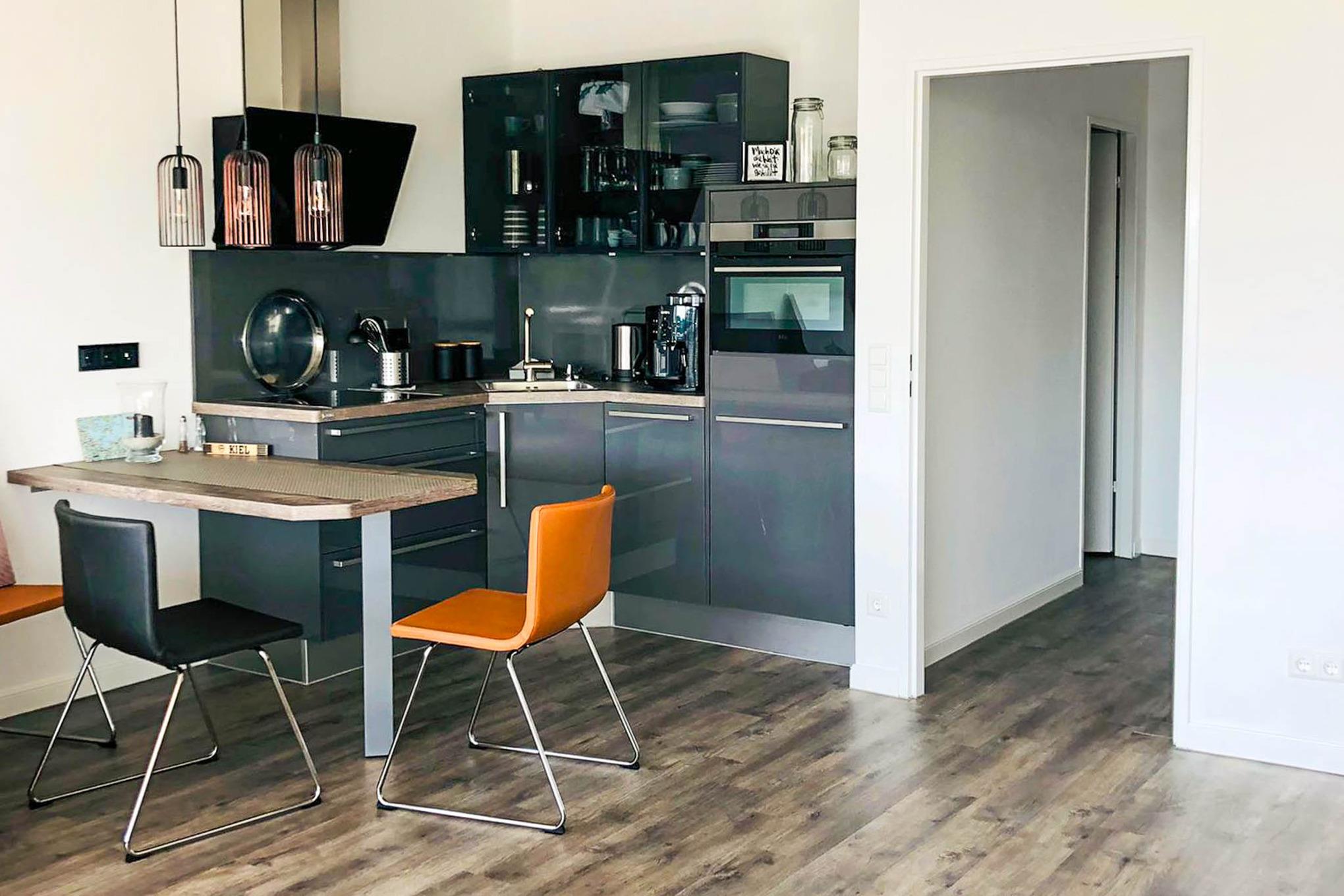 Mit einem Cerankochfeld, Kühlschrank, Backofen, Wasserkocher und einer Kaffeevollautomat ist die offene Pantry-Küche eingerichtet und ausgestattet. Auch eine Geschirrspülmaschine steht Ihnen zur Verfügung. Am angrenzenden Esstisch kann man gemütlich zu dritt sitzen und essen.