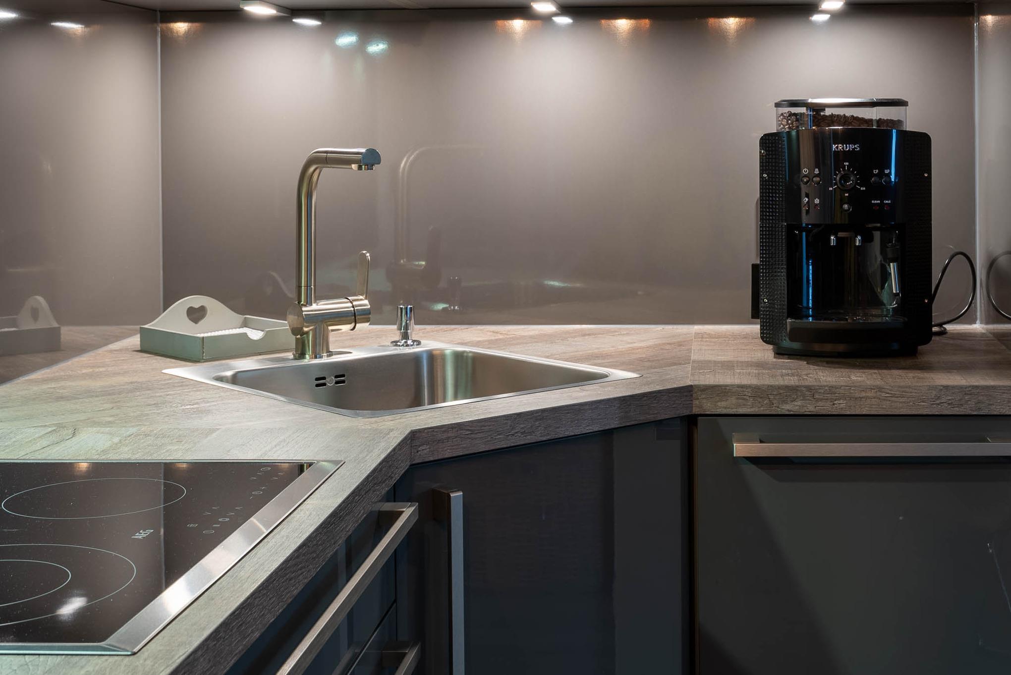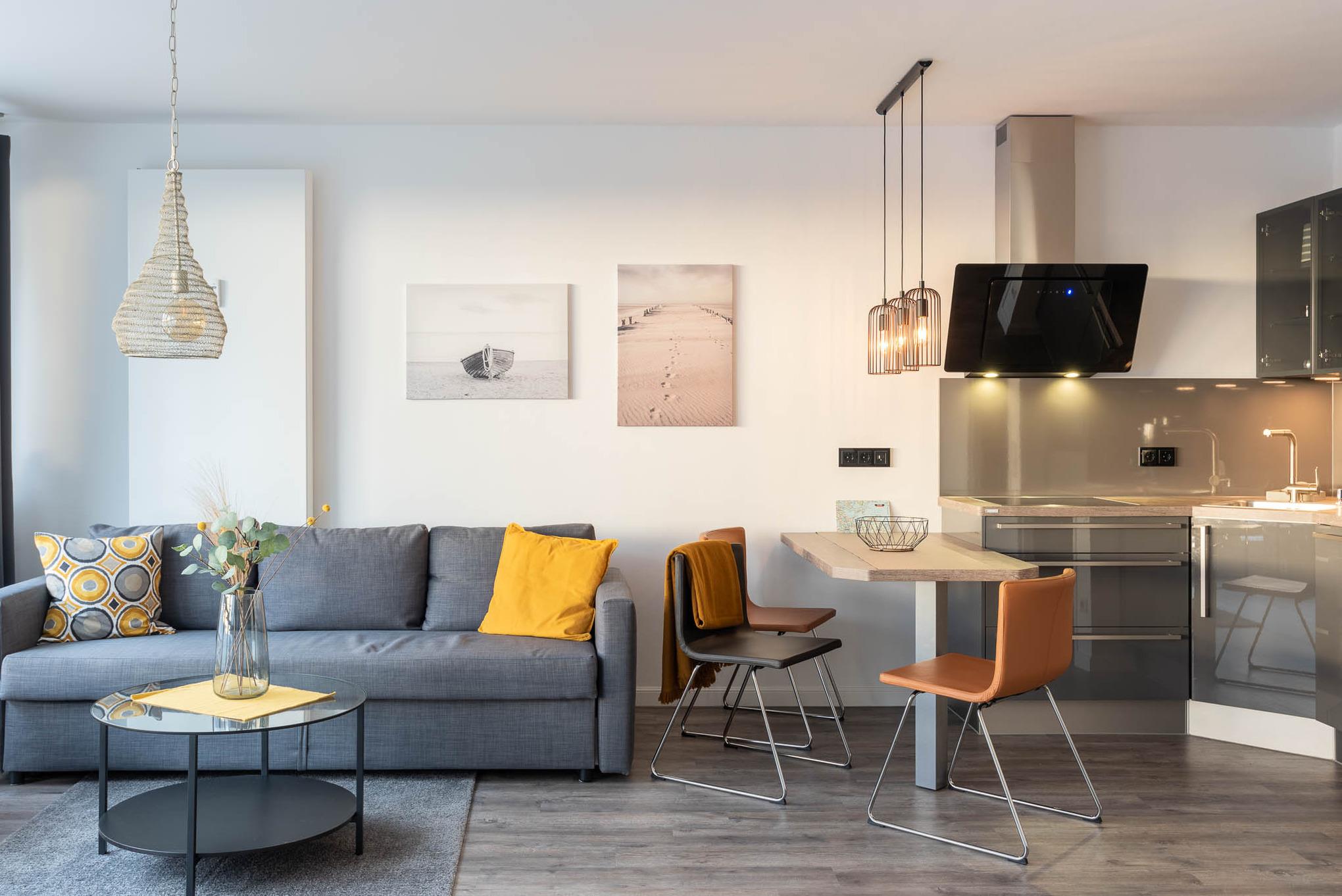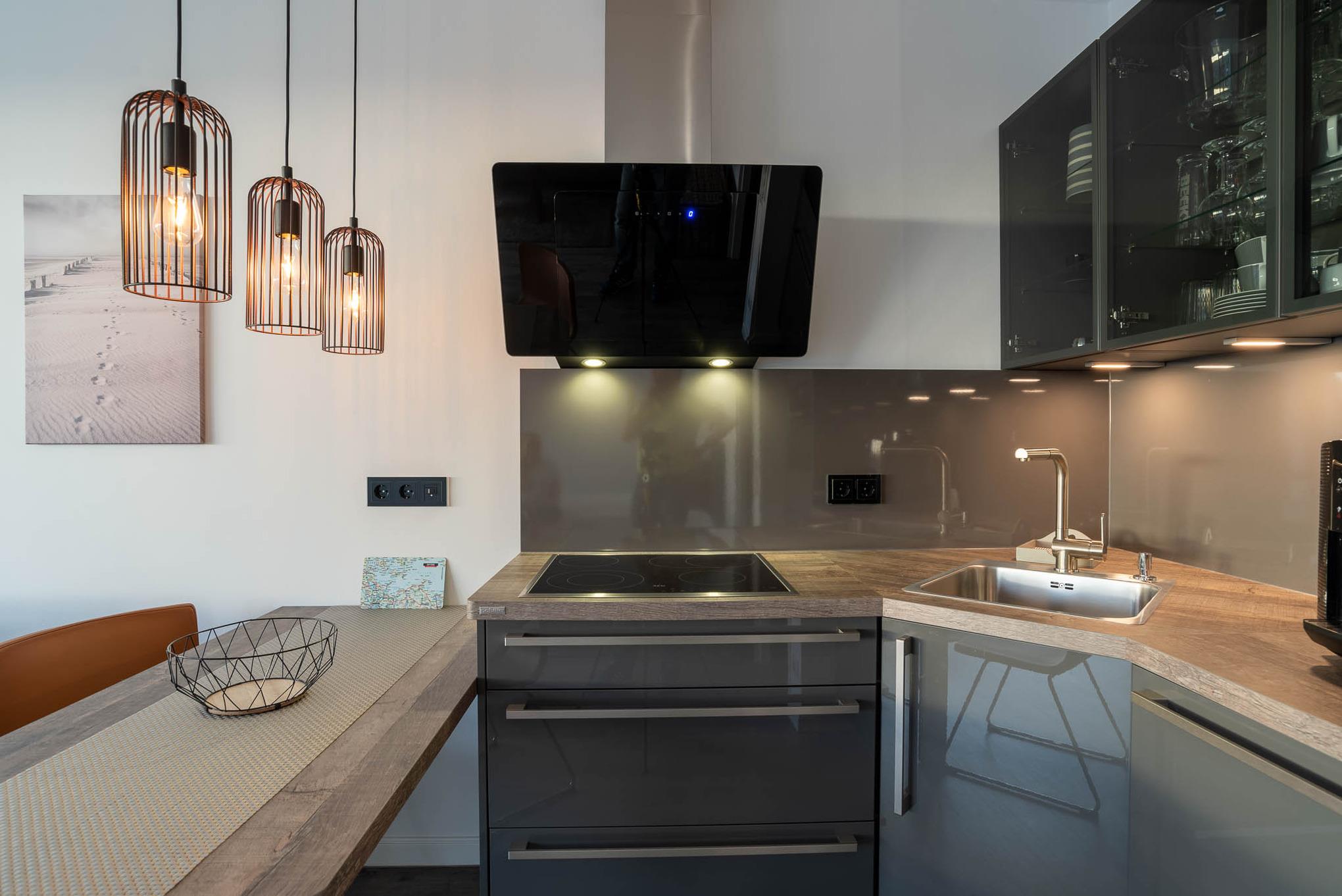 Mit einem Cerankochfeld, Kühlschrank, Backofen, Wasserkocher und einer Kaffeevollautomat ist die offene Pantry-Küche eingerichtet und ausgestattet. Auch eine Geschirrspülmaschine steht Ihnen zur Verfügung. Am angrenzenden Esstisch kann man gemütlich zu dritt sitzen und essen.