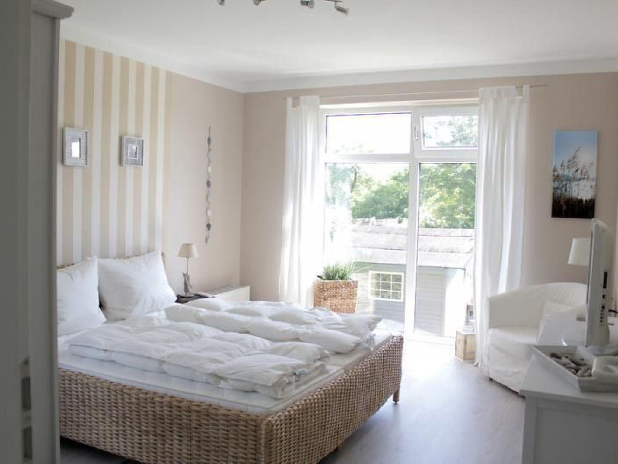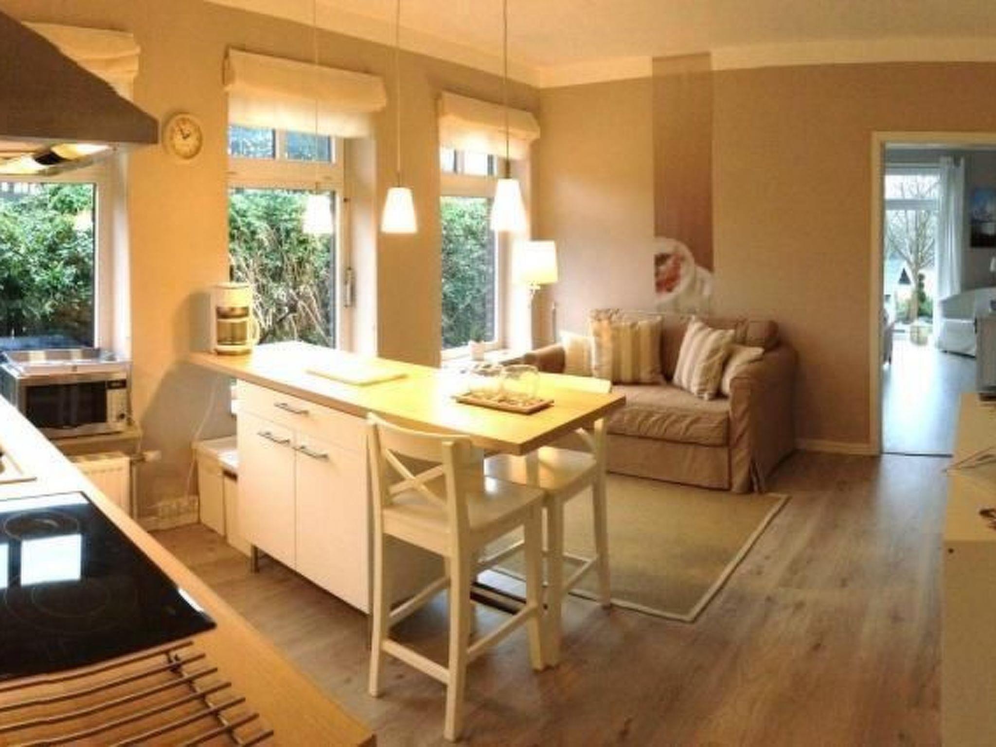 The holiday apartment renovated in 2012 with a maritime decor in the Kiel district of Wellsee measures 32m² and has a bedroom with a double bed. Owing to the floor-to-ceiling windows, you can enjoy a view over the garden landscape, so you have the feeling of being in direct contact with nature. The second room has a kitchen unit and a counter with two chairs, where you can dine or work. The bathroom has a modern design and is fitted with a shower 120cm wide. The apartment is on the ground floor of a new building from the year 1994, adjoined to a historical building from the year 1880. The six heritage-protected linden trees on site round off the harmonious appearance. The apartment offers free broadband wireless Internet access. The kitchen is equipped with a ceramic hob, convection oven with an infrared grill, fridge, dishwasher, coffee machine, microwave, toaster and washing machine. The bedroom is furnished with a double bed 180cm wide. The living room provides a big sofa bed for two people, a dining corner with four chairs, a 37“ TFT TV with a digital satellite receiver and a DVD player, and a stereo system with a CD player, USB port and Line-In (Aux). The bathroom includes a hairdryer. An iron, ironing board and cot are available.