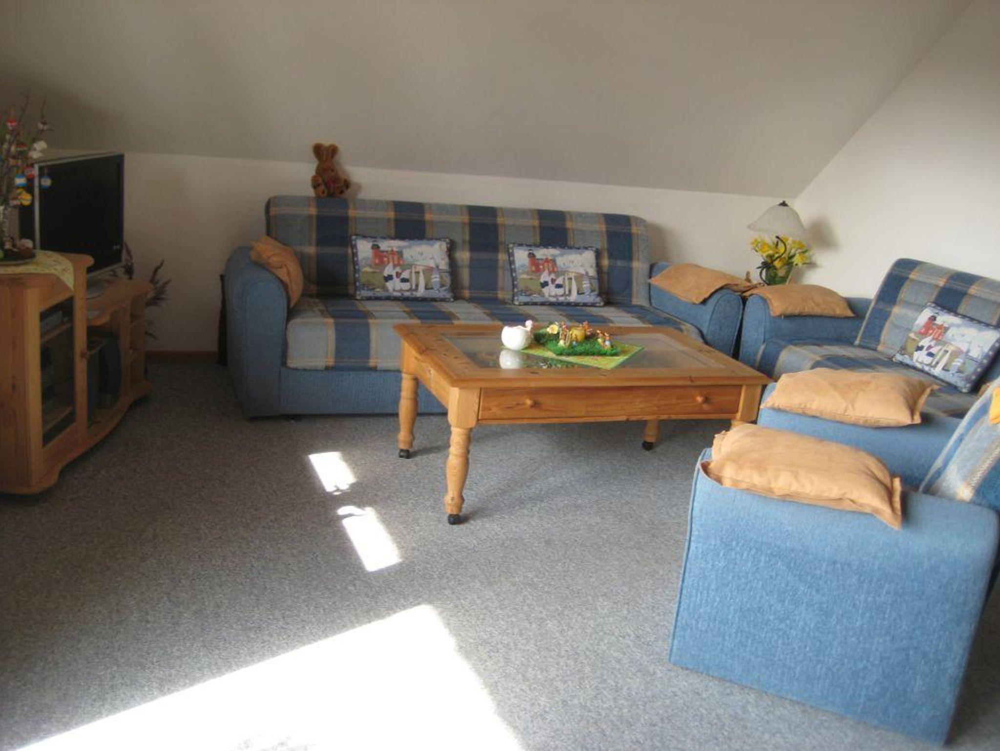 Die Wohnung verfügt über einen Wohn-/Essraum mit Couchgarnitur, Stereoanlage, DVD-Player und SAT-TV sowie einem Esstisch und vier Stühle.