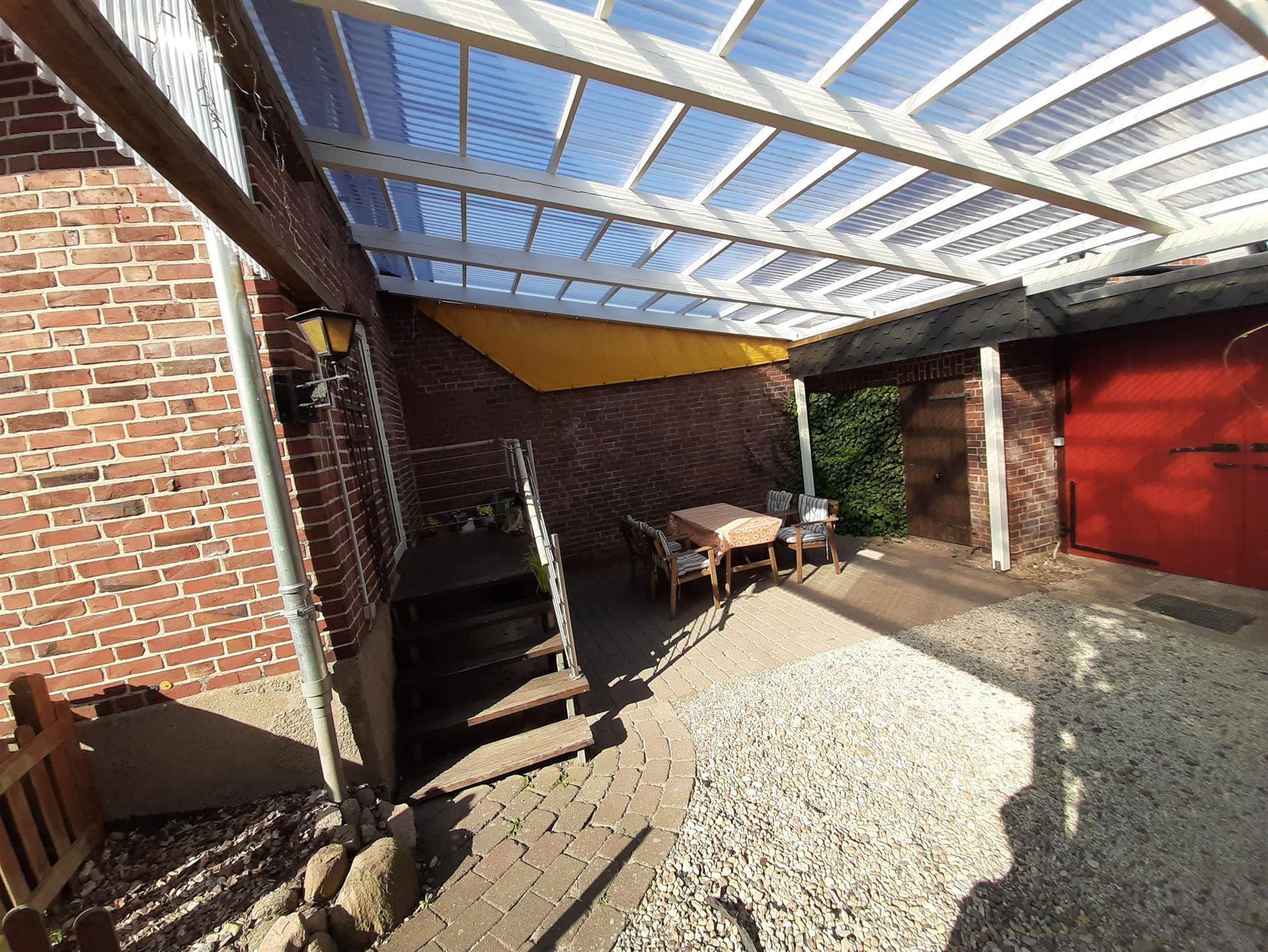 Die überdachte mit Gartenmöbeln komplett ausgestattetet Terrasse erreichen Sie über einen direkten Zugang aus der Küche. Lassen Sie den Abend dort bei einem schönen Glas Wein ausklingen.