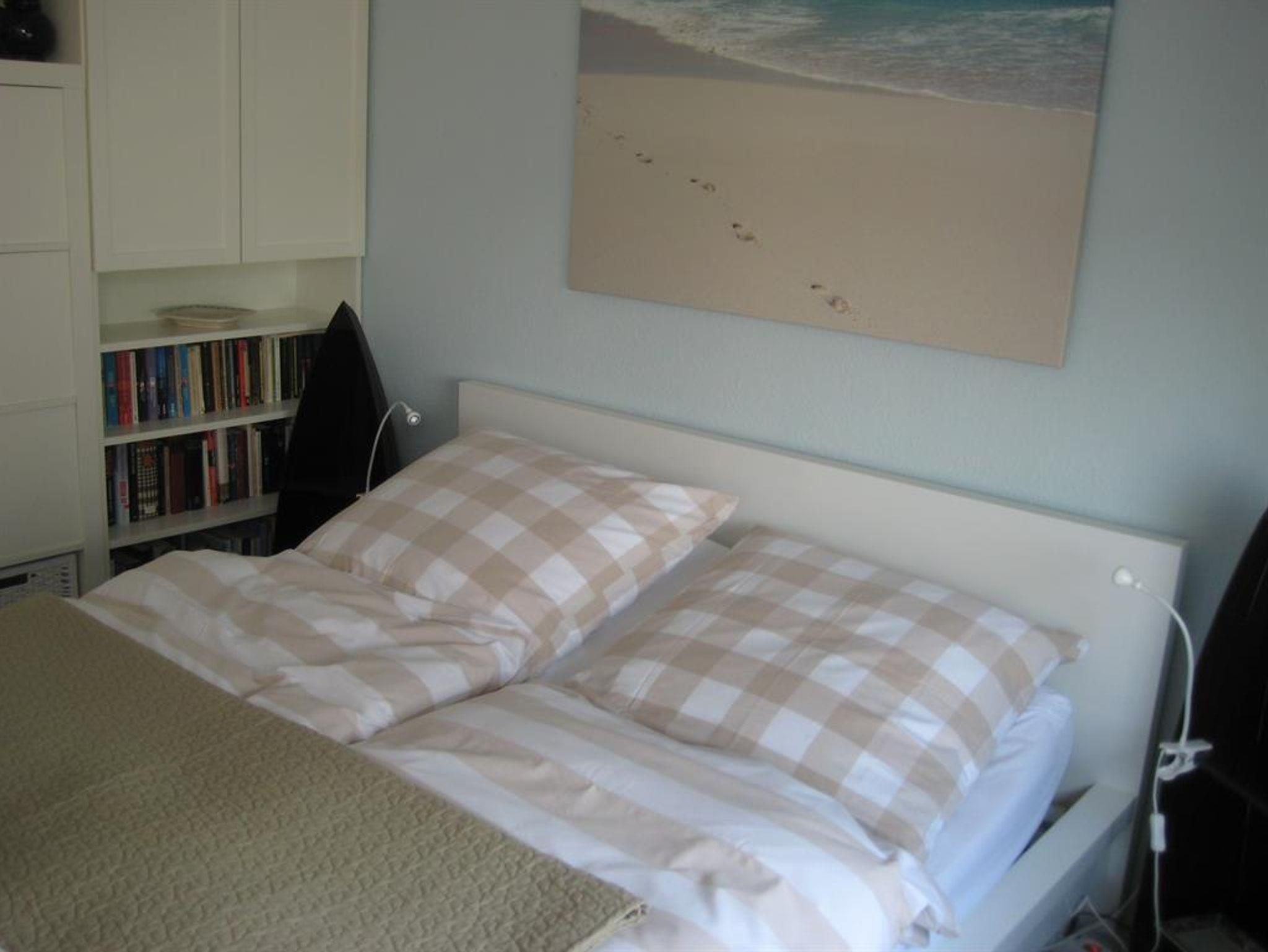 Das Apartment ist schön hell eingerichtet. Vom Flur mit Duschbad und Kammer kommen Sie in einen großen, ab mittags sonnigen Raum mit Relax-Couch voller frischer Kissen sowie einem beweglichen Flachbildschirm (HD-TV, Kopfhörer), mit DVD- und CD-Spieler und einem Schreibtisch (mit WLAN-Router).