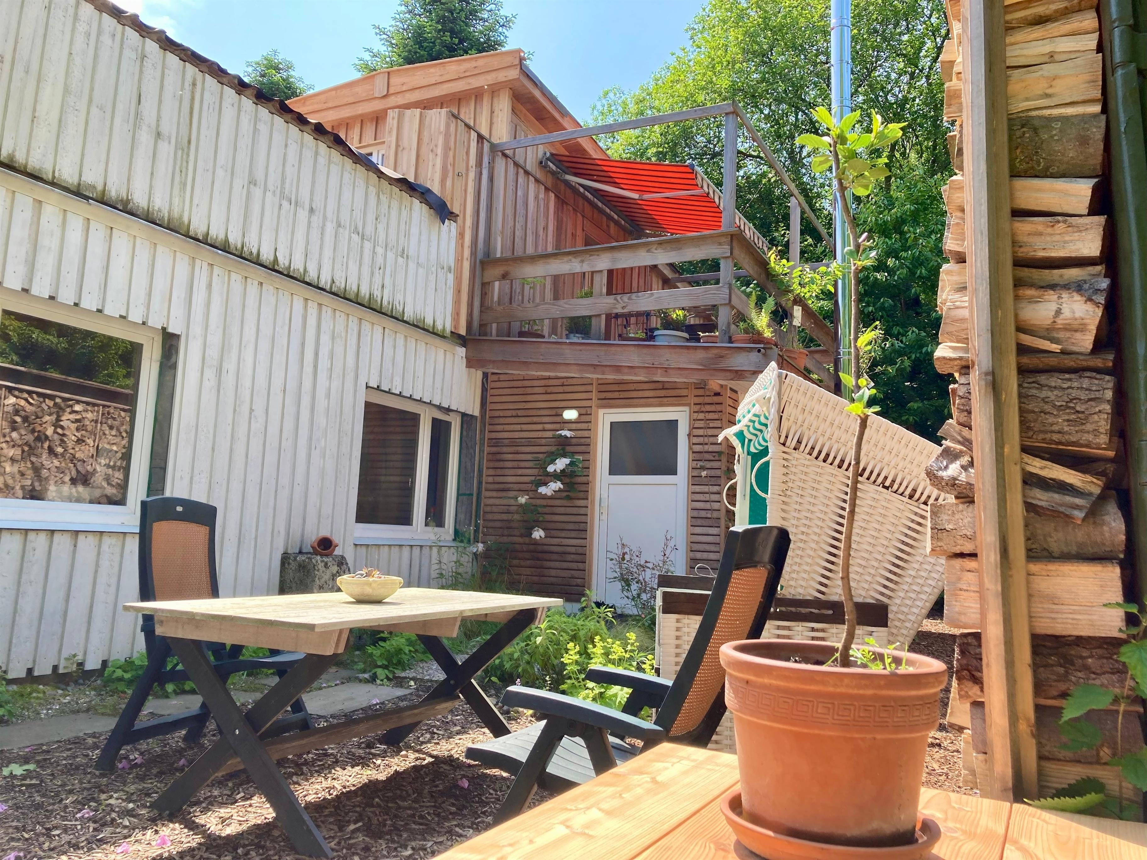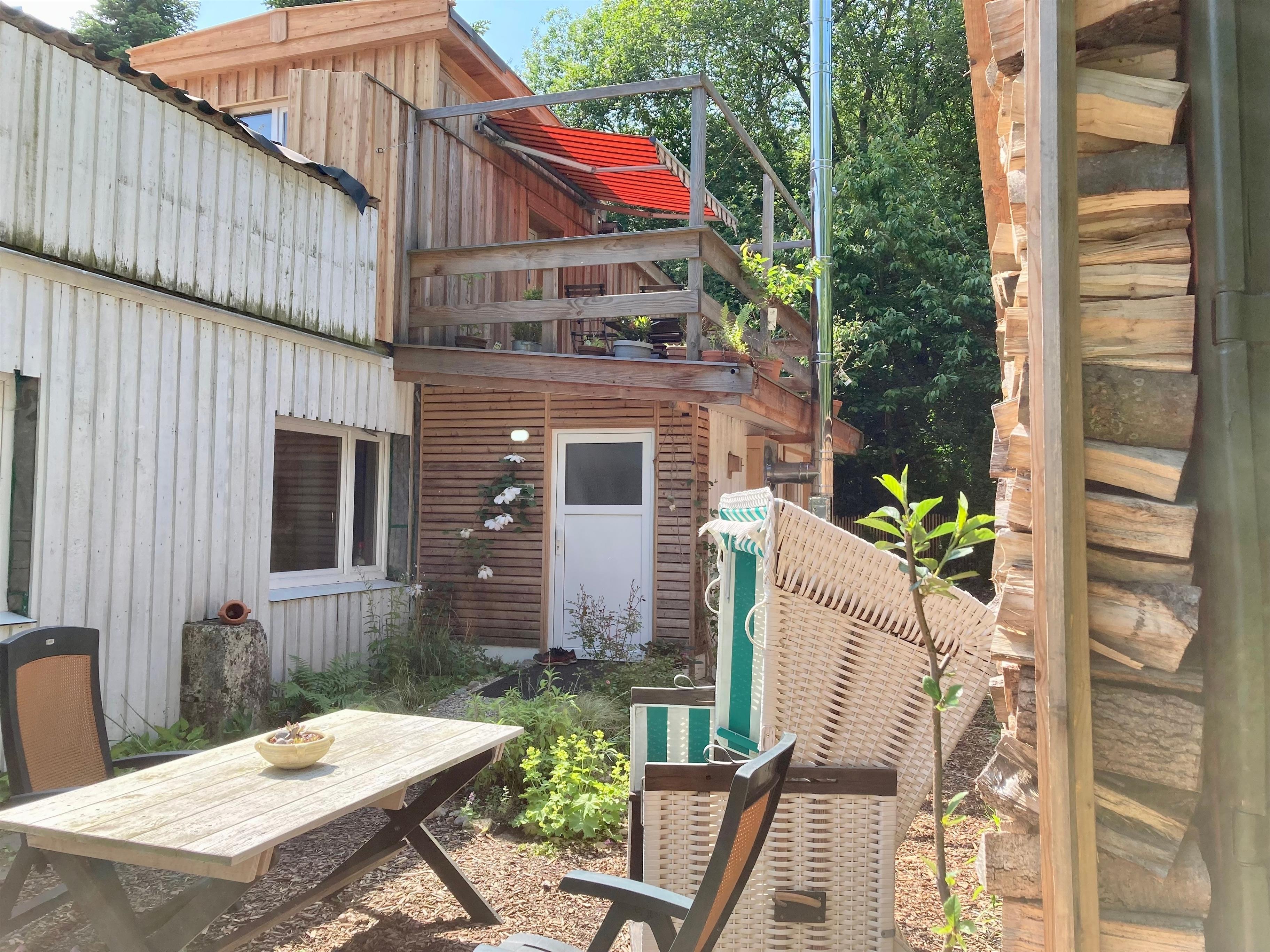 Fewo in Altbauvilla auf dem Gutsresthof Neumühlen Kiel/Schönkirchen ,4 Schlafpl, Duschbad/Badewanne, kleine Dachterrasse, großer Garten mit Gartenterrasse mit Grill, Strandkorb, Liegestühle, Rasenfläche.