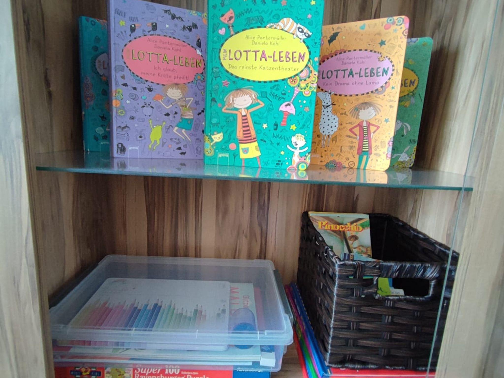 • Flachbildfernseher, DVD-Player, DVDs, Spiele und Bücher.