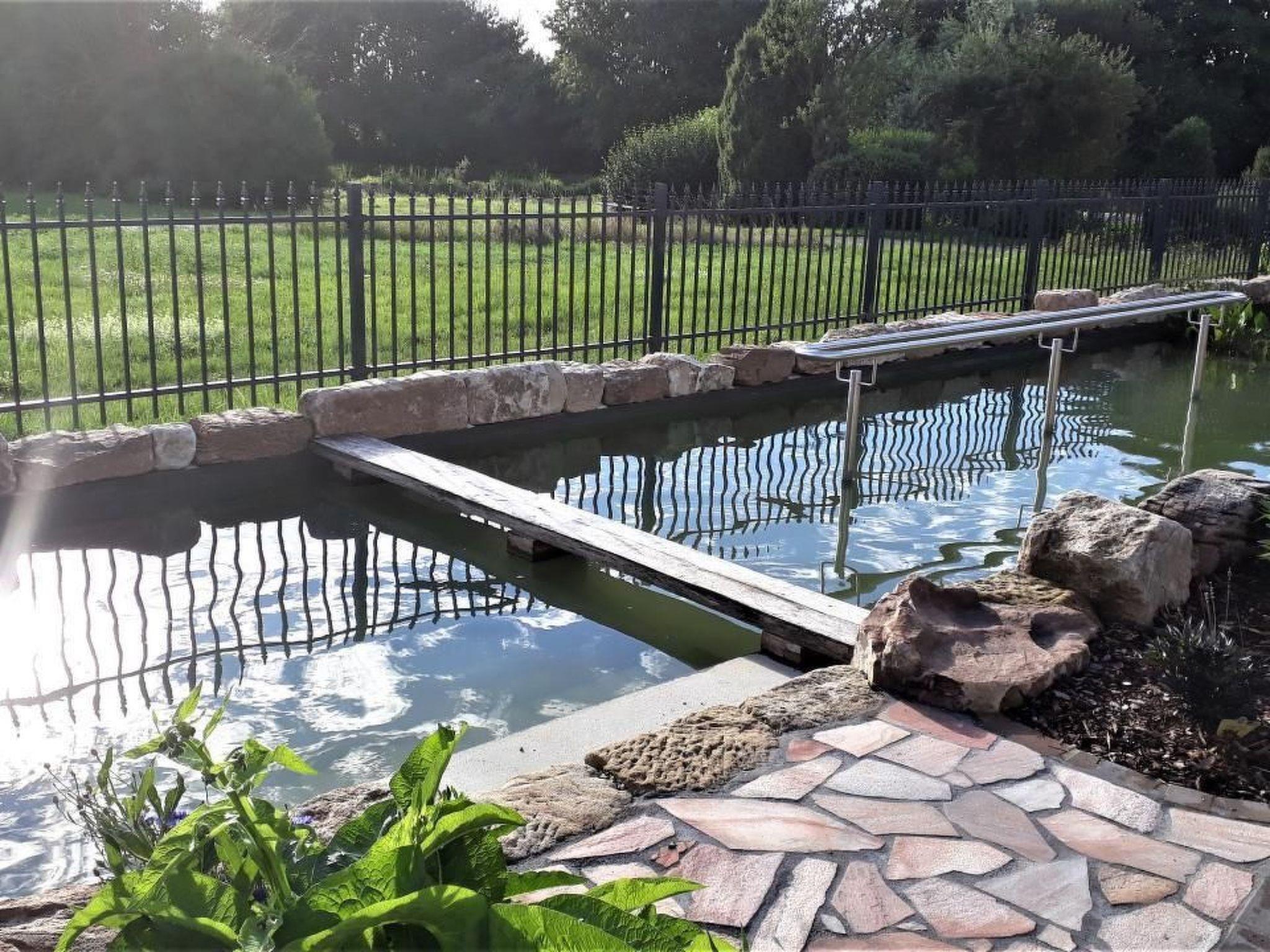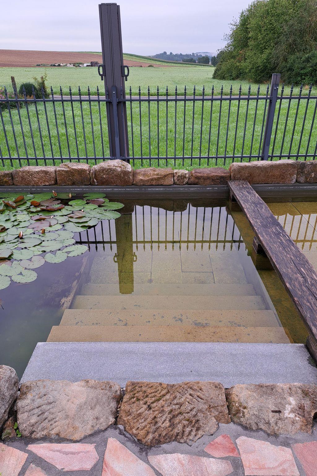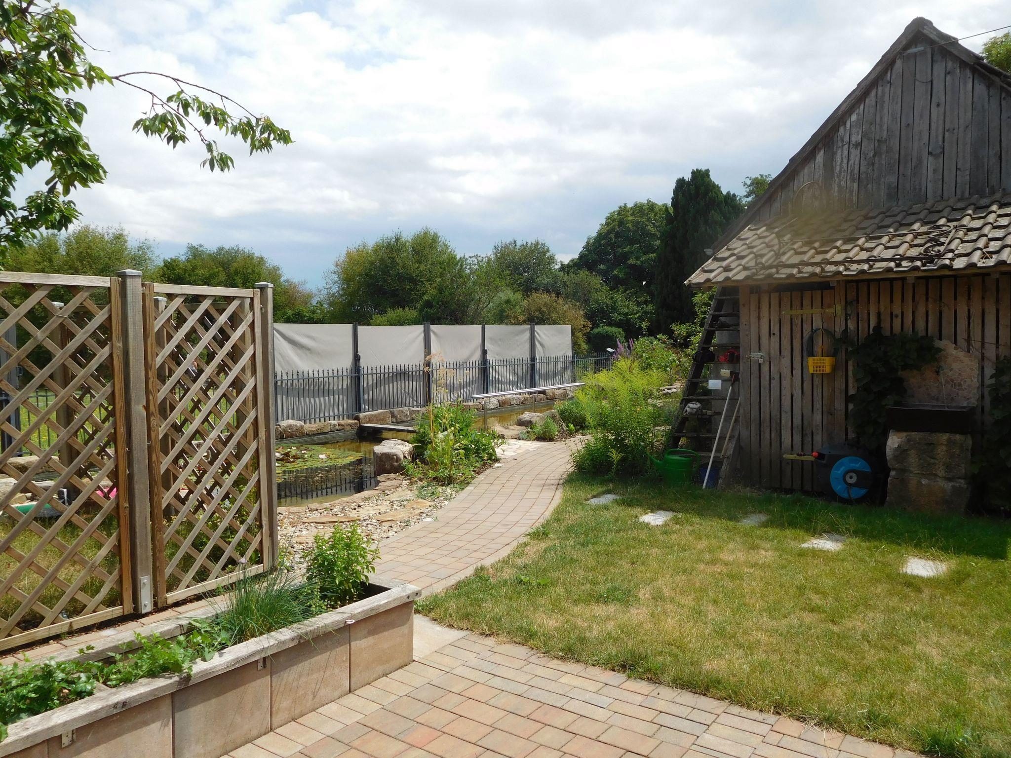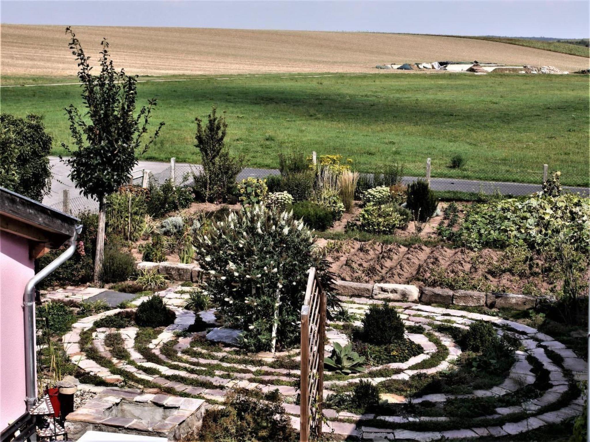 Prayer labyrinth, garden tables with seating and appropriate cushions, 2 x barbecue, enough deckchairs for everyone, 2 meadows, gardens, Kneipp facility with sauna and natural pool with treading, arm-diving and sunbathing areas in the water... particularly quiet location on the edge of the small village