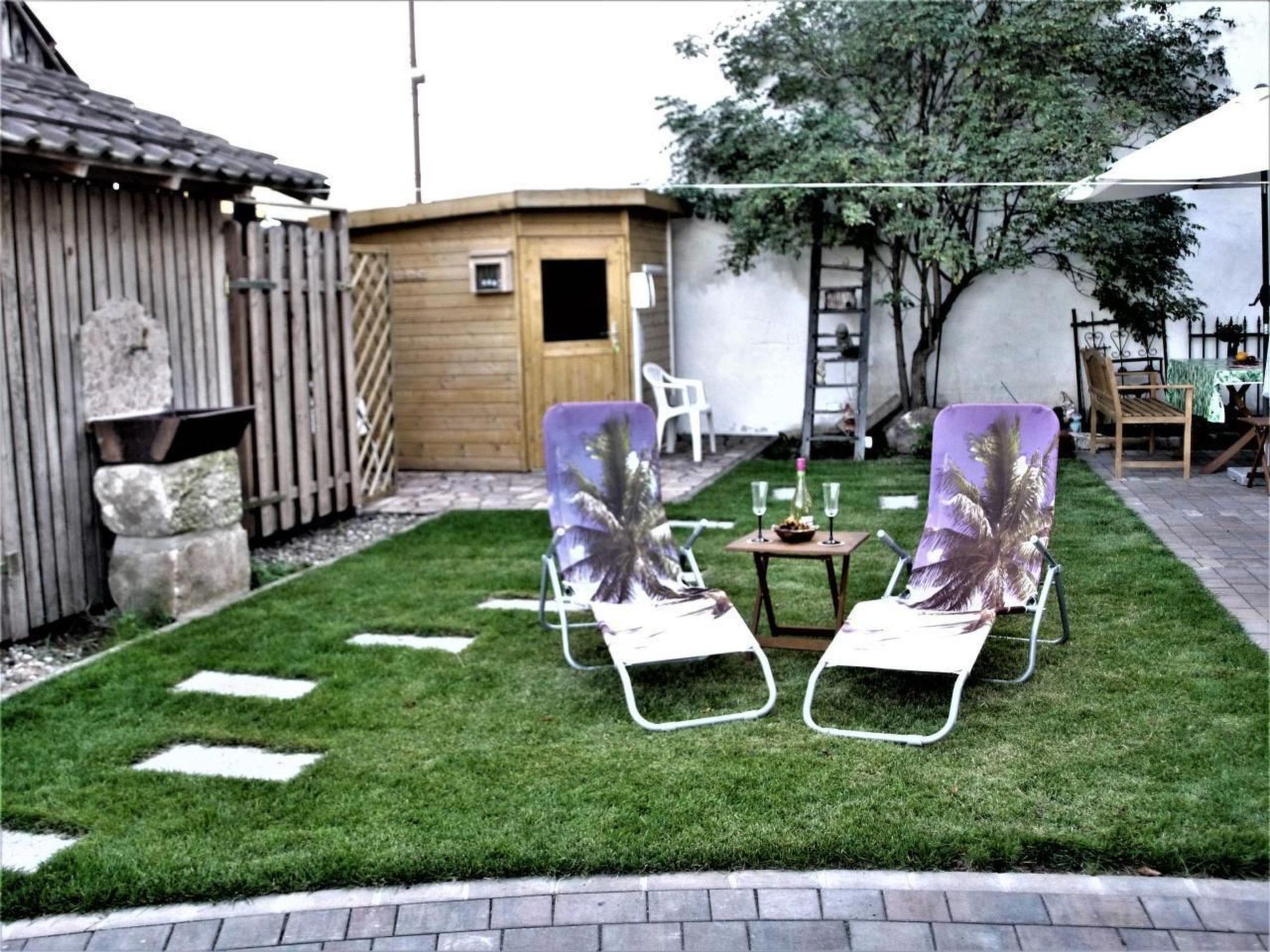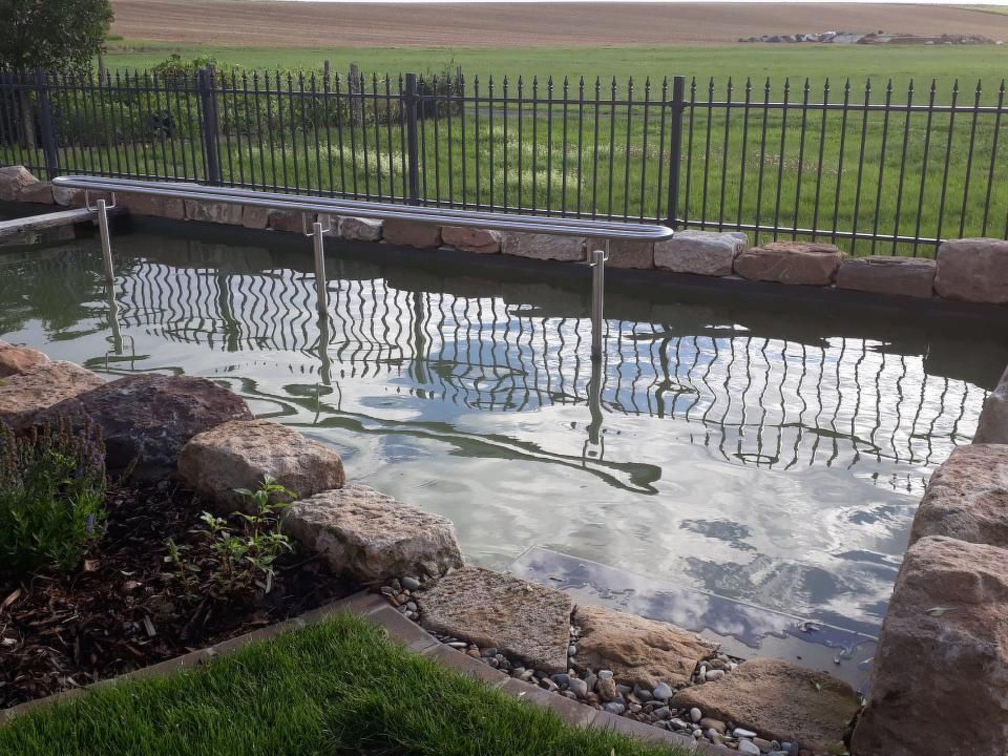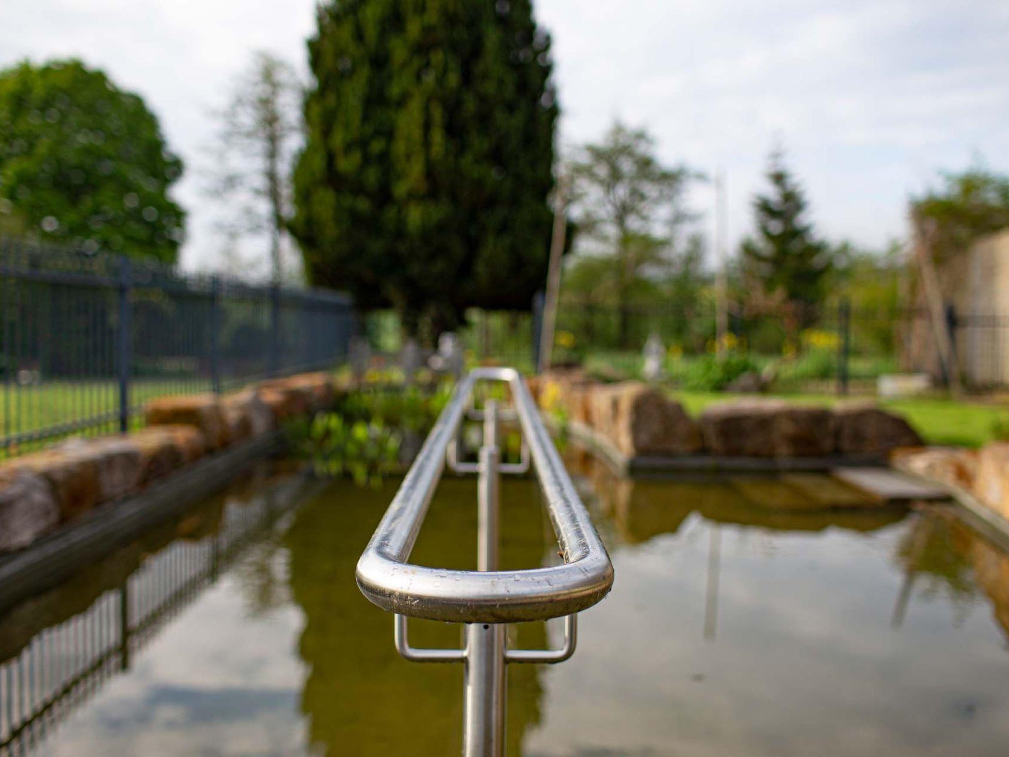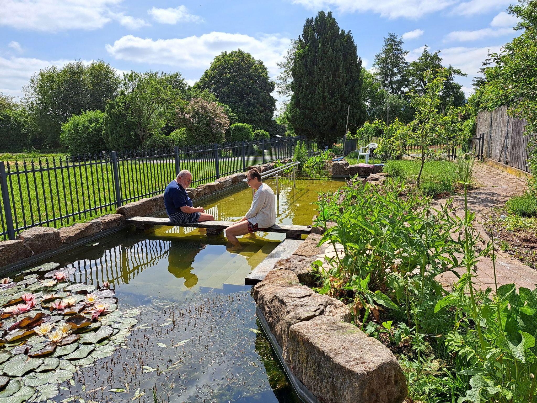 Prayer labyrinth, garden tables with seating and appropriate cushions, 2 x barbecue, enough deckchairs for everyone, 2 meadows, gardens, Kneipp facility with sauna and natural pool with treading, arm-diving and sunbathing areas in the water... particularly quiet location on the edge of the small village