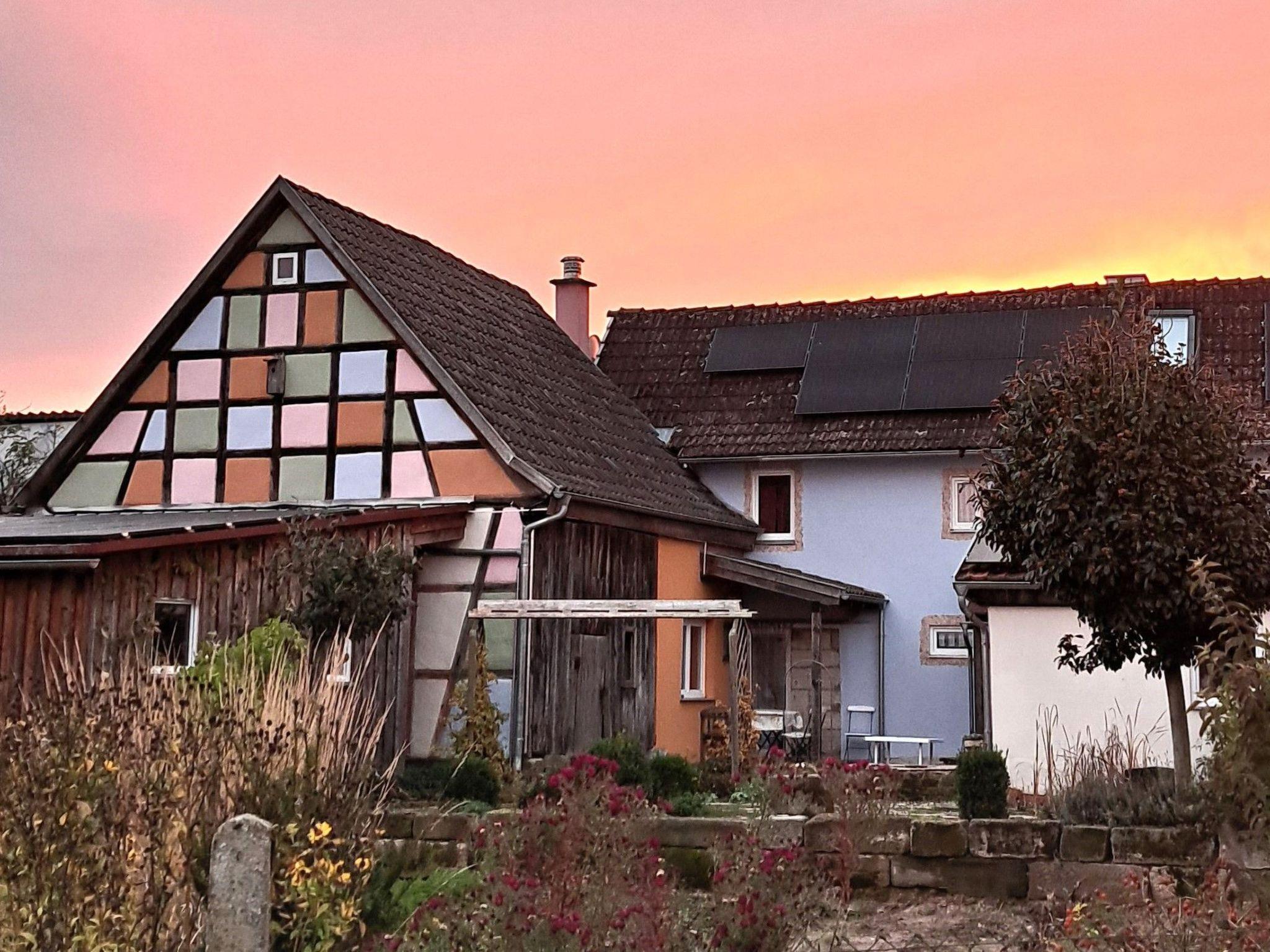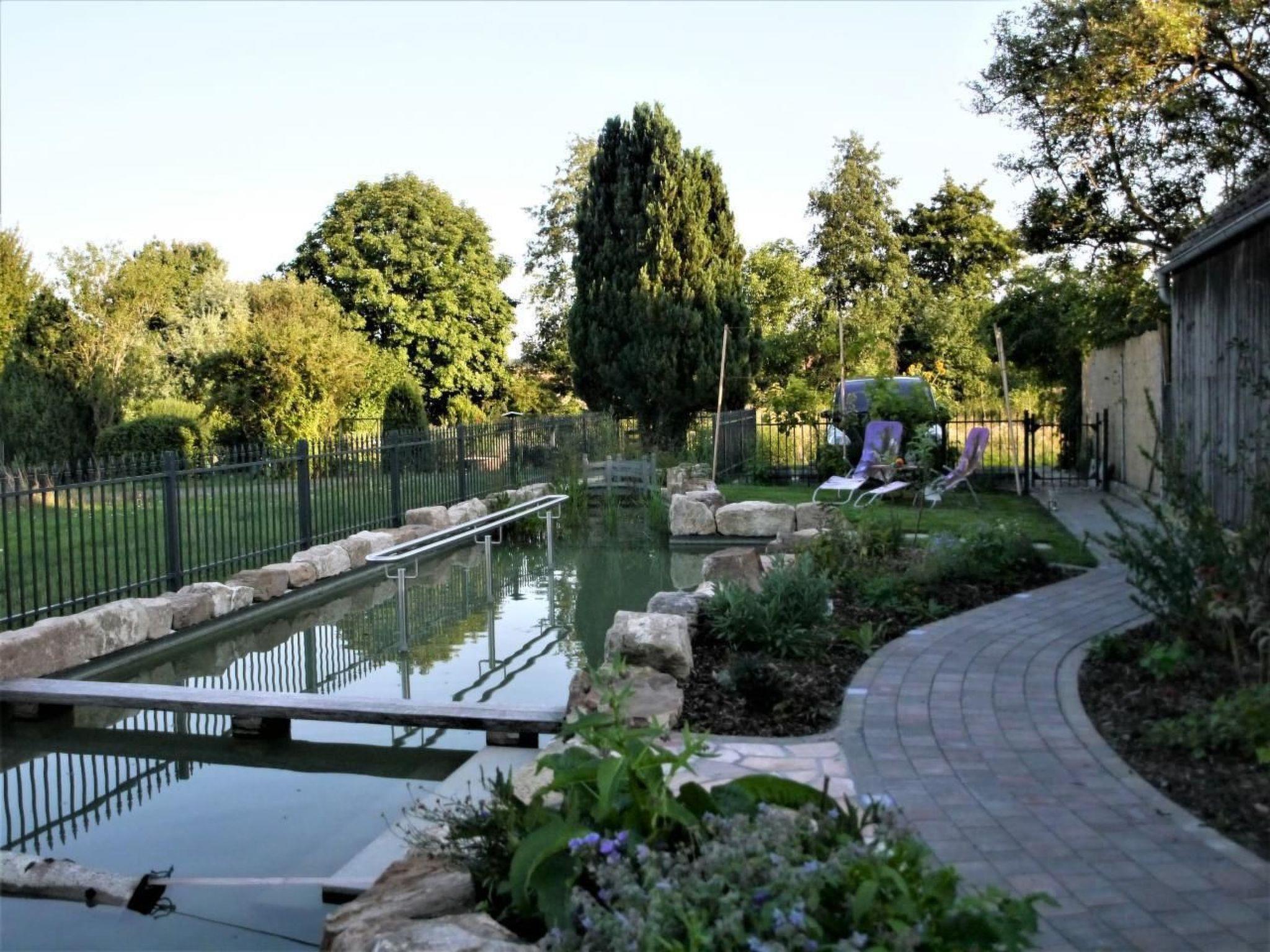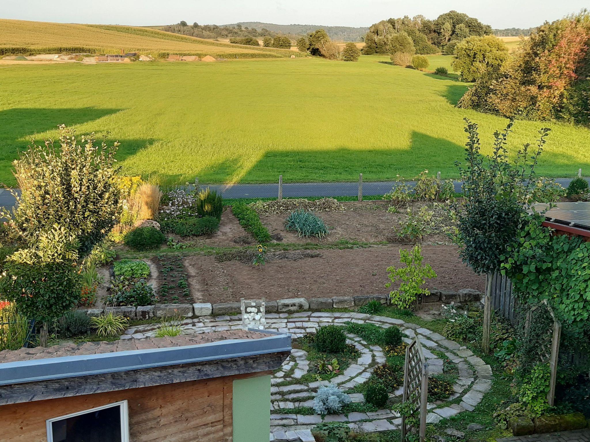 Here you have the cool magic of your own natural pool as a Kneipp facility, children's pool and a place to linger by and in the water. The Kimmelsbacher Hof holiday home in the Haßberge Nature Park is self-catering, has 4-DTV stars and is simply special. It offers the highest level of comfort - the kitchen in particular is well equipped - and is at the same time unusual, fairytale-like and full of surprises, discoveries and magic. The property is located on the outskirts of the village, surrounded by geomantic power places, nature reserves, but also historical castles and farmland from which our food comes. You have two terraces, a Kneipp garden, sauna, plunge, arm and treading pools to yourself, as well as shared use of the prayer labyrinth. From the property and from many windows you can see fields and forests. In the house you can see a varied selection of paintings and works of art and the rustic architecture of the old and ecologically top renovated house. At any time of the year and in any weather, the house is well heated by infrared ceiling heating, a cosy place to stay. The lovely area is full of fantastic hiking and cycling trails, as well as all kinds of excursion destinations. With its central location in Germany, it is an ideal place to stay for people who like each other.