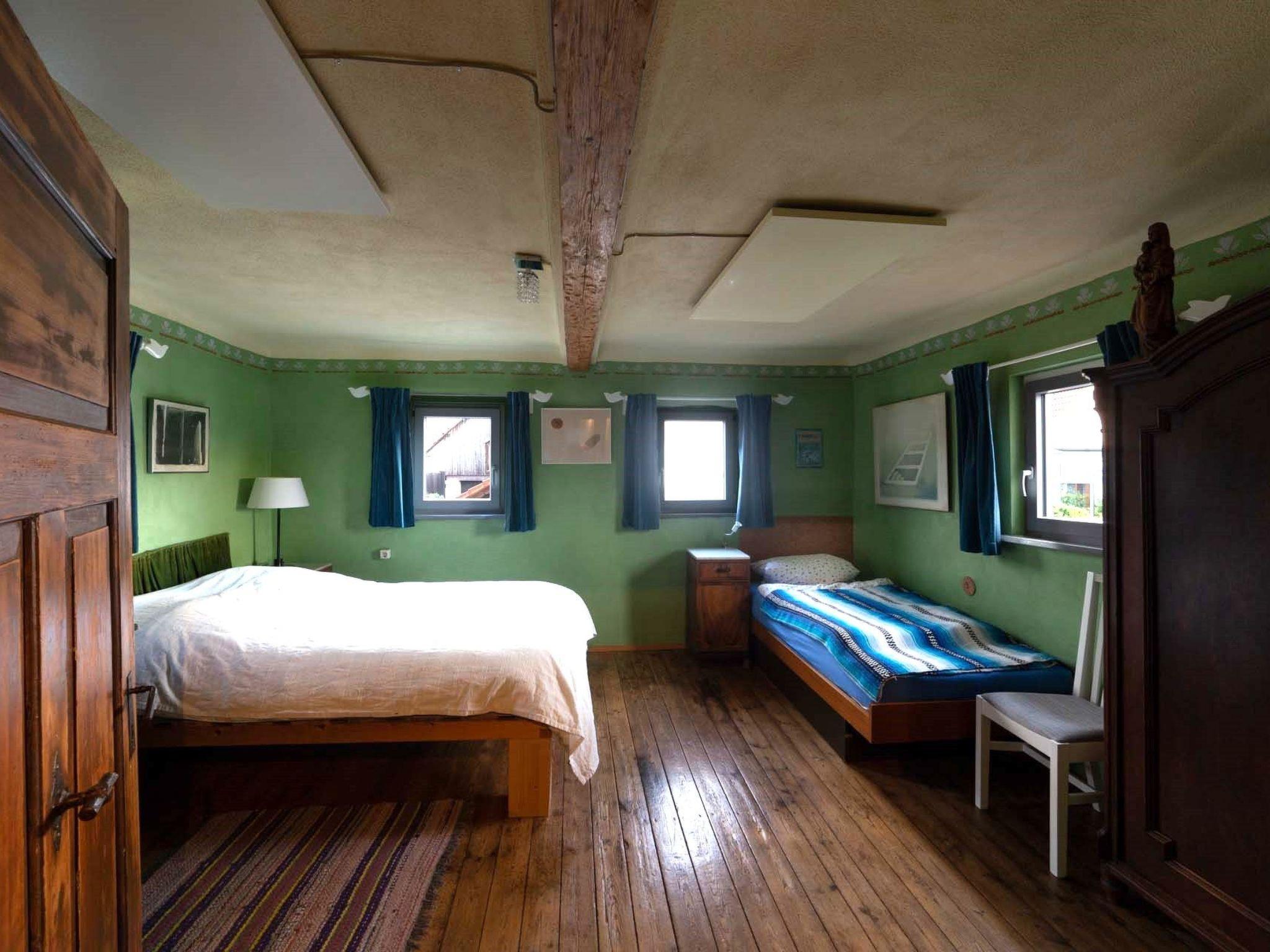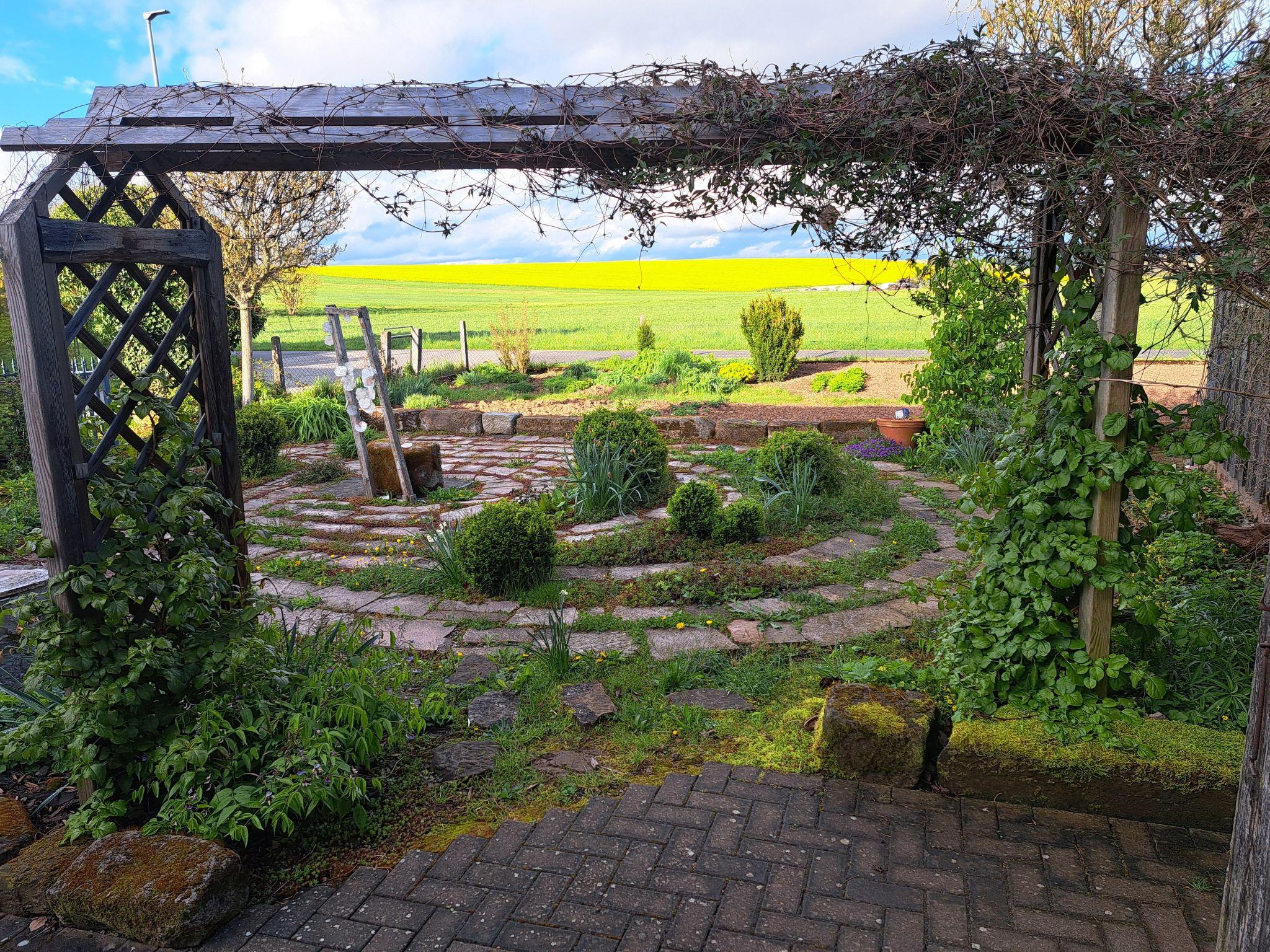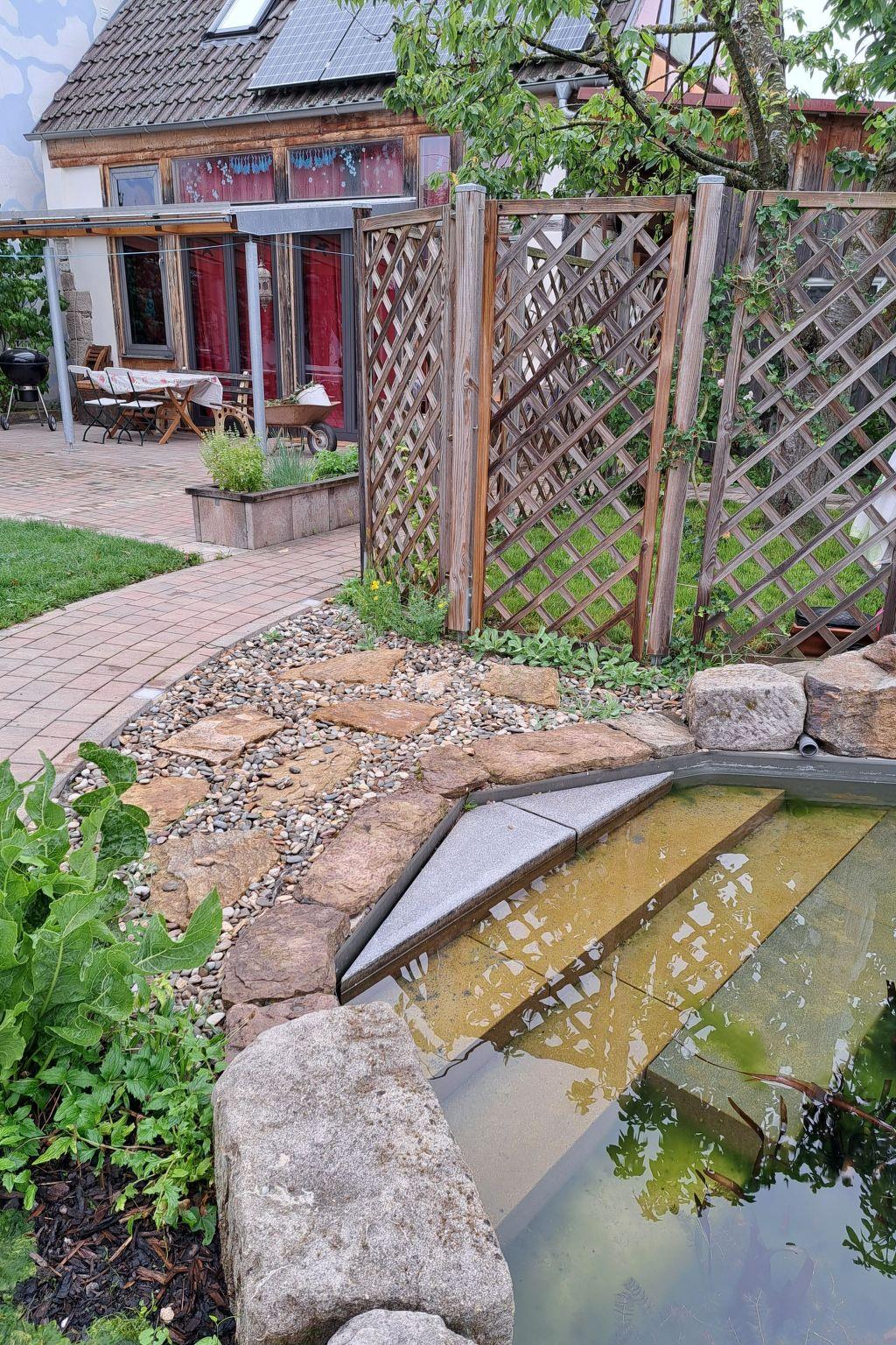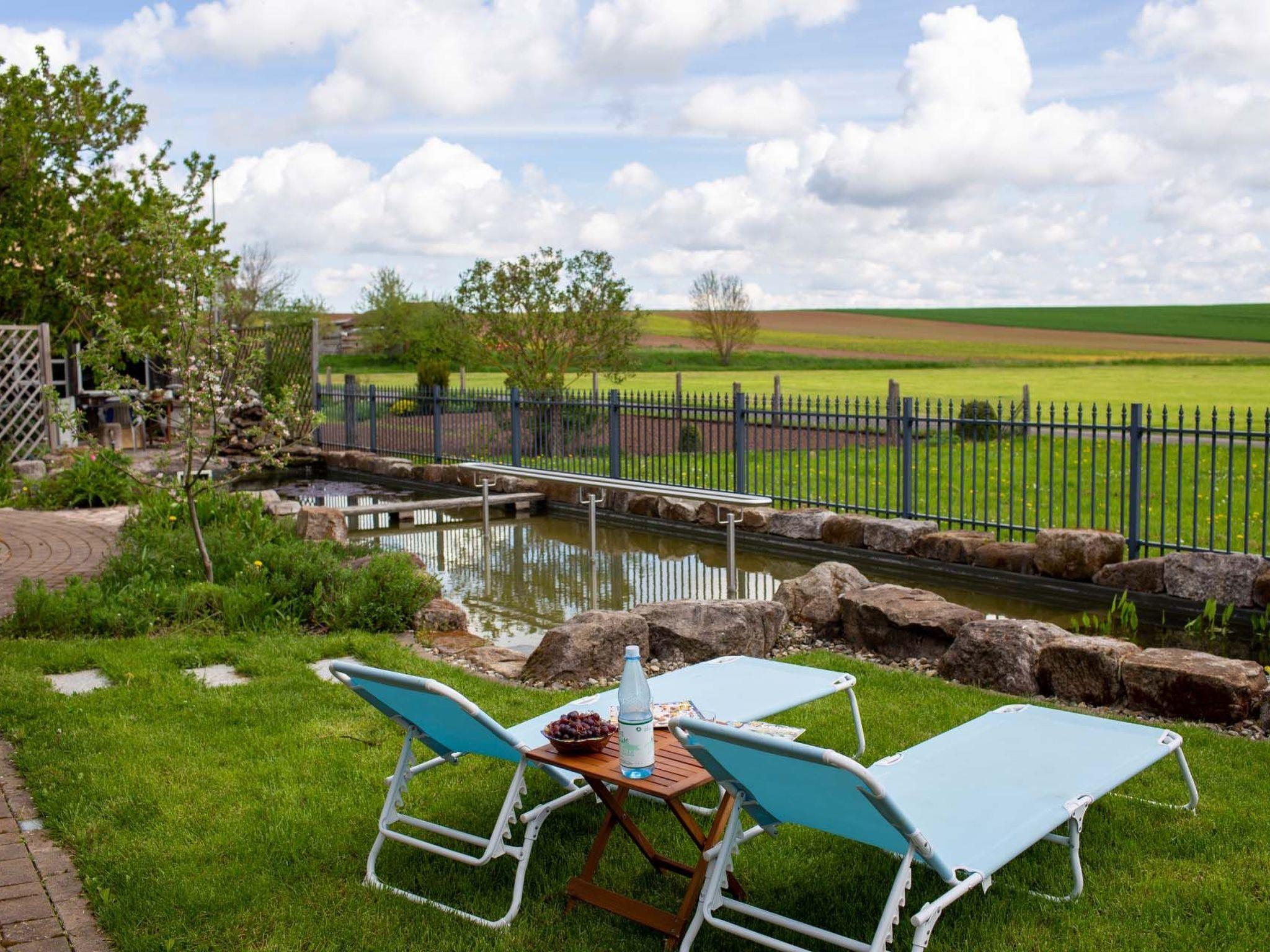 Here you have the cool magic of your own natural pool as a Kneipp facility, children's pool and a place to linger by and in the water. The Kimmelsbacher Hof holiday home in the Haßberge Nature Park is self-catering, has 4-DTV stars and is simply special. It offers the highest level of comfort - the kitchen in particular is well equipped - and is at the same time unusual, fairytale-like and full of surprises, discoveries and magic. The property is located on the outskirts of the village, surrounded by geomantic power places, nature reserves, but also historical castles and farmland from which our food comes. You have two terraces, a Kneipp garden, sauna, plunge, arm and treading pools to yourself, as well as shared use of the prayer labyrinth. From the property and from many windows you can see fields and forests. In the house you can see a varied selection of paintings and works of art and the rustic architecture of the old and ecologically top renovated house. At any time of the year and in any weather, the house is well heated by infrared ceiling heating, a cosy place to stay. The lovely area is full of fantastic hiking and cycling trails, as well as all kinds of excursion destinations. With its central location in Germany, it is an ideal place to stay for people who like each other.