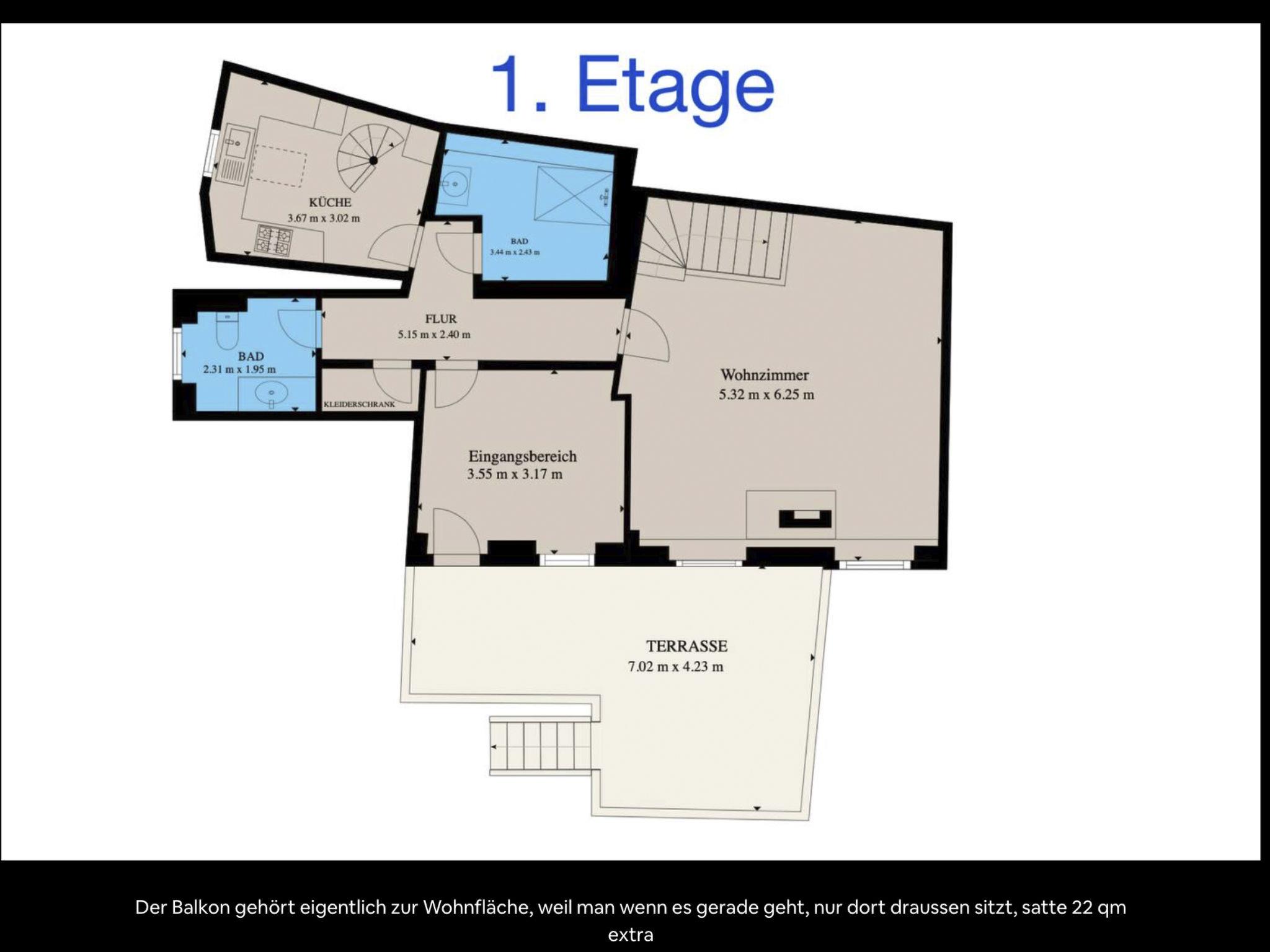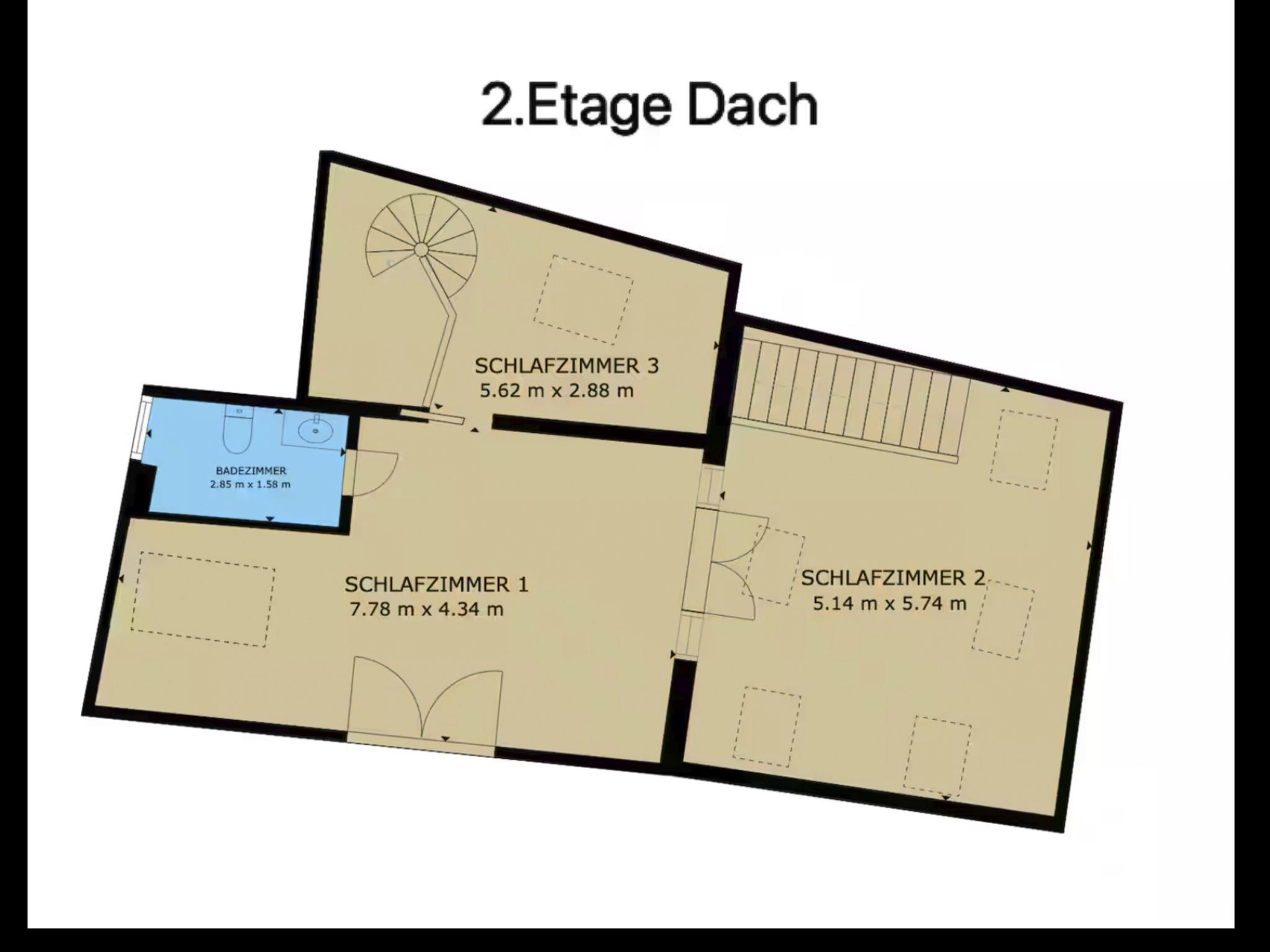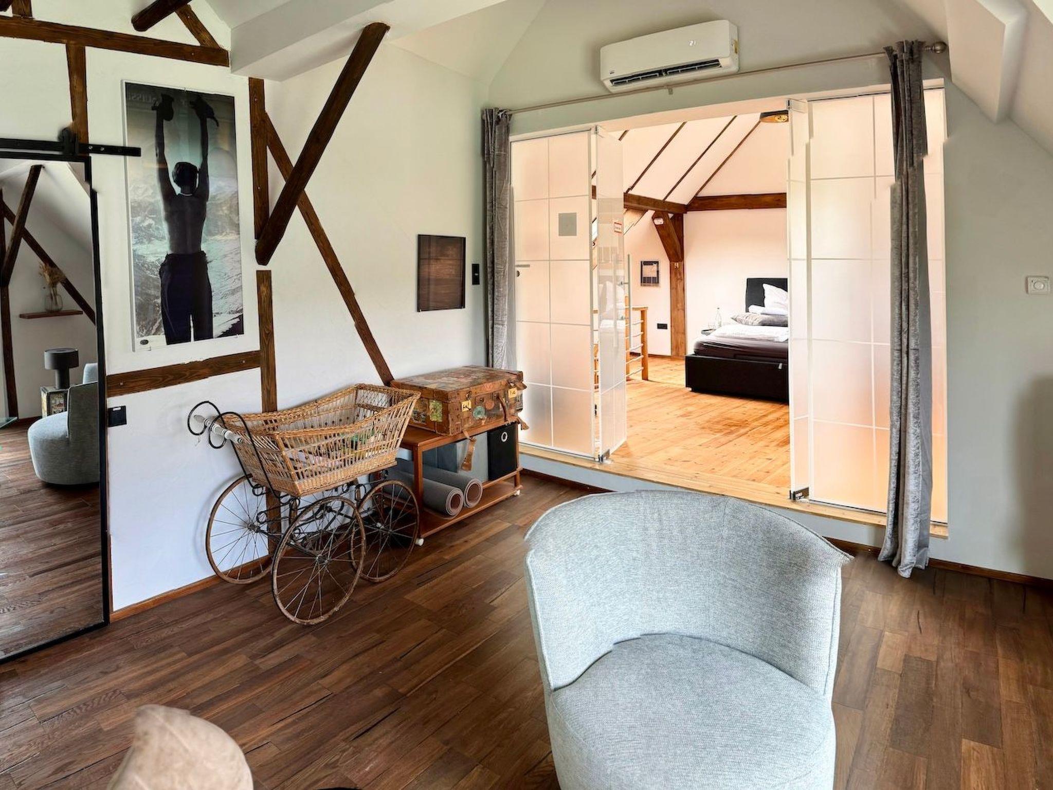 Bedroom 1 has its own small bathroom with washbasin and toilet and, in addition to the wide staircase, can be reached via a gallery with a spiral staircase above the kitchen.