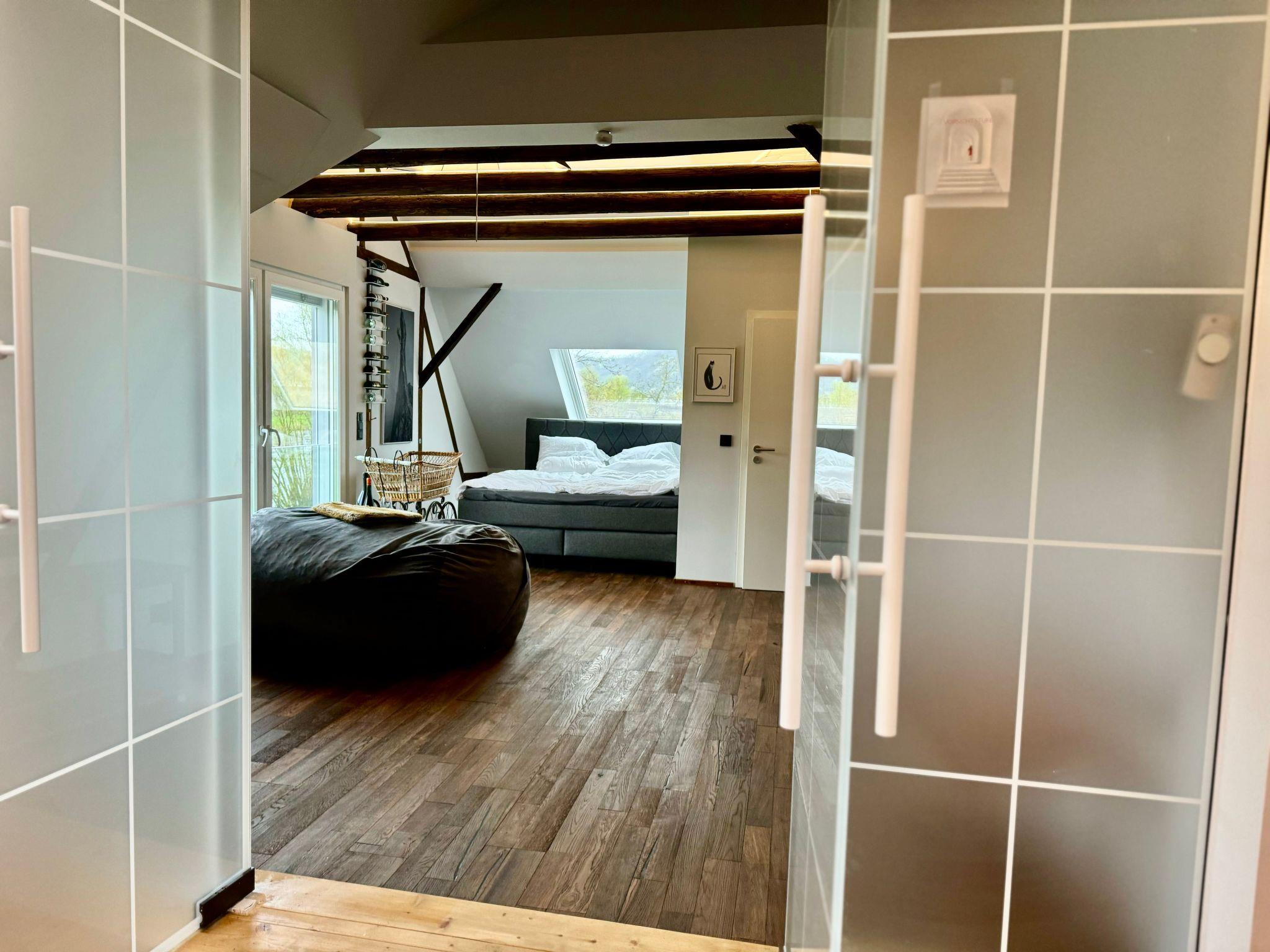 The two bedrooms are actually like two separate studios, almost like holiday flats in a holiday home, so to speak, and can be reached separately via two staircases, can be separated by an elegant loft element and can be cooled separately: