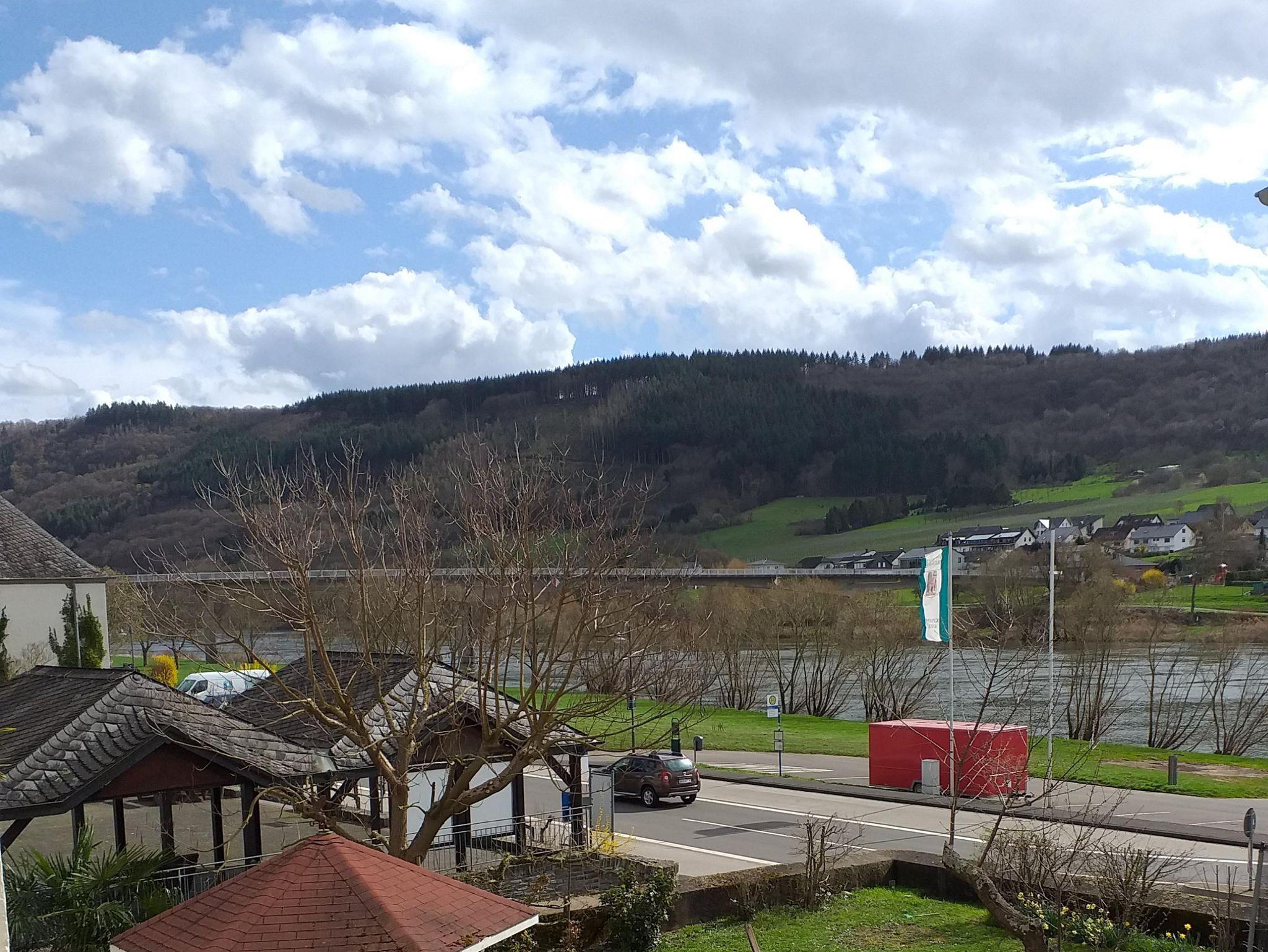 Das Gästezimmer hat zusätzlich ein Fernsehzimmer mit Flachbildschirm, Balkon und Kaffeemaschine. Vom Balkon aus sieht man seitlich auf die Mosel, die Brücke nach Kindel, oberhalb auf Weinberge und den Wald zum Hunsrück. Das geräumige Badezimmer mit Dusche und WC steht beiden Zimmern zur gemeinsamen Nutzung zur Verfügung.