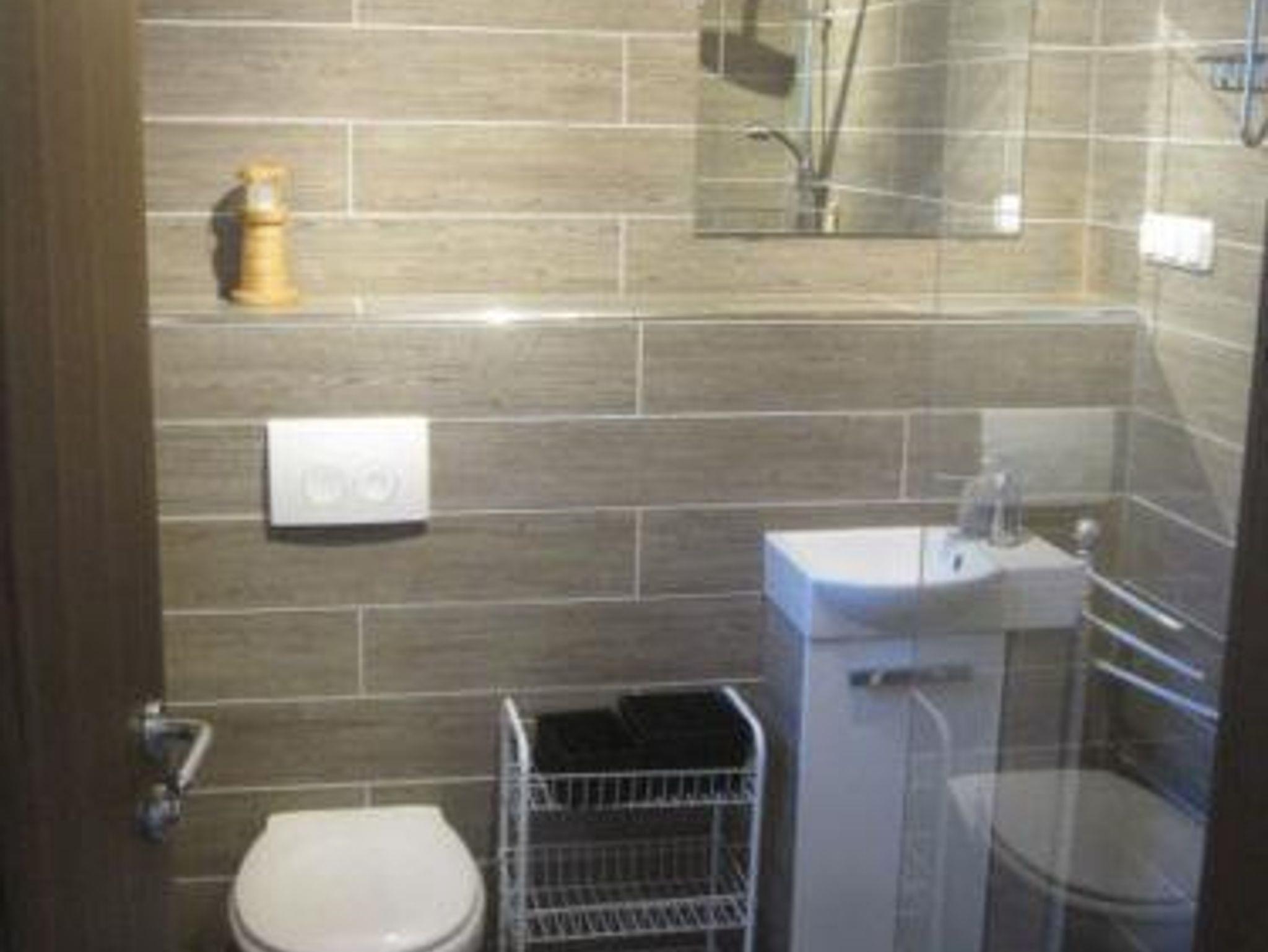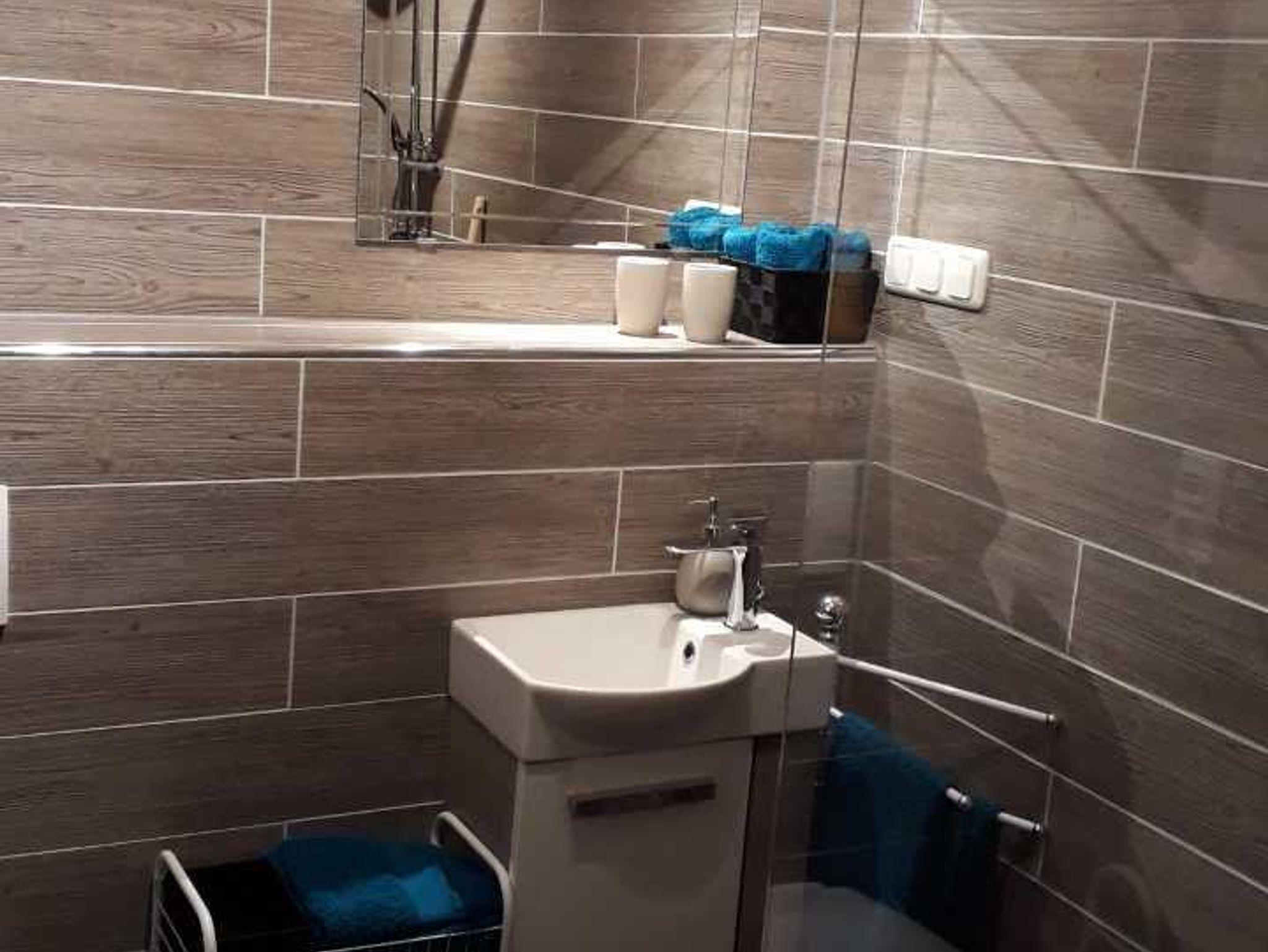 barrierefreie Dusche mit zusätzlicher Regendusche, WC, Waschbecken, Radio, Spiegel, Durchlauferhitzer und Elektroheizung