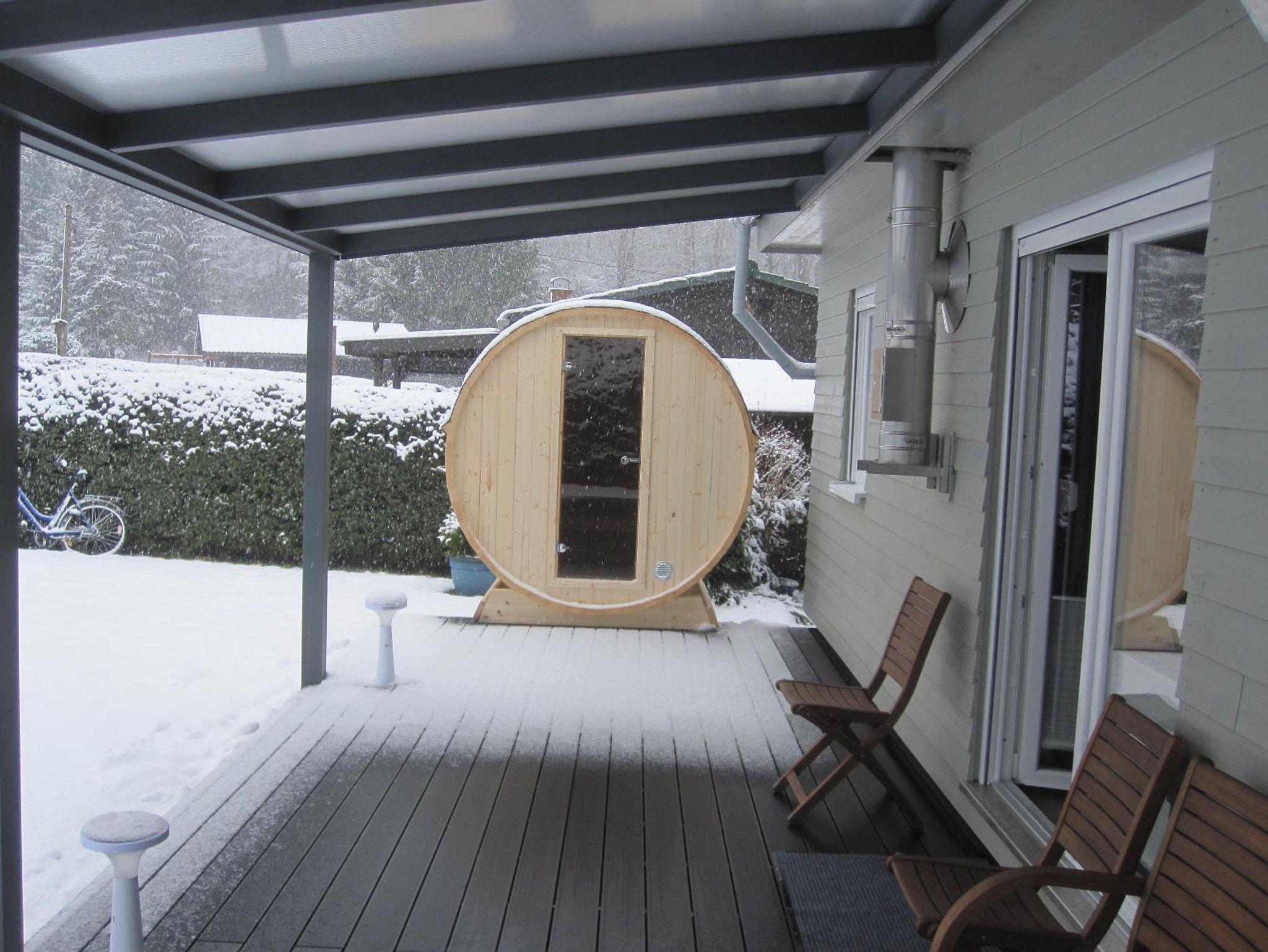 • Eine großzügige Terrasse mit einer angrenzenten Fass-Sauna steht Ihnen ebenfalls zur alleinigen Nutzung zur Verfügung