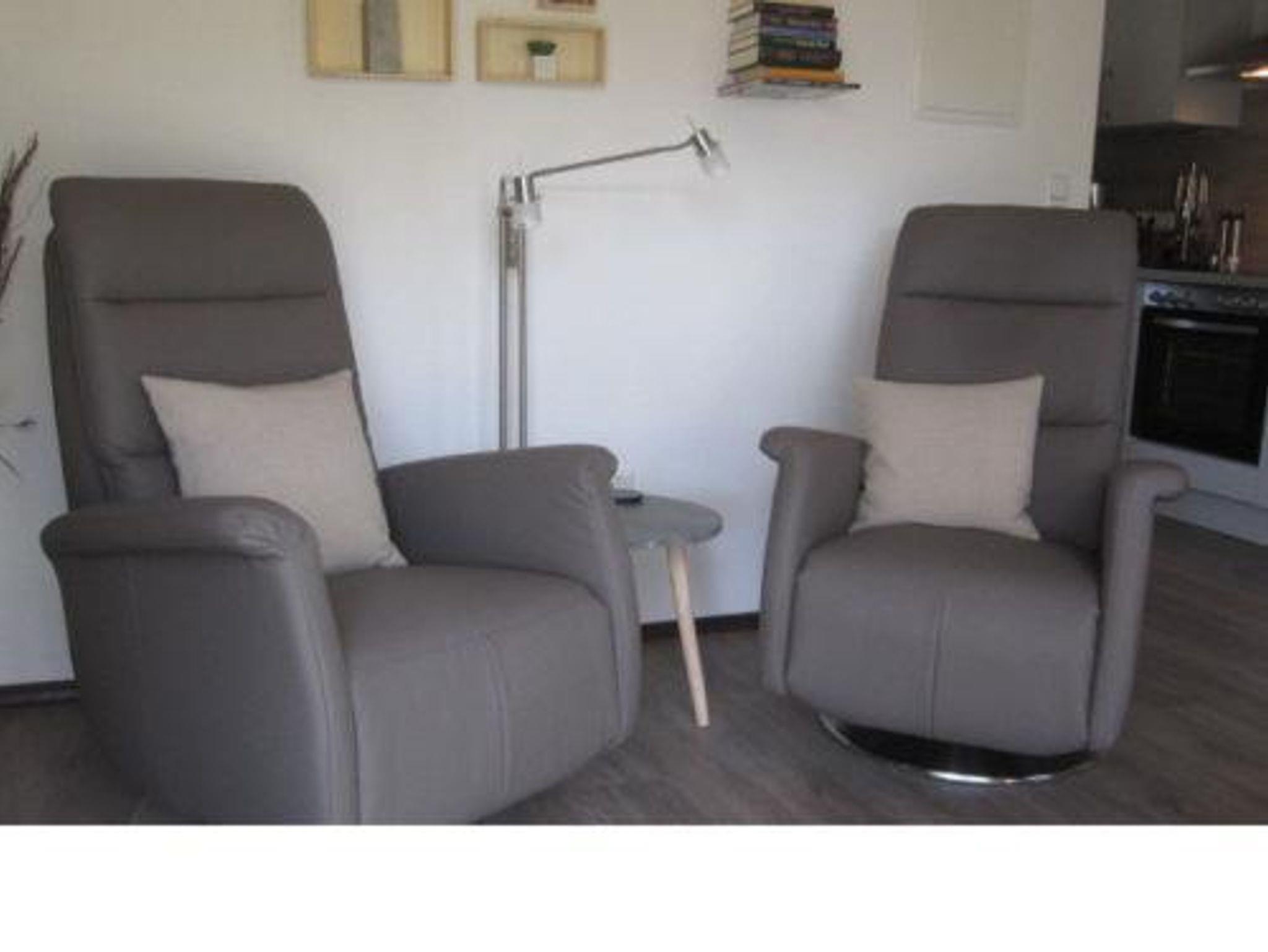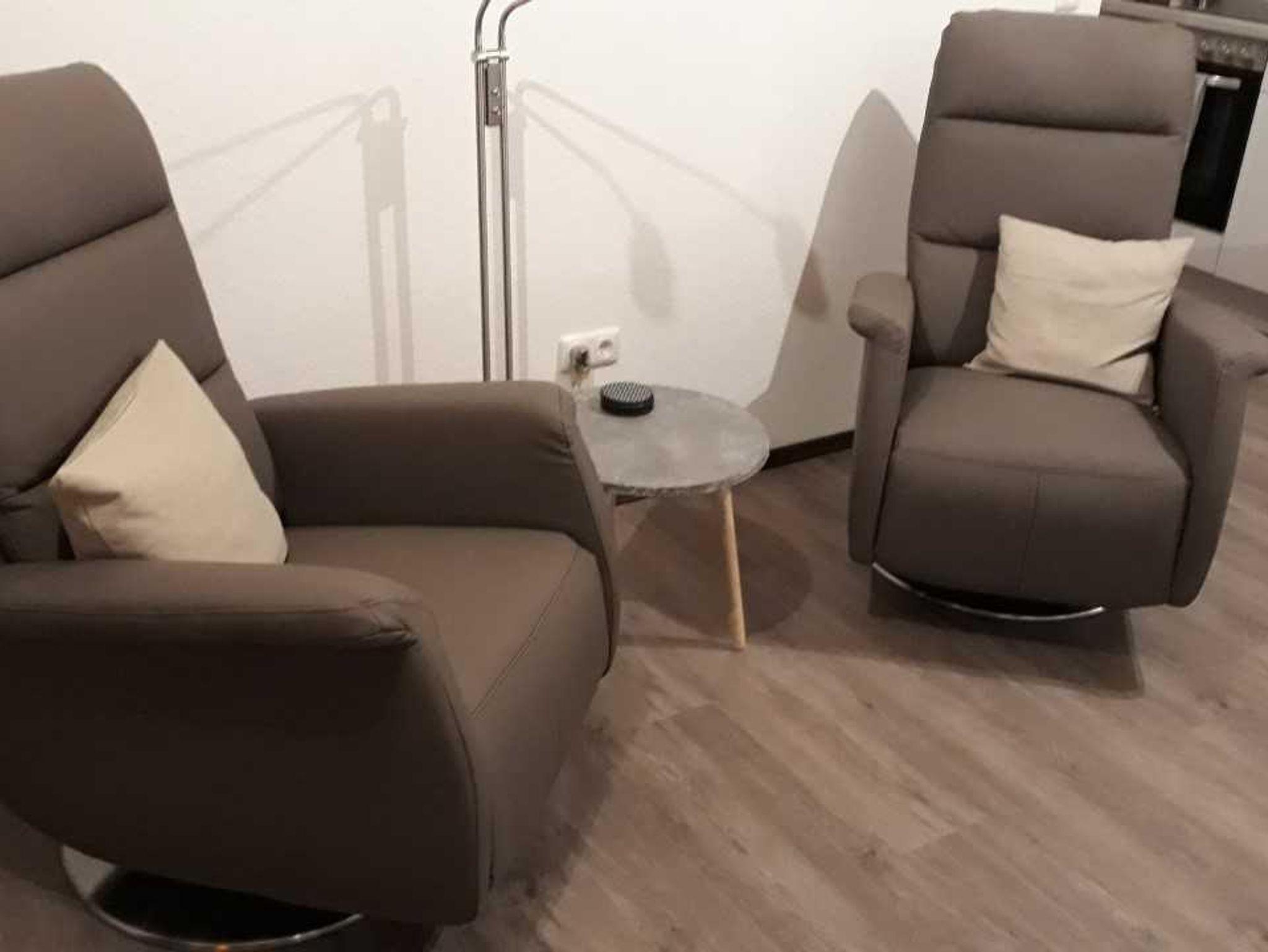 Esstisch angrenzend an Küche, moderner Flachbildschirm Sateliten TV, 2 x Relax-Sessel mit Tisch und Leselampen, gemütlicher Schwedenofen