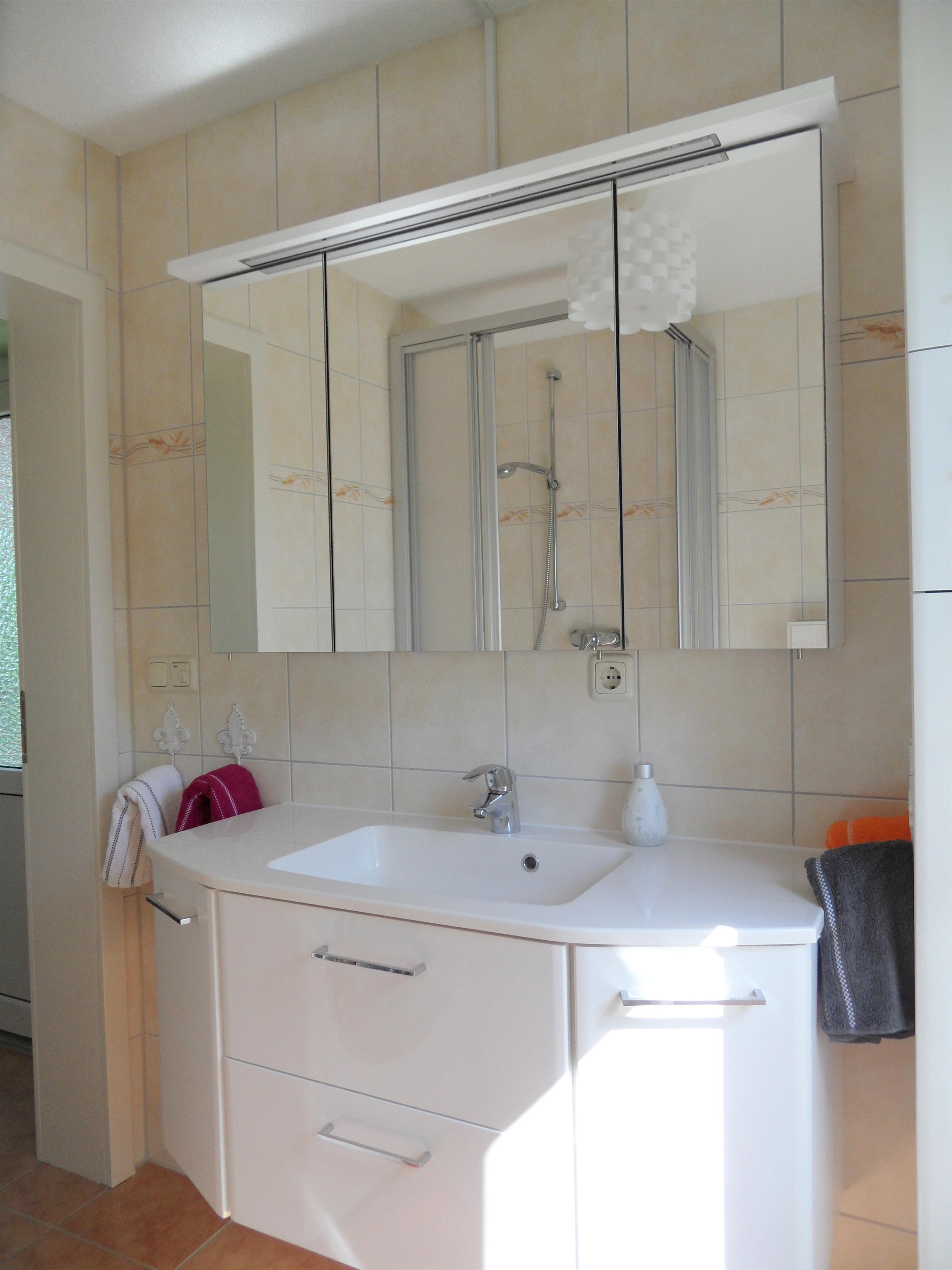 Das Badezimmer ist mit einer Dusche, einem großen Spiegel und Schränken mit viel Stauraum ausgestattet.