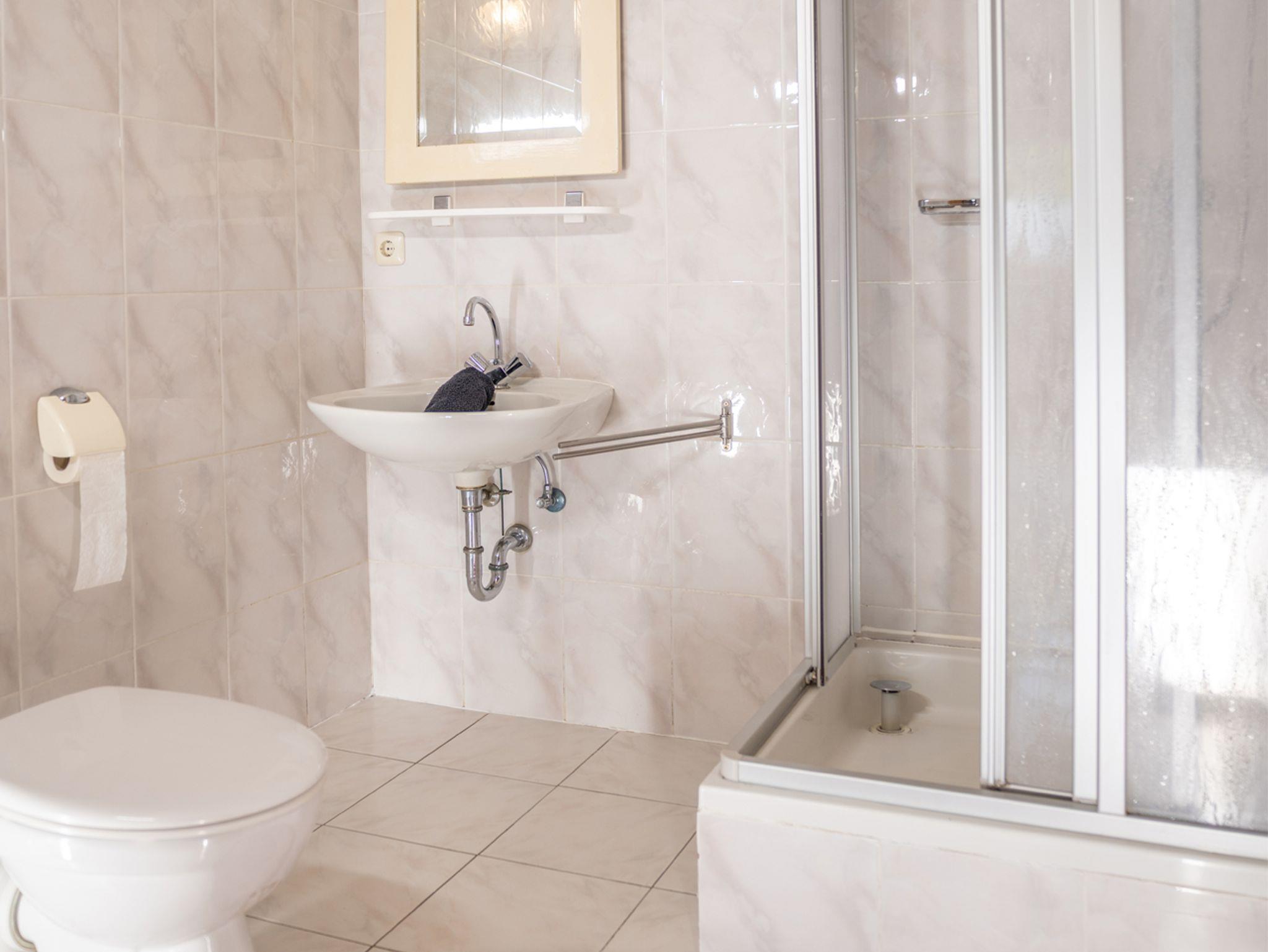 Bei Bedarf ist eine Erweiterung auf zwei Schlafzimmer möglich. Das Badezimmer ist mit einer geräumigen Dusche und WC ausgestattet.