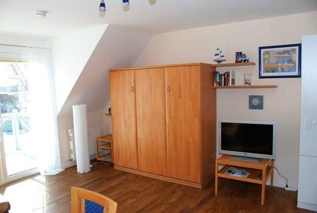 Das Bett können Sie tagsüber zu einem Schrank umwandeln und zur Nacht bietet es problemlos zwei Schlafplätze. Für die Schlechtwettertage steht Ihnen ein TV-Gerät zu Ihrer Unterhaltung zur Verfügung. Im Kleiderschrank finden Sie Stauraum für Ihre Garderobe.