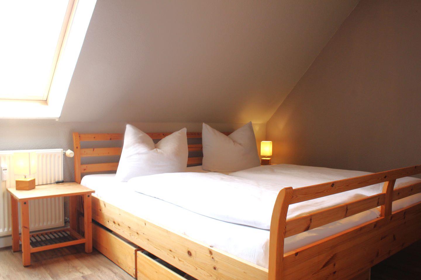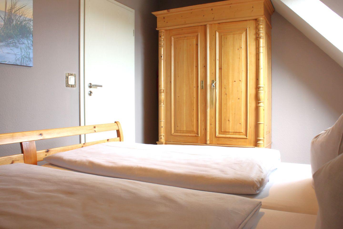 Im Schlafzimmer erwartet Sie ein komfortables Doppelbett sowie ein geräumiger Kleiderschrank, um Ihre Garderobe ordentlich zu verstauen.