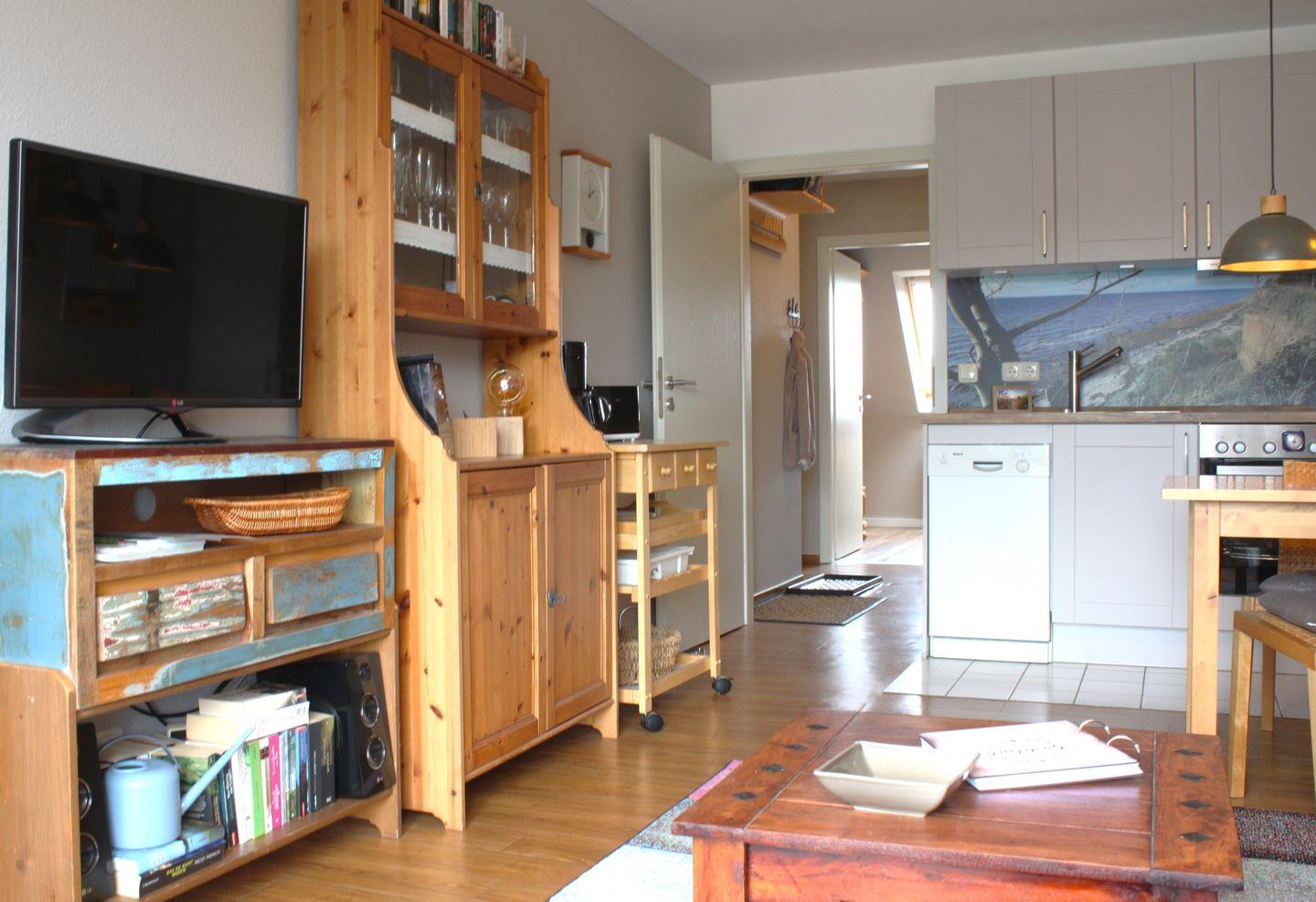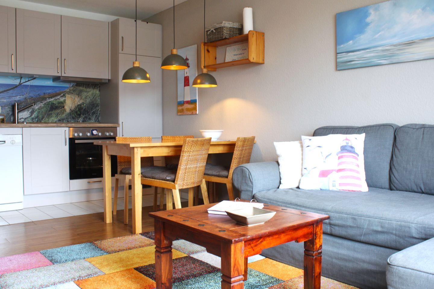 Die Ferienwohnung Lütt Kajüt bietet auf 40 m² modernen Komfort für zwei Personen. Sie verfügt über einen offenen Wohn-Essbereich mit vollständig ausgestatteter Küche, ein separates Schlafzimmer, einen überdachten Balkon mit eingeschränktem Meerblick sowie WLAN. Ein eigener Parkplatz und die Nähe zu Einkaufsmöglichkeiten und Restaurants runden das Angebot ab.