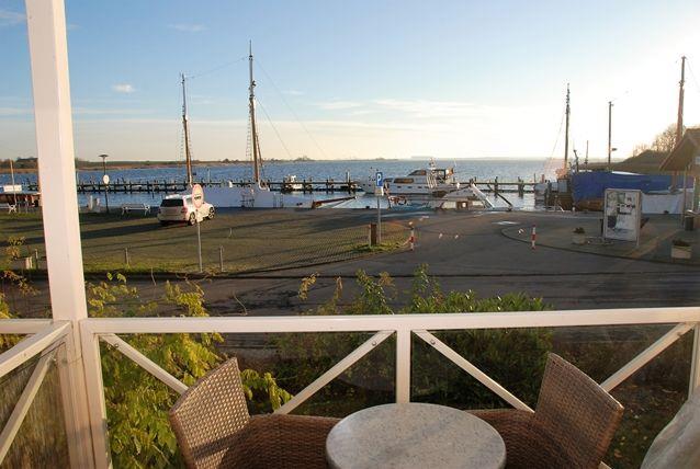 Außerdem befindet sich hier der Zugang zum möblierten Balkon, von dem aus Sie einen freien Blick auf den Hafen und die Kirchsee mit Wismarbucht haben.