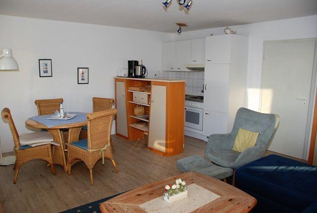 Das Wohnzimmer ist kombiniert eingerichtet und bietet sowohl eine Sofaecke mit TV-Gerät als auch einen Esstisch und die integrierte Küchenzeile. Diese ist gut ausgestattet und verfügt bspw. über einen Kühlschrank mit Gefrierfach, einen Herd mit Backofen, Kaffeemaschine, Wasserkocher und Toaster.
