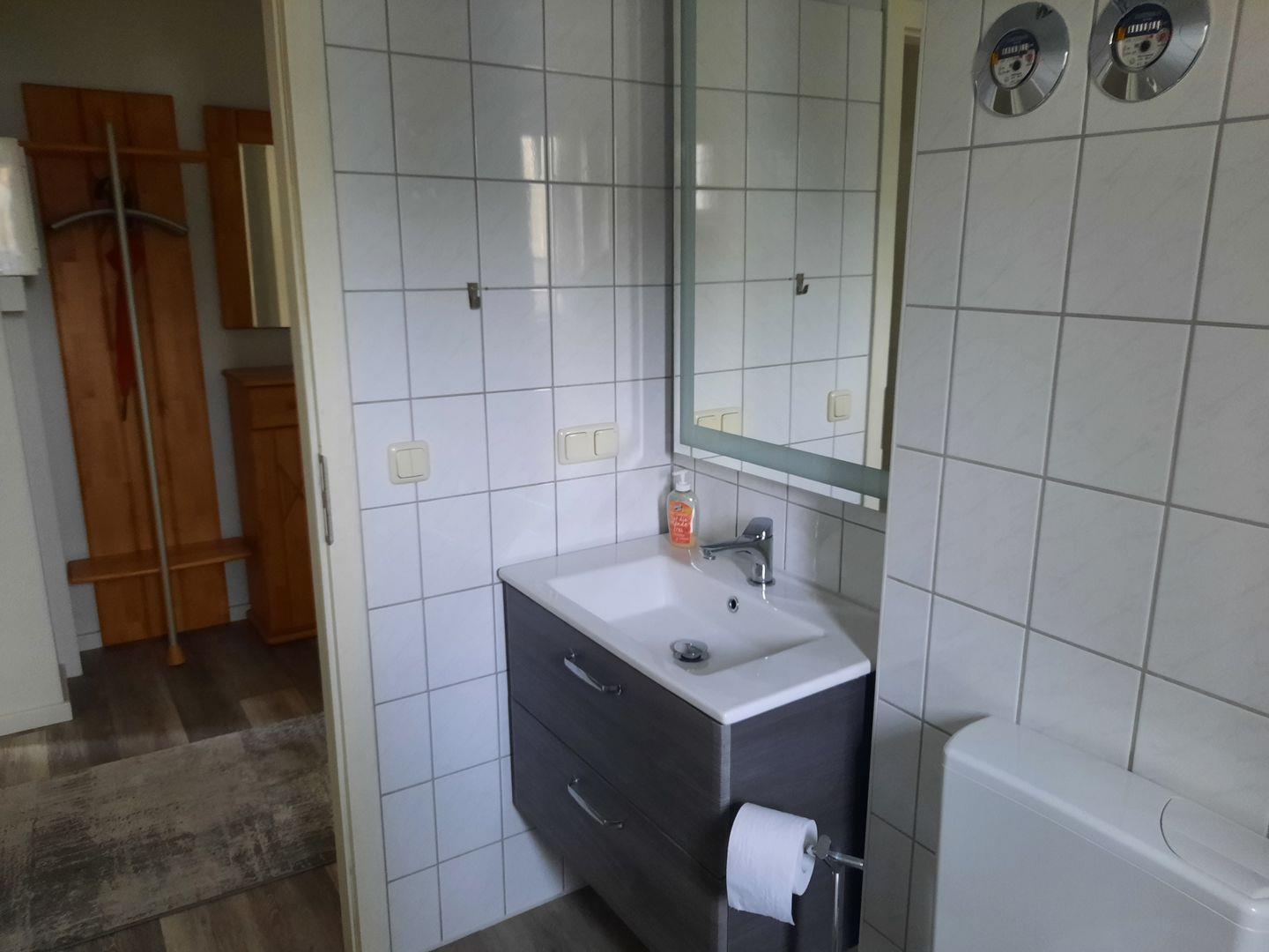 Das Badezimmer mit Fenster bietet Ihnen eine Dusche, einen Waschtisch und ein WC.