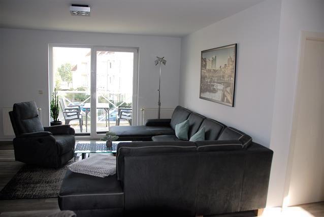 Der moderne und kombinierte Wohn- und Essbereich ist mit einer komfortablen, großzügigen Sofalandschaft und einem TV-Gerät eingerichtet und verfügt über den Zugang zum möblierten Balkon. Von hier haben Sie einen seitlichen Blick auf die Kirchsee und die Wismarbucht.