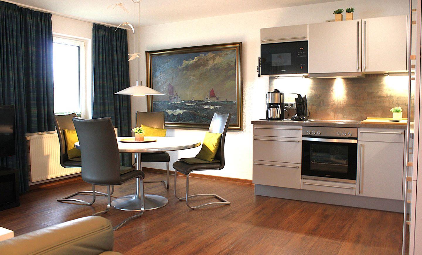 Die in den Wohnraum integrierte, hochwertige Küche mit Essbereich ist mit allen technischen Geräten, wie z.B. Herd mit Backofen, Kühlschrank mit Gefrierfach,Geschirrspülmaschine, Kaffeemaschine und vielem mehr ausgestattet und bietet gute Möglichkeiten für die Zubereitung Ihrer Mahlzeiten.