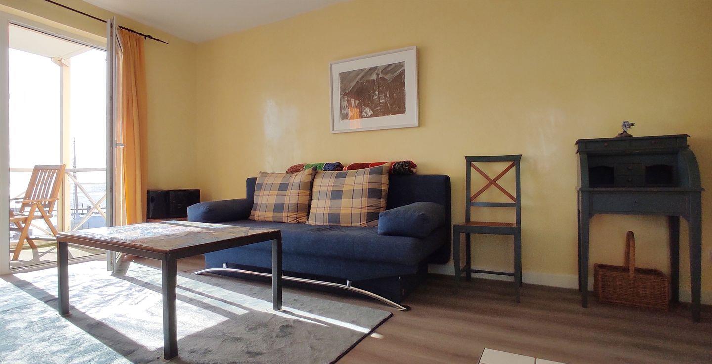 Über den Eingangsbereich betreten Sie den kombinierten Wohn- und Essbereich mit gemütlicher Couch und TV-Gerät. Die integrierte Küche verfügt über alle gängigen technischen Geräte, die Sie für einen gemütlichen Kochabend benötigen. Dazu gehören unter anderem ein Kühlschrank mit Gefrierfach, ein Herd mit Backofen, eine Kaffeemaschine, ein Wasserkocher und eine Geschirrspülmaschine. Genießen Sie Ihre Mahlzeiten entweder an dem angrenzenden Esstisch oder auf dem Balkon mit Blick auf das bunte Treiben im Hafen von Kirchdorf und Meerblick auf die Kirchsee und Wismarbucht.