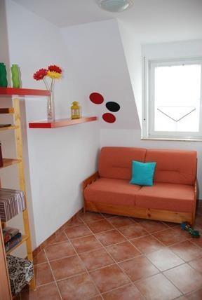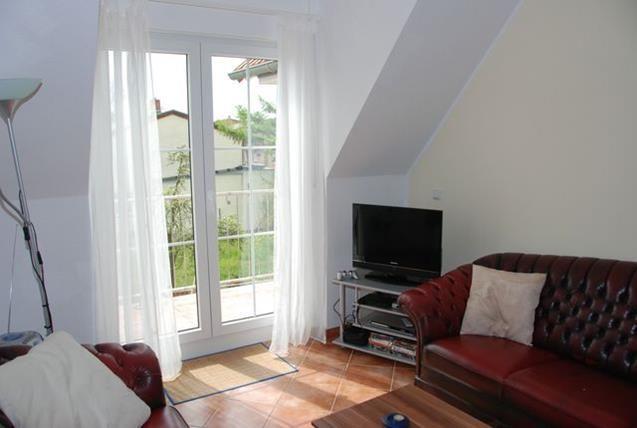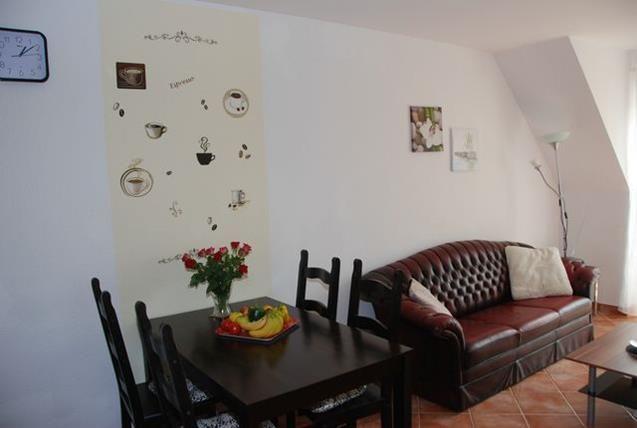 Das kombinierte Wohn- und Esszimmer ist mit einer Couch, einem TV-Gerät und einem Esstisch gemütlich möbliert. Außerdem befindet sich hier auch der Zugang zum saisonal möblierten Balkon. Die Küche ist integriert und unter anderem mit Kühlschrank mit Gefrierfach, Mikrowelle, Herd, Kaffeemaschine und vielem mehr ausgestattet und ermöglicht eine gute Selbstverpflegung.
