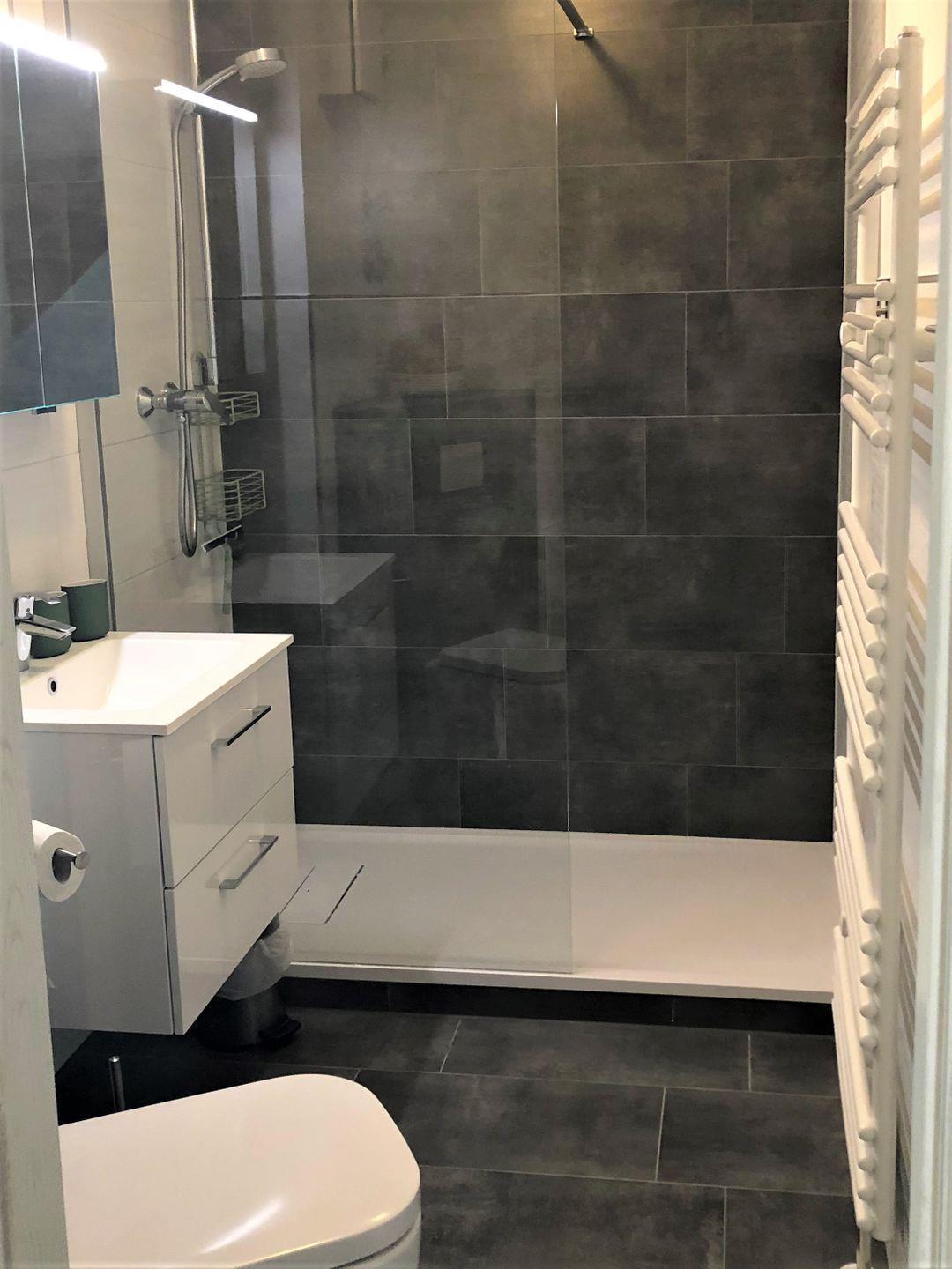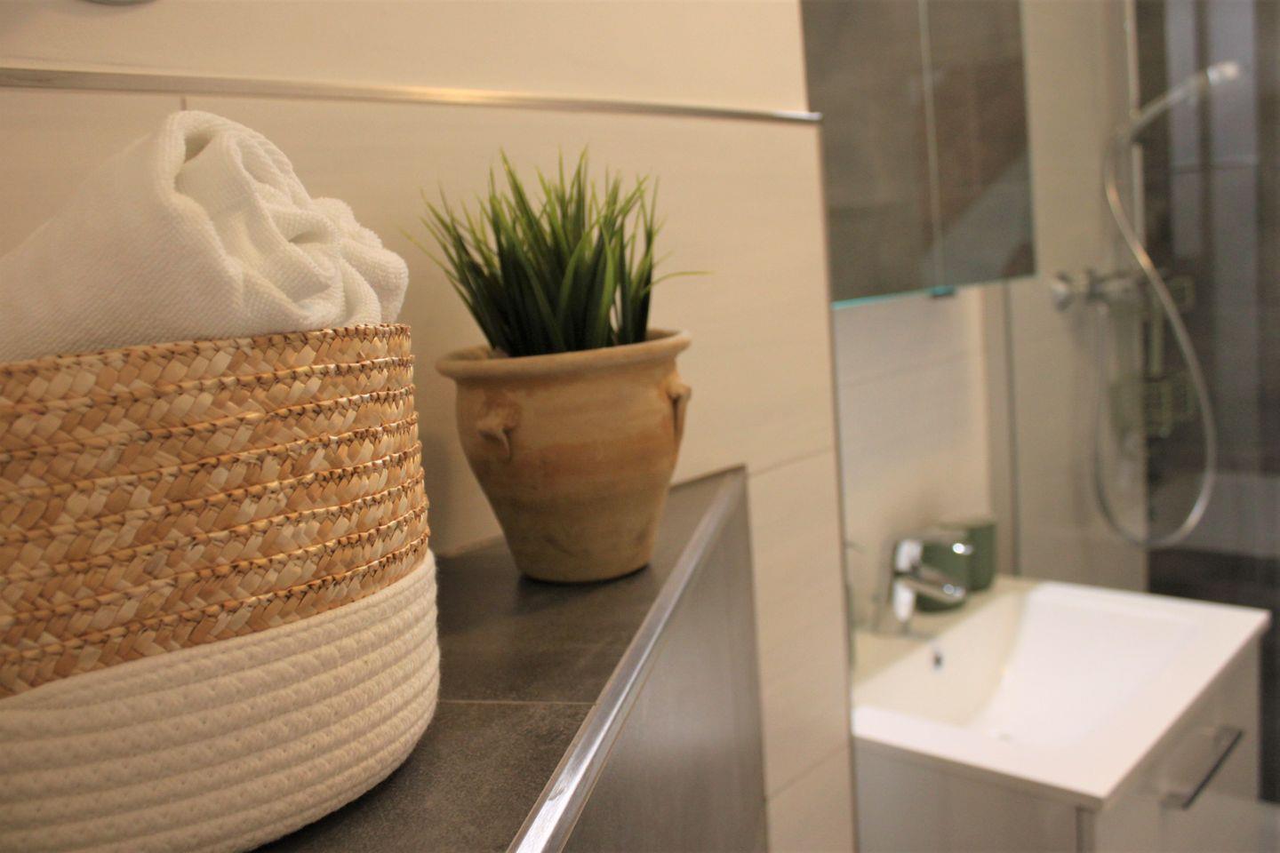 Das innenliegende moderne Badezimmer ist mit einer großzügigen Dusche, einem Waschtisch und WC für den täglichen Bedarf ausgestattet.