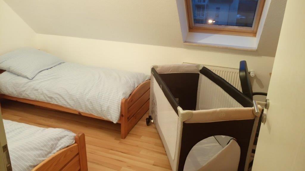 Die Wohnung verfügt über zwei separate Schlafzimmer. Ein Schlafzimmer ist mit einem Doppelbett, einem Kleiderschrank und einem TV-Gerät, das zweite mit zwei Einzelbetten, einem Kleiderschrank und einem Schreibtisch möbliert. Hier findet auch das Kinderreisebett, wenn benötigt, seinen Platz. Für zwei weitere Personen lassen sich die beiden Sofas im Wohnzimmer problemlos in zwei getrennte, großzügige Schlafmöglichkeiten verwandeln. Wir empfehlen die Nutzung der Doppelschlafcouchen für Kinder.