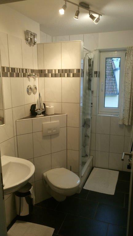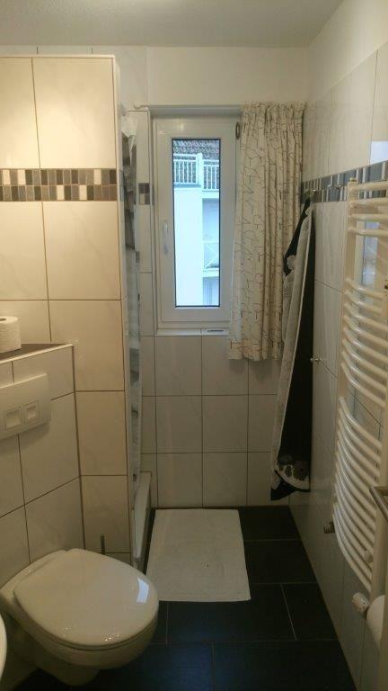 Das Tageslichtbadezimmer ist mit einer Dusche, einem Waschtisch, einem WC und Fön eingerichtet.