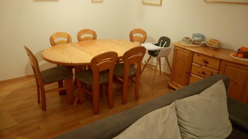 Der kombinierte Wohn- und Essbereich ist hell und komfortabel möbliert. Sie verfügen über eine Sofaecke mit TV-Gerät und DVD-Player, einen Multifunktionsdrucker und einen großzügigen Esstisch, an dem bequem 6 Personen Platz finden. Hier befindet sich außerdem der Zugang zum möblierten Balkon.