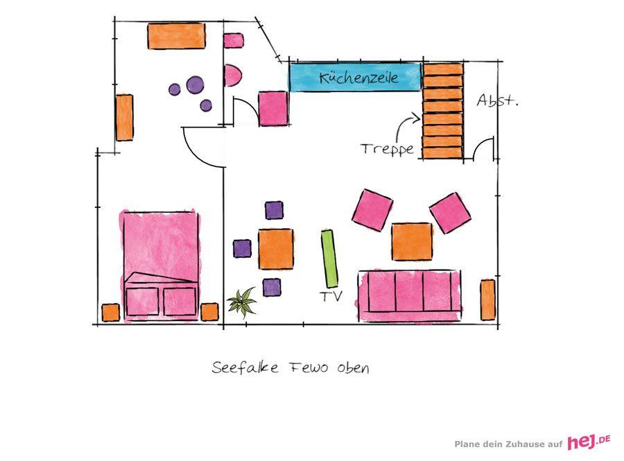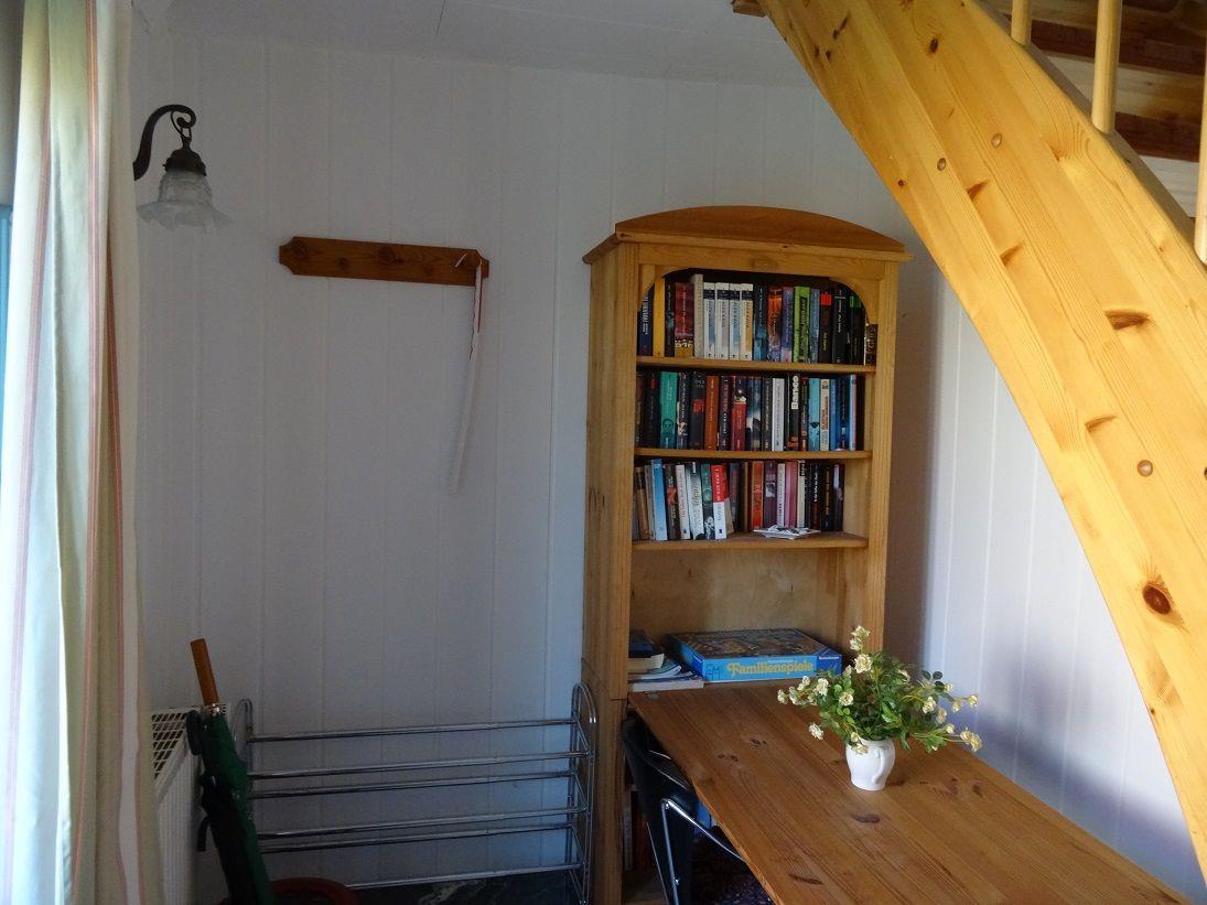 Der Eingangsbereich mit Garderobe und kleiner Büchersammlung befindet im Erdgeschoss, über eine Treppe gelangen Sie in die obere Etage der Wohnung. Hier erwartet Sie ein gemütlicher, offen gestalteter Wohn- und Essbereich mit integrierter Küche. In der Sofaecke mit TV-Gerät verbringen Sie gemütliche Stunden und können ganz nach Belieben entspannen. Die Küche ist unter anderem mit einem Kühlschrank mit Gefrierfach, einer Mikrowelle, einem Herd mit Backofen, Kaffeemaschine und Wasserkocher ausgestattet und bietet Ihnen gute Möglichkeiten sich selbst zu versorgen.