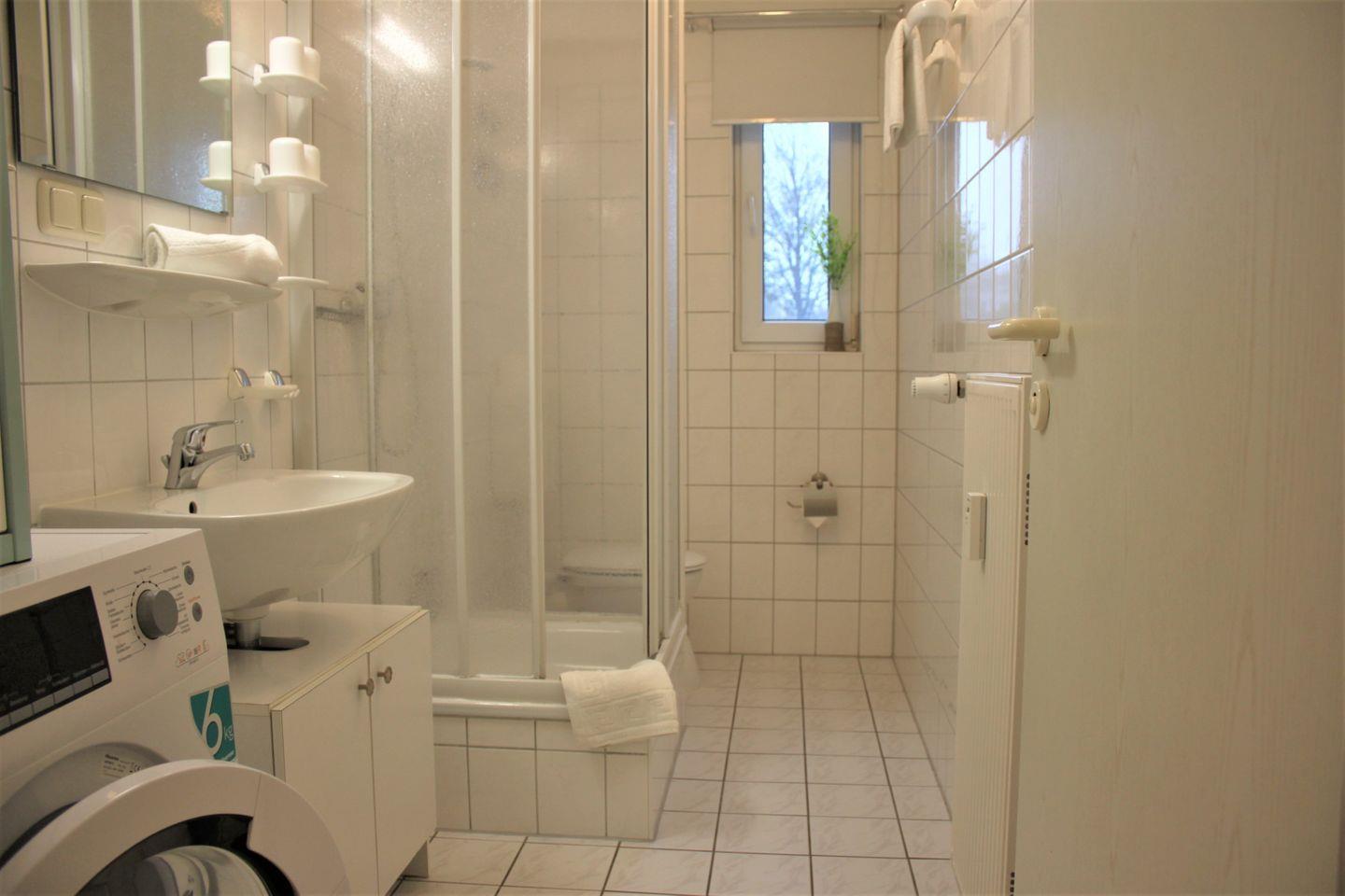 Im Badezimmer mit Fenster stehen Ihnen eine Dusche, Waschmaschine, Waschbecken und WC zur Verfügung.