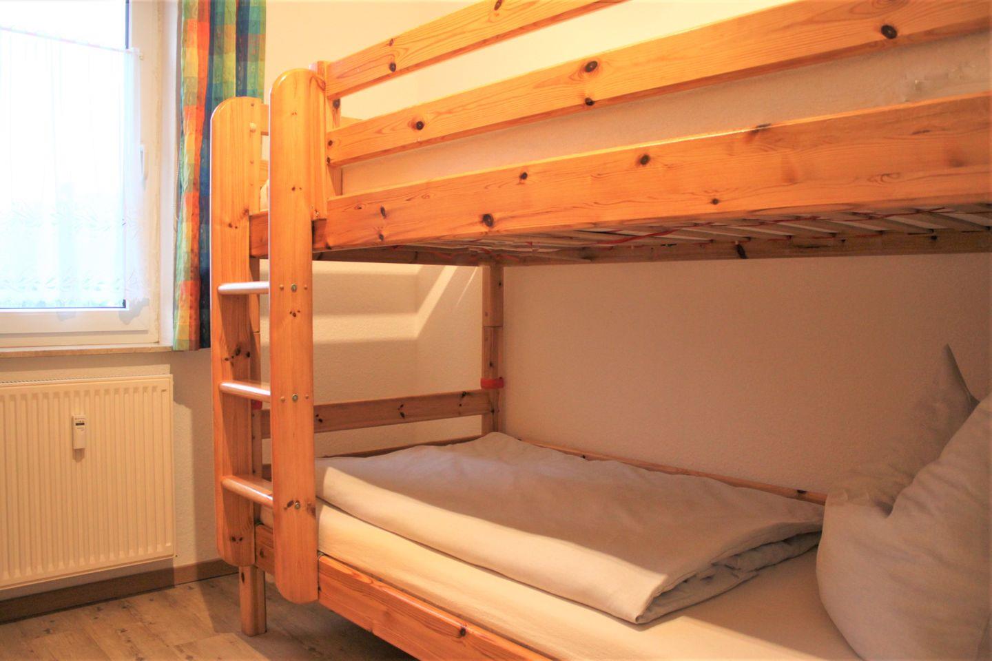 Die zwei separaten Schlafzimmer sind entweder mit einem komfortablen Doppelbett und Kleiderschrank oder einem Etagenbett und Kleiderschrank möbliert und ermöglichen erholsame Nächte.