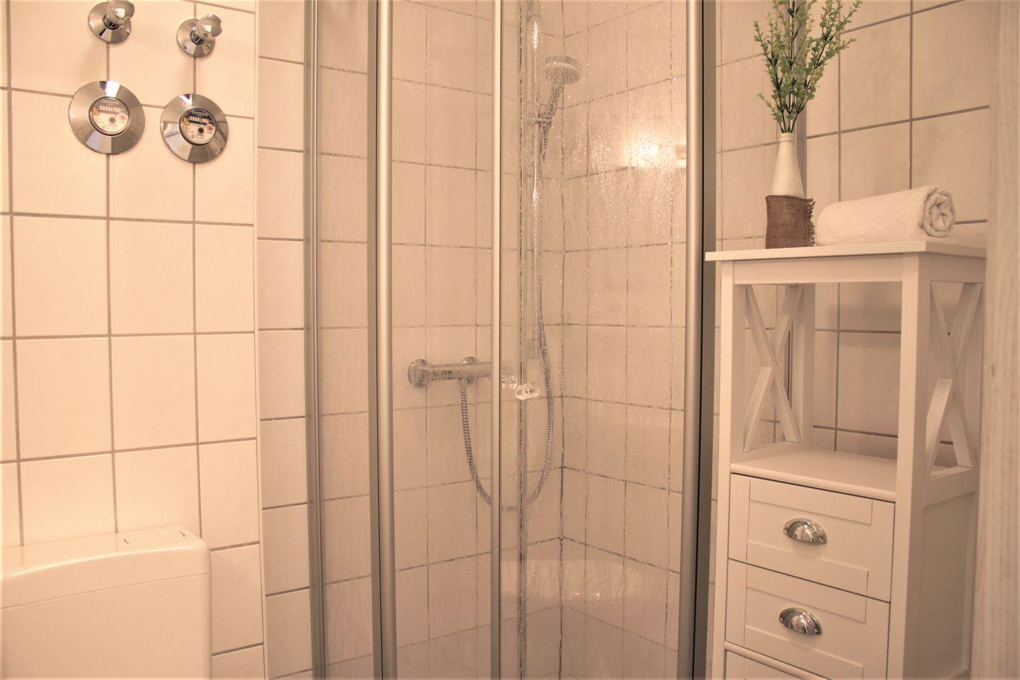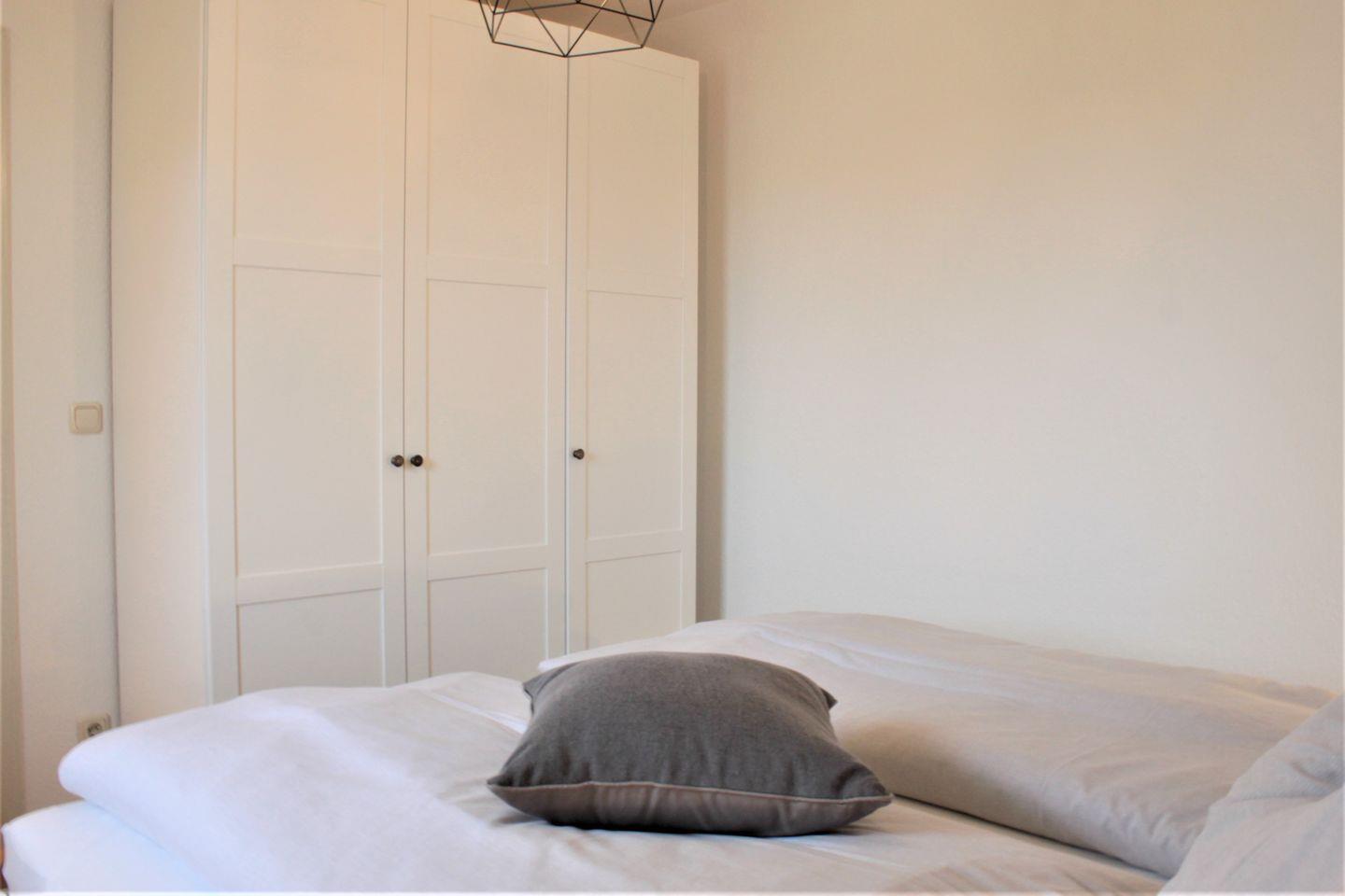 Das separate Schlafzimmer ist mit einem Doppelbett und einem Kleiderschrank möbliert und ermöglicht erholsame Nächte. Im Badezimmer befindet sich eine Dusche, ein Waschtisch, WC und Ablagefläche.