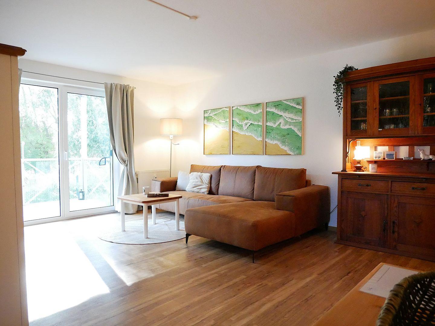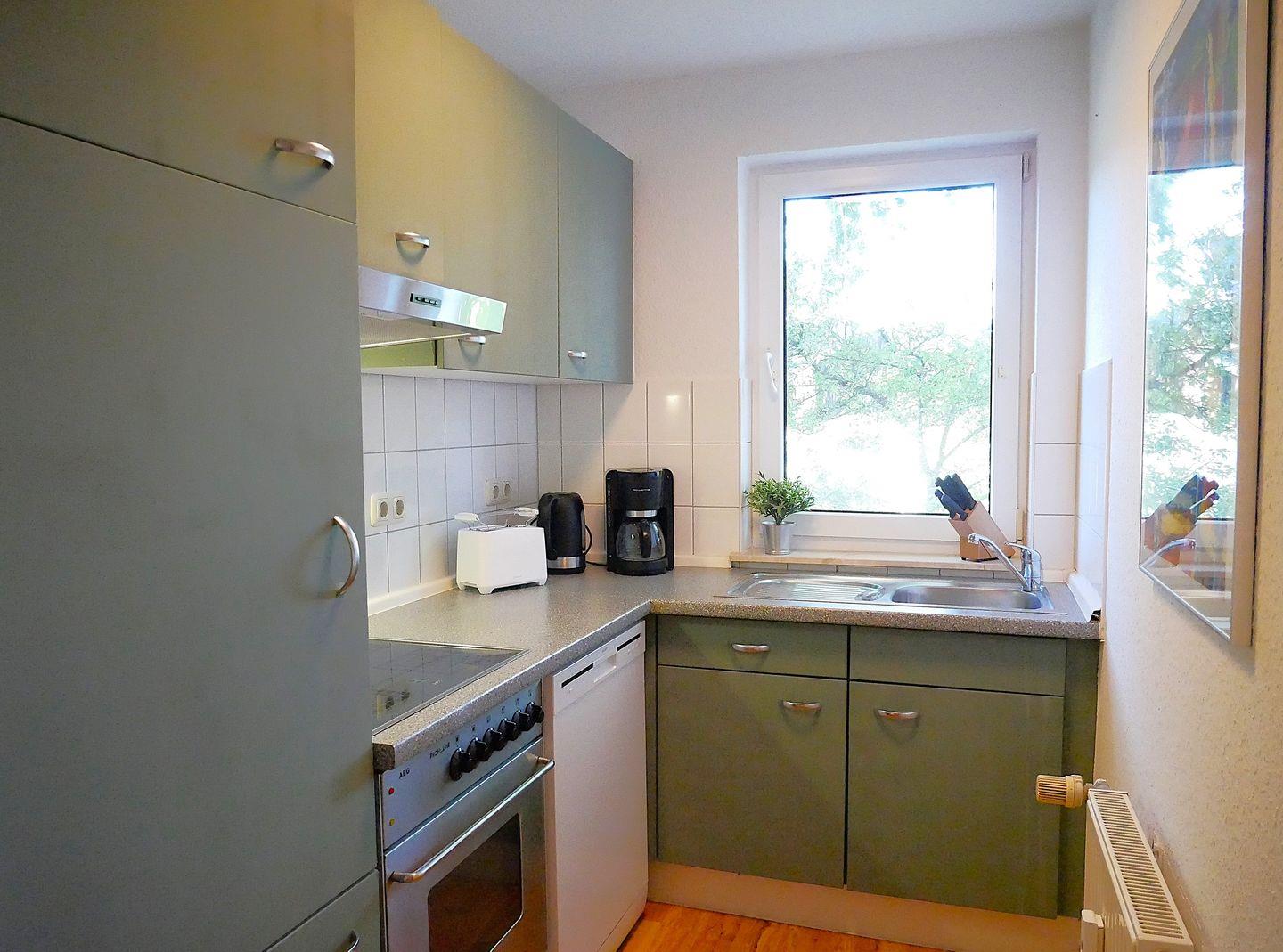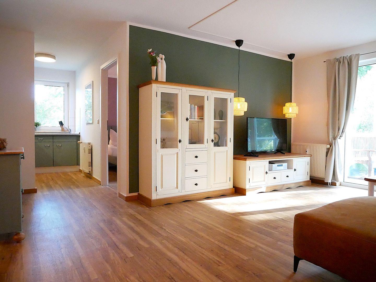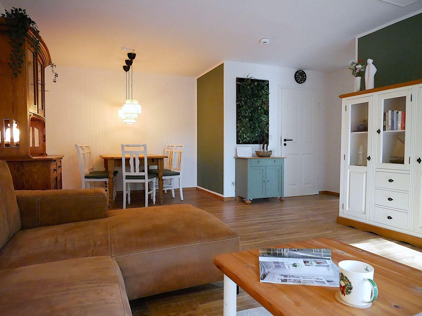 Das kombinierte Wohn- und Esszimmer ist großzügig mit einer Sofaecke, TV-Gerät, WLAN und Essbereich ausgestattet und lädt zum Verweilen und Erholen ein. Die kleine Küche bietet Ihnen viele Annehmlichkeiten und eine gute Ausstattung zur entspannten Selbstversorgung.