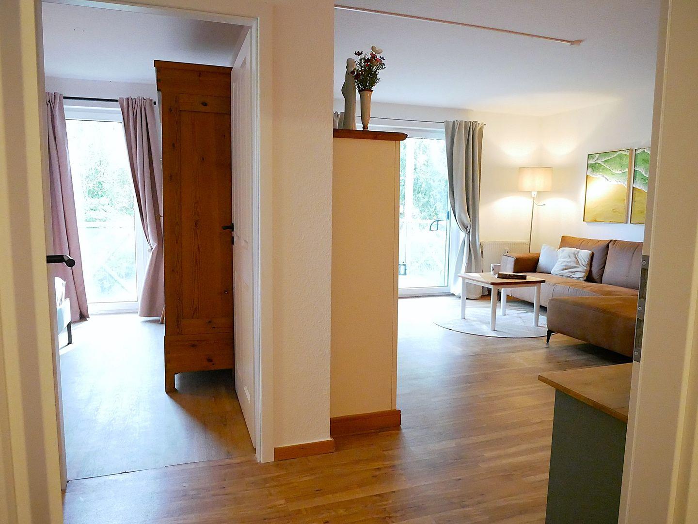 Die Wohnung verfügt außerdem über zwei separate Schlafzimmer, die entweder mit einem Doppelbett oder zwei Einzelbetten eingerichtet sind. An genügend Stauraum für Ihre Garderobe wurde außerdem gedacht.