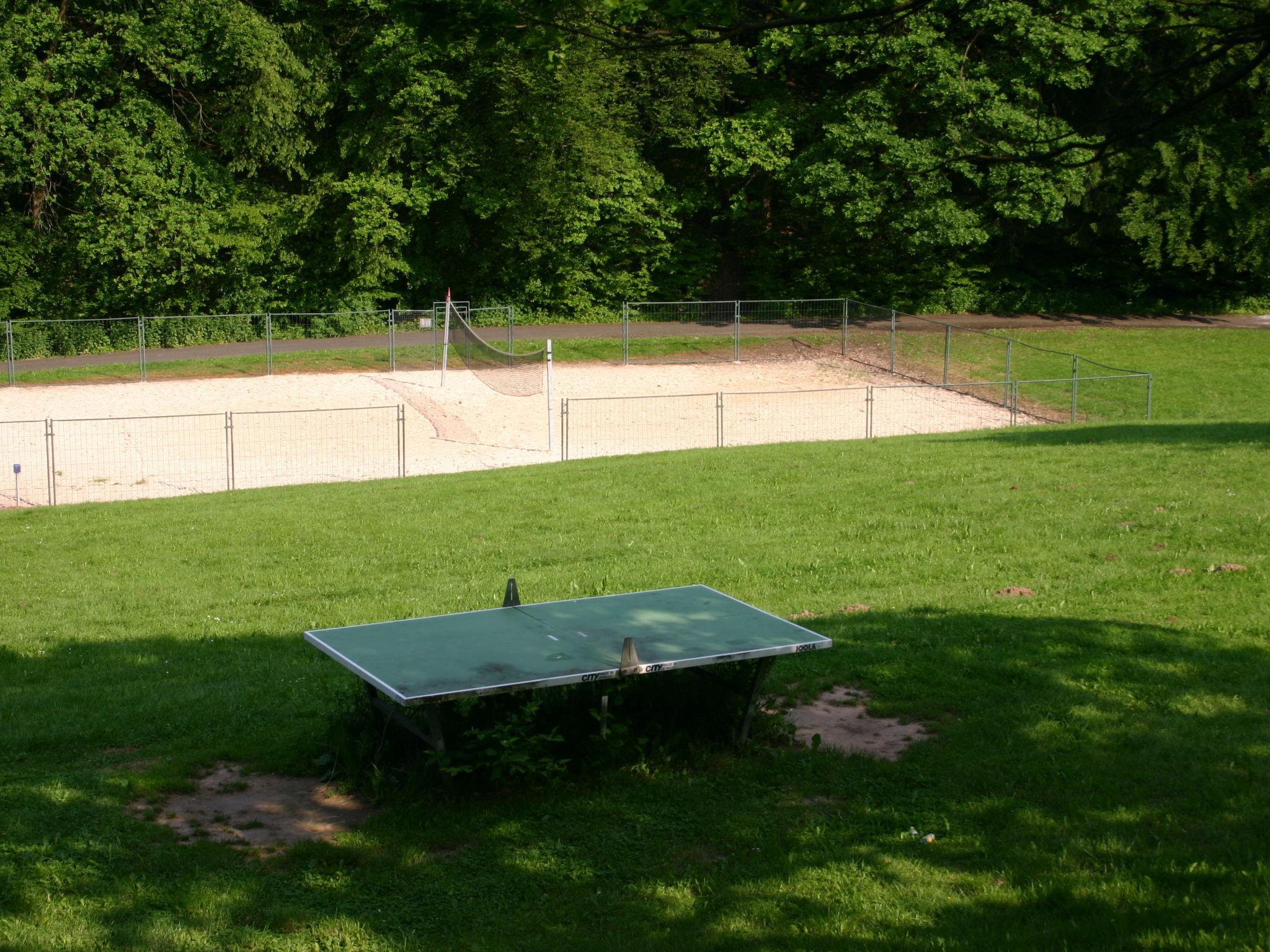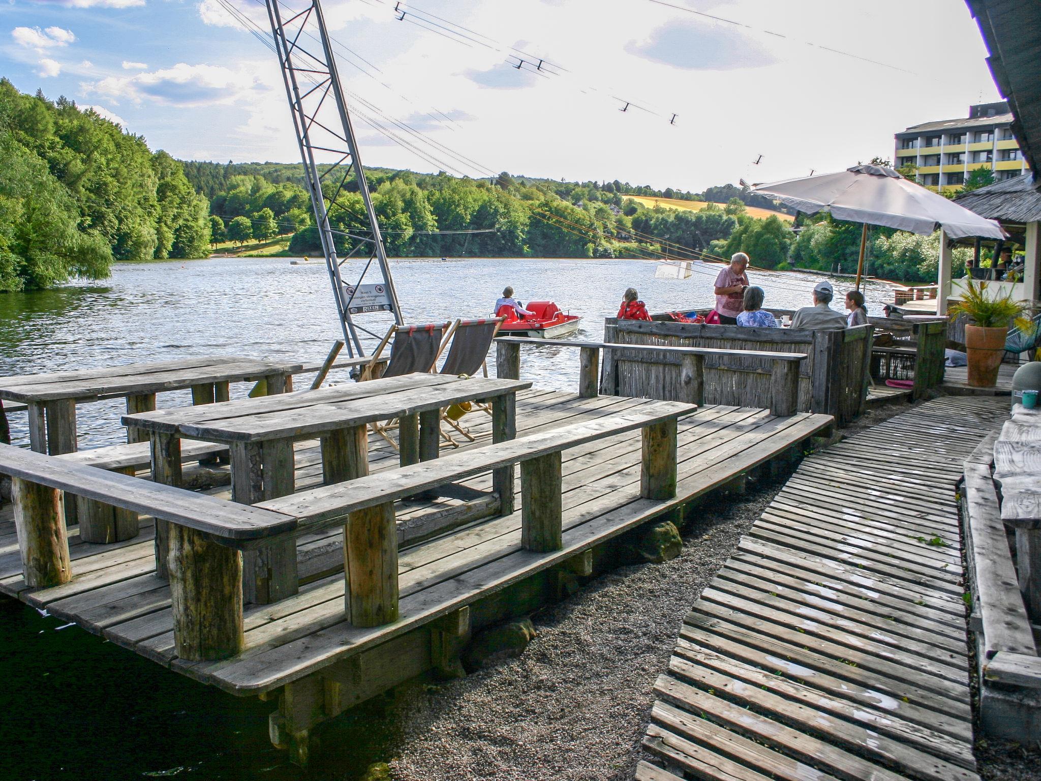 Holiday village "Seepark Kirchheim". Outside the resort, 4 km from the centre of Kirchheim, in a quiet, sunny position on a slope, on the lake, in the countryside. Public parking on the road. Shop 4 km, supermarket 4 km, shopping centre 4 km, bakery 4 km, café 400 m, bus stop 400 m, railway station "Bad Hersfeld" 15 km, outdoor swimming pool 4 km, thermal baths 15 km. Golf course (18 hole) 4 km, tennis 10 km, minigolf 15 km, walking paths from the house 300 m. Well-known lakes can easily be reached: Stausee 500 m. Please note: car recommended. The owner does not accept any youth groups. The Seepark is divided into four “villages” with a total of 139 holiday homes, which are grouped around the reservoir (10 hectares of water, bathing, water skiing, sunbathing area). Route around lake is ideal for walking and jogging.
