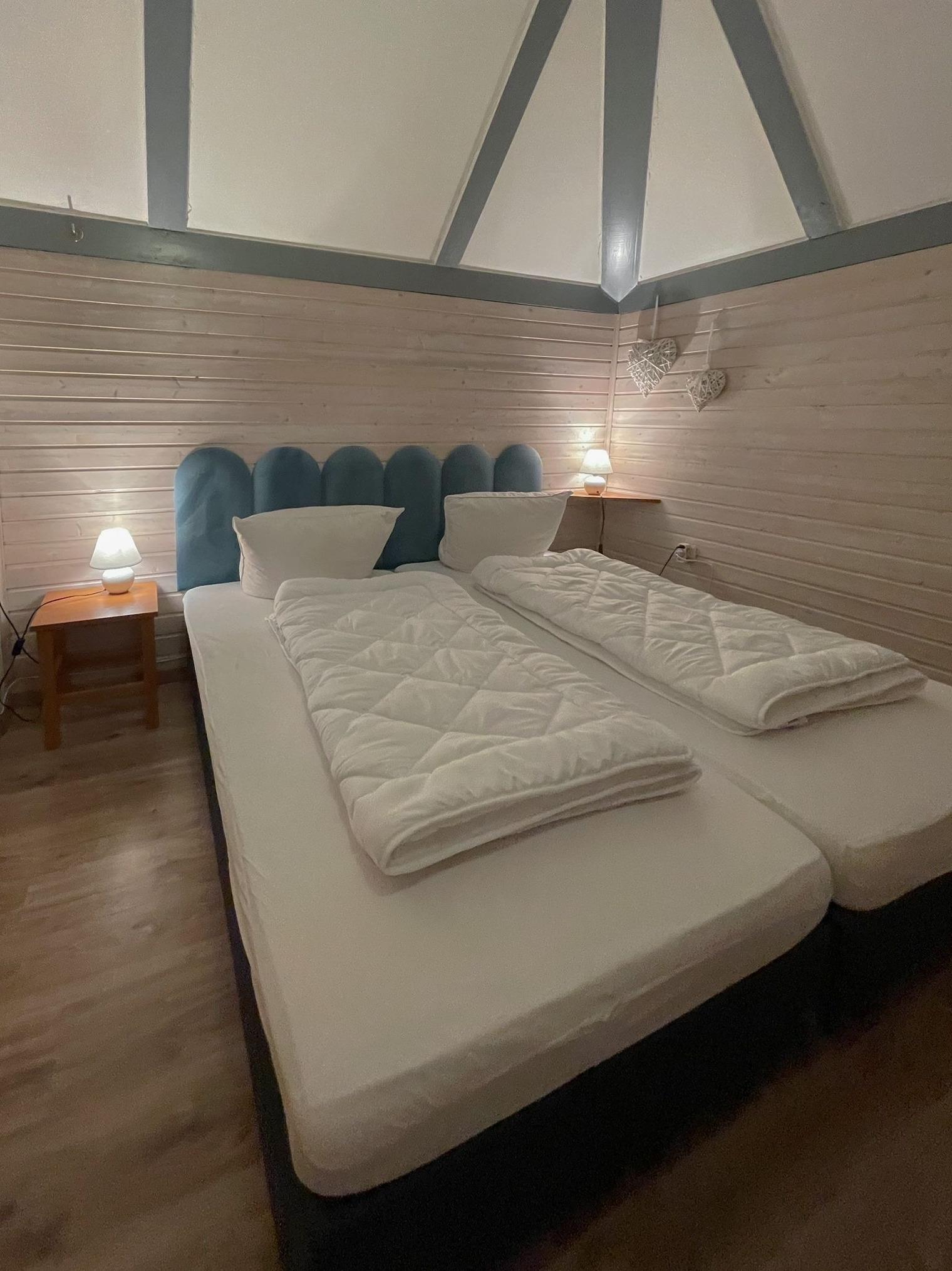 Im Obergeschoss liegen 2 weitere Schlafzimmer, das eine mit 2 Einzelbetten (zusammen gelegt - 1 Doppelbett), das andere mit 2 separaten Einzelbetten. Darüber hinaus lädt im Obergeschoß ein großer Balkon zum Entspannen ein und darunter im Erdgeschoß eine schöne Terrasse. Beide Schlafzimmer im DG verfügen je über einen eigenen Balkonzugang (Süden). Von hieraus können Sie die Blicke über den gesamten Ferienpark schweifen lassen.