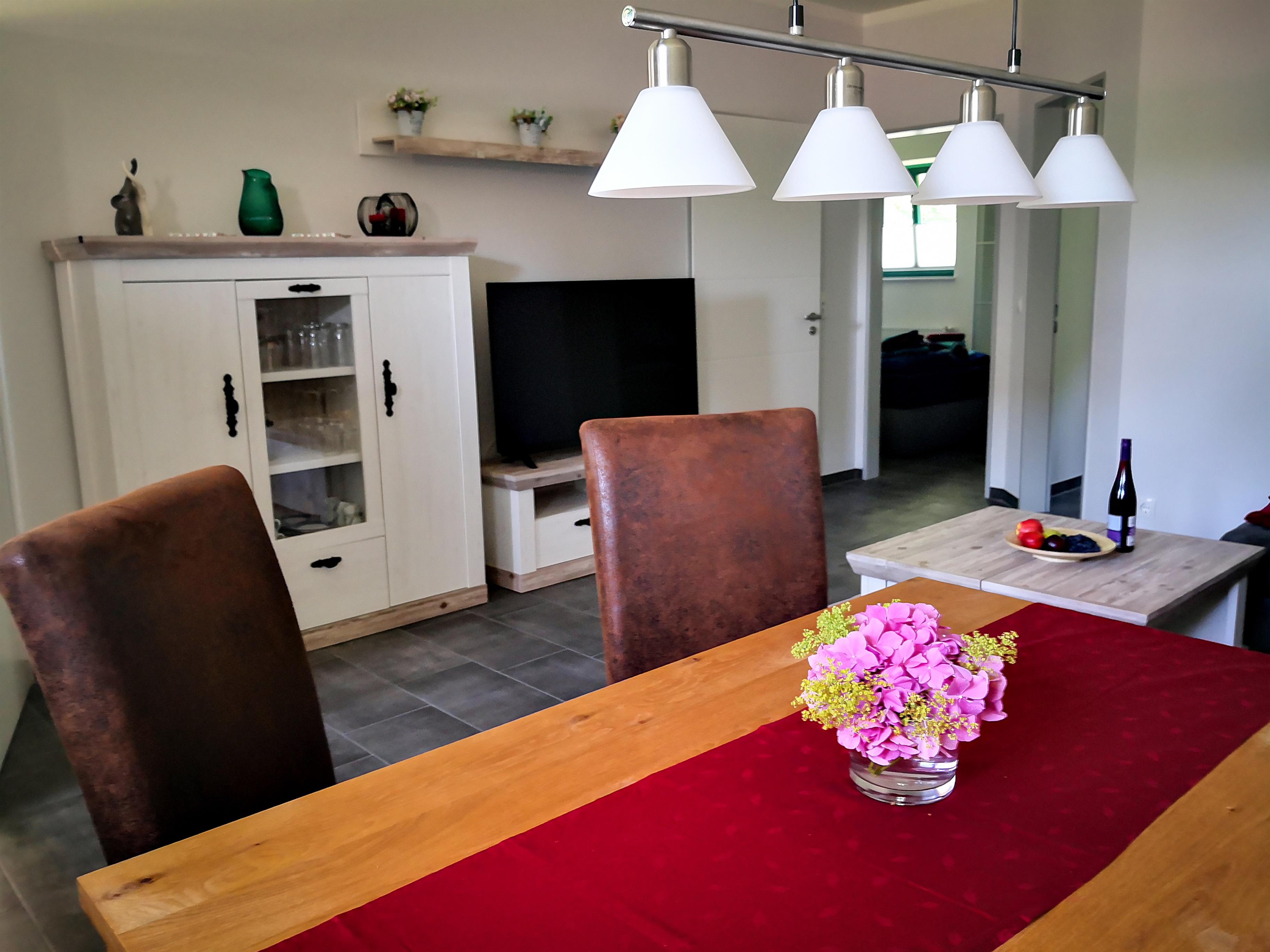 Die Ferienwohnung bietet einen großzügigen Wohn-Essbereich mit vollausgestatteter Küche (Spülmaschanie, 4-Platten-Ceranfeld, Backofen, Mikrowelle), zwei gemütliche Schlafzimmer mit Boxspringbetten, ein Bad mit ebenerdiger Dusche und eine eigene Terrasse.