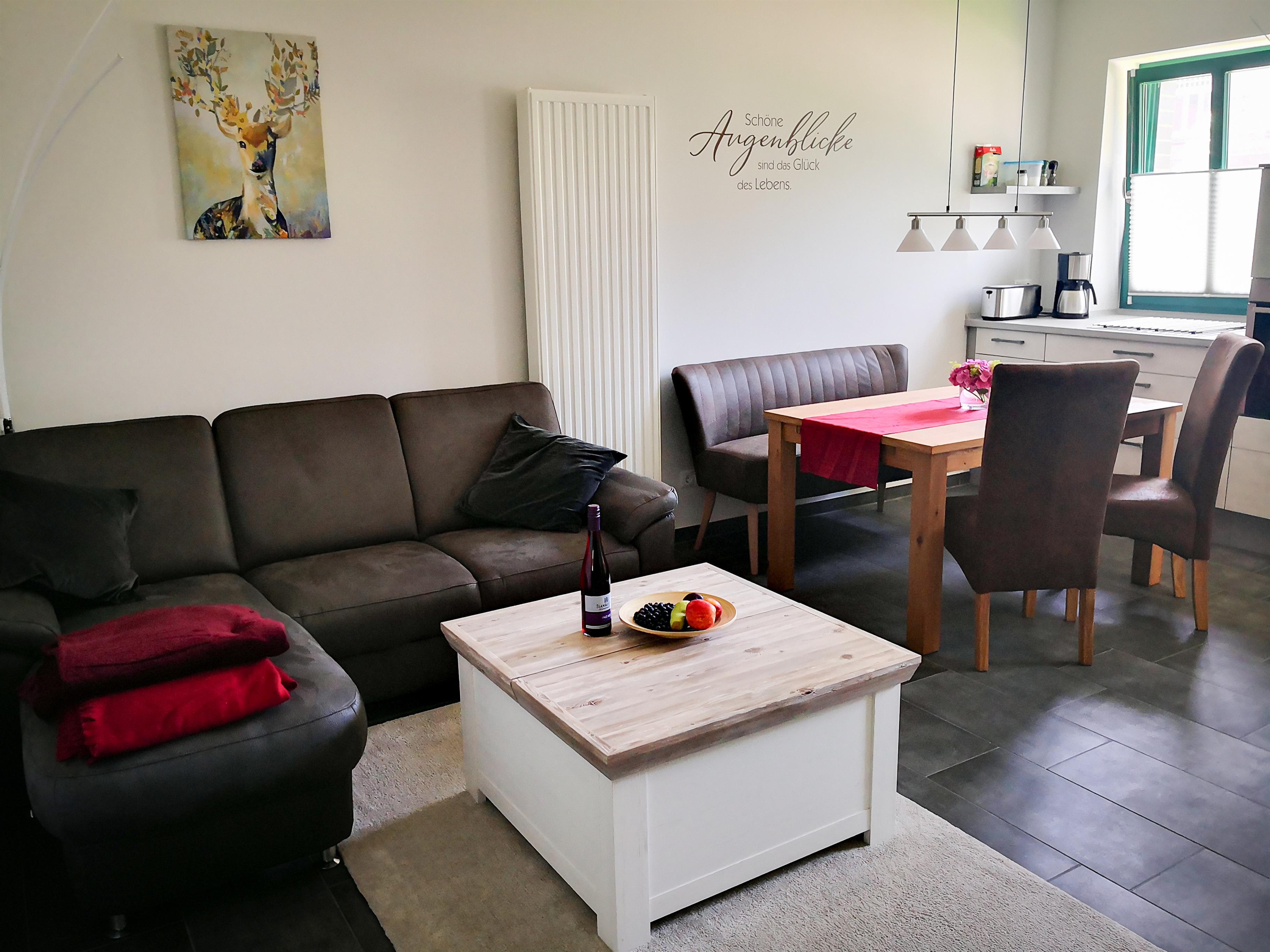 Die Ferienwohnung bietet einen großzügigen Wohn-Essbereich mit vollausgestatteter Küche (Spülmaschanie, 4-Platten-Ceranfeld, Backofen, Mikrowelle), zwei gemütliche Schlafzimmer mit Boxspringbetten, ein Bad mit ebenerdiger Dusche und eine eigene Terrasse.